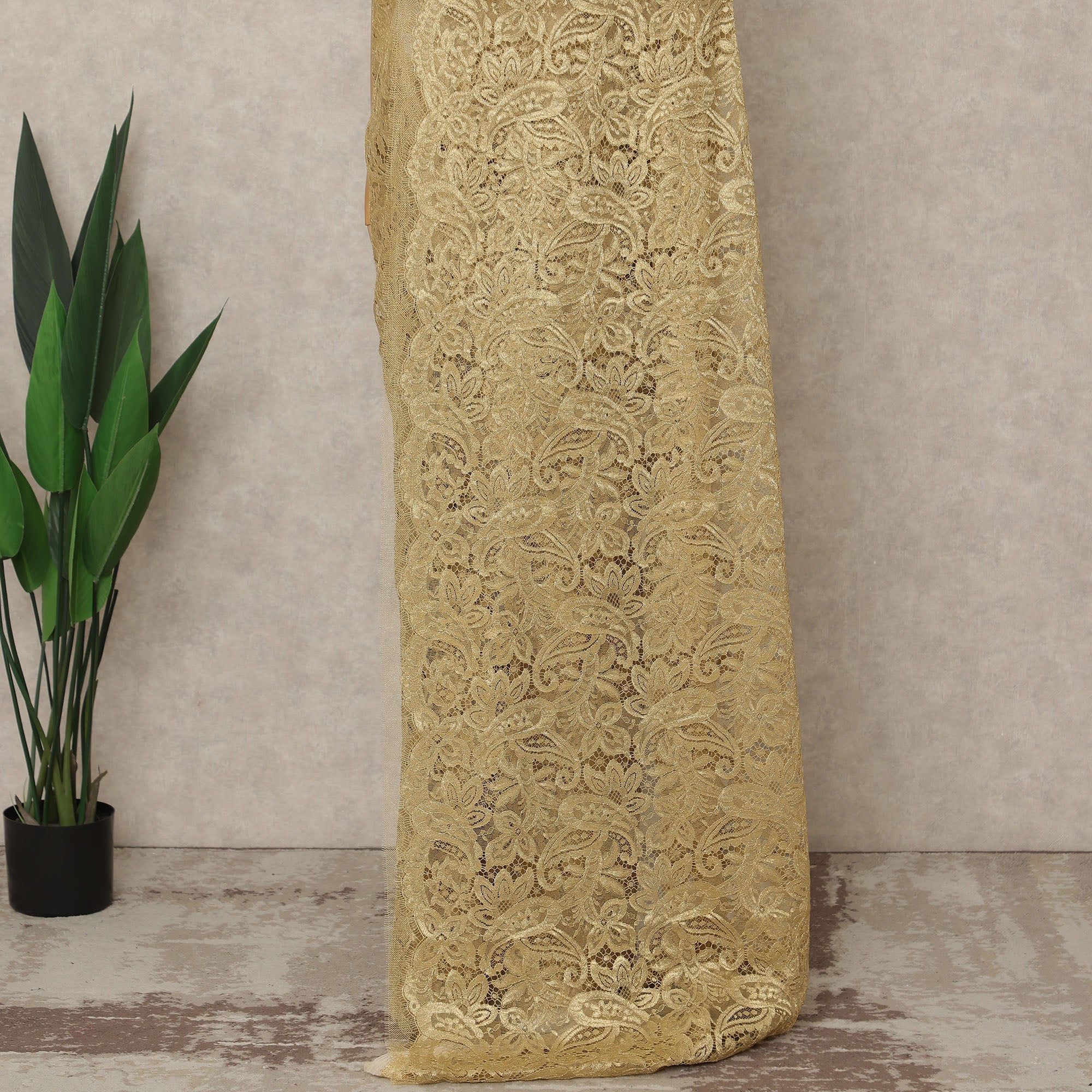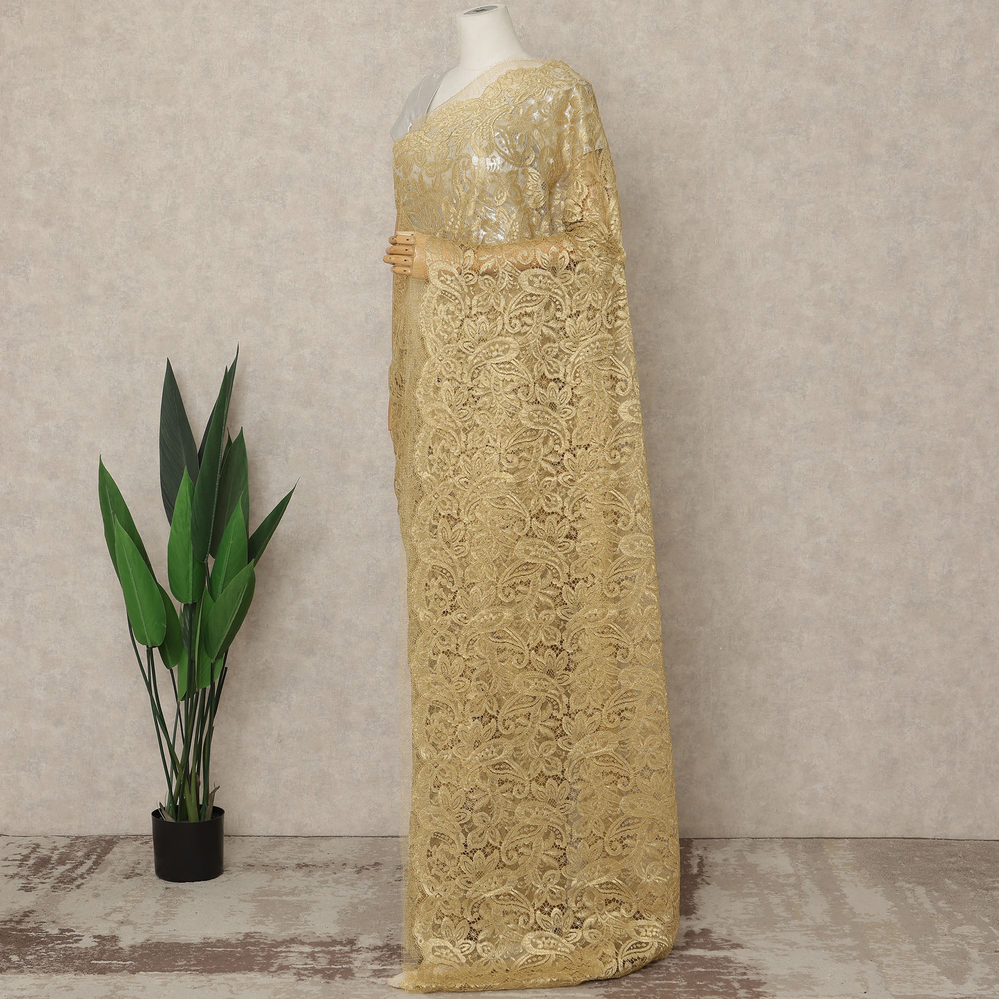 This Gold Premium French Metallic Chantilly Saree Lace showcases a luxurious golden sheen intricately woven into refined Chantilly patterns, offering a rich interplay of metallic luminosity and delicate transparency that elevates the saree’s overall drape with couture brilliance; crafted in France with exceptional craftsmanship, this approximately 5.5-meter piece features a soft, lightweight texture that flows gracefully, making it ideal for bridal couture, festive ensembles, high-fashion sarees, and statement designer creations, ensuring timeless elegance, regal appeal, and superior detailing—blouse not included.