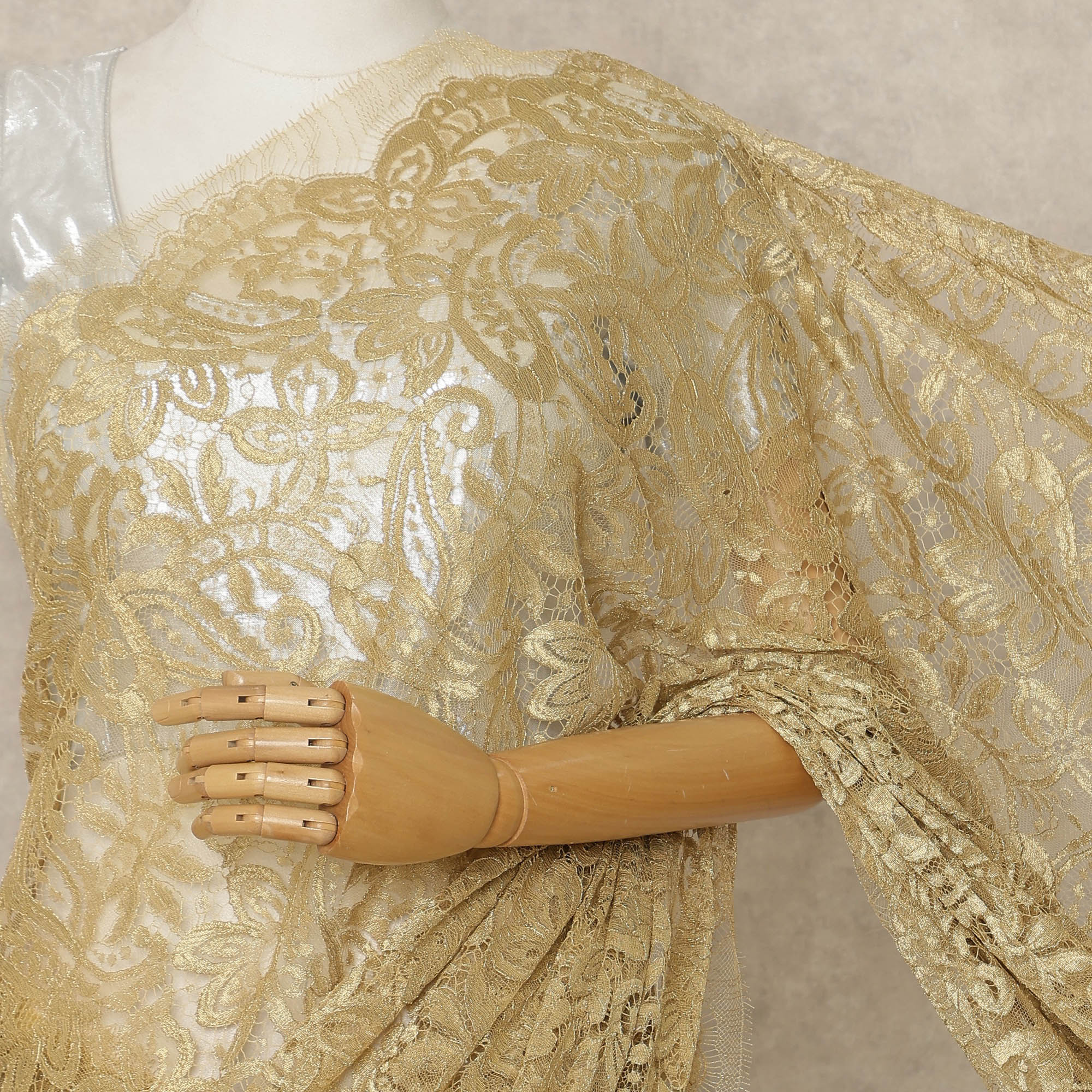 Luxurious gold metallic Chantilly lace crafted in France.