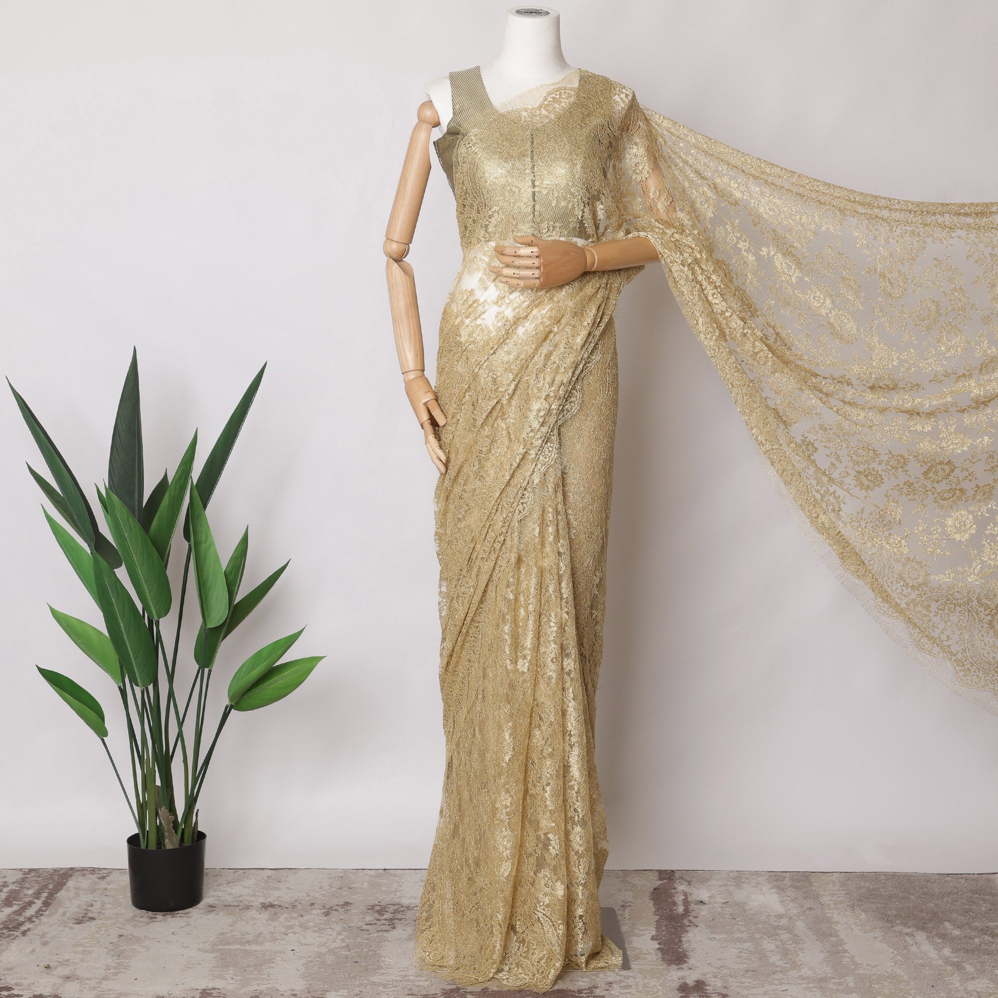 Add timeless elegance to your wardrobe with this gold French metallic Chantilly saree lace fabric, a luxurious creation imported from France. Featuring intricate floral patterns and a rich metallic finish, this fabric exudes grandeur and sophistication. With a generous width of 110 cm and a length of 5.5 meters, it is perfect for designing opulent sarees, gowns, and other couture outfits. The lightweight and sheer texture ensure a graceful drape, making it ideal for weddings, parties, and special occasions. Please note: the blouse shown is for display purposes only and is not included.