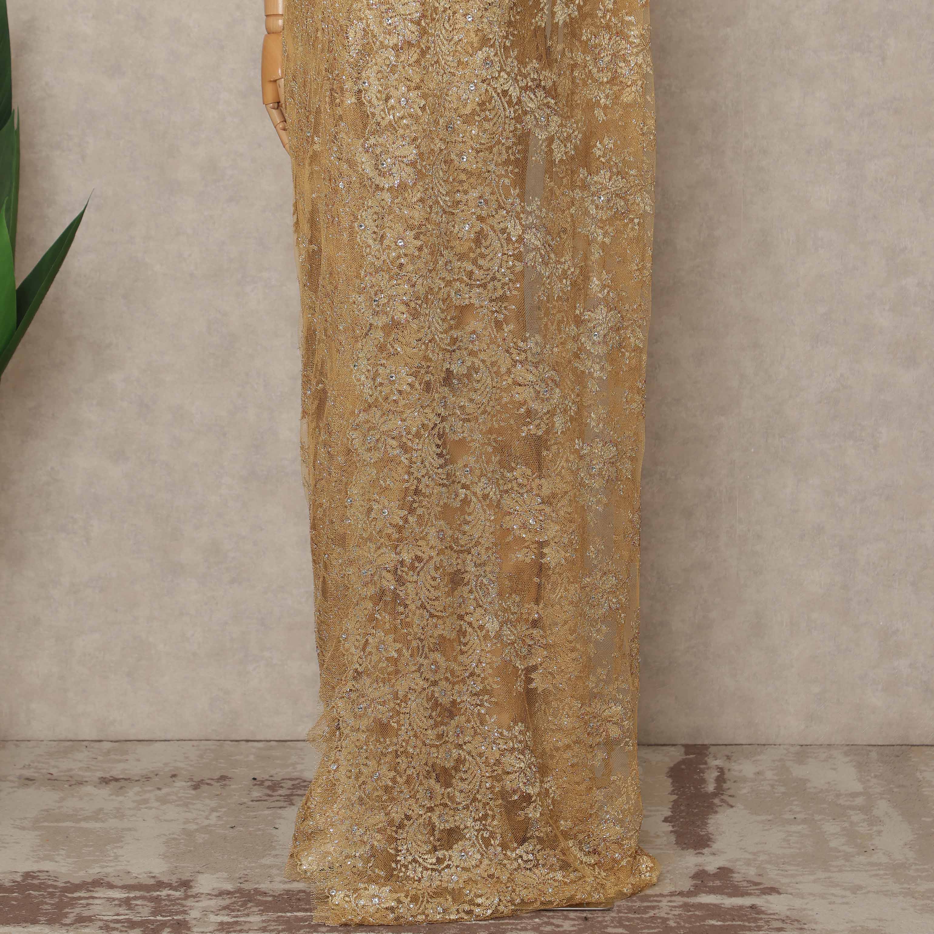 Gold Premium French Metallic Chantilly Saree Lace With Stone Work 5.5 Mtrs Length 110 Cms Width Designer Net Fabric Made In France, Blouse Not Included-D28136
