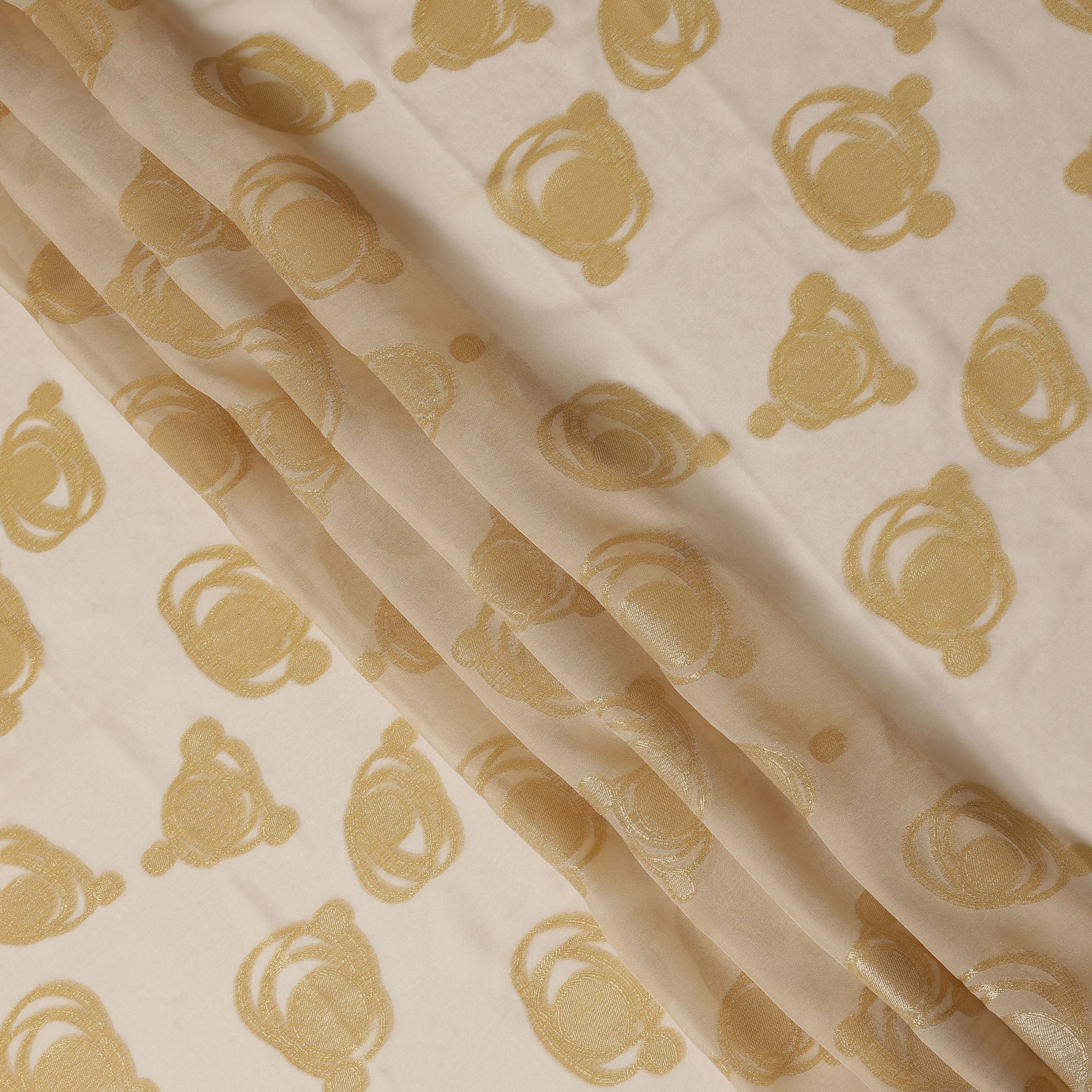 Gold pure silk chiffon fabric with metallic lurex swirl design for a luxurious shimmer