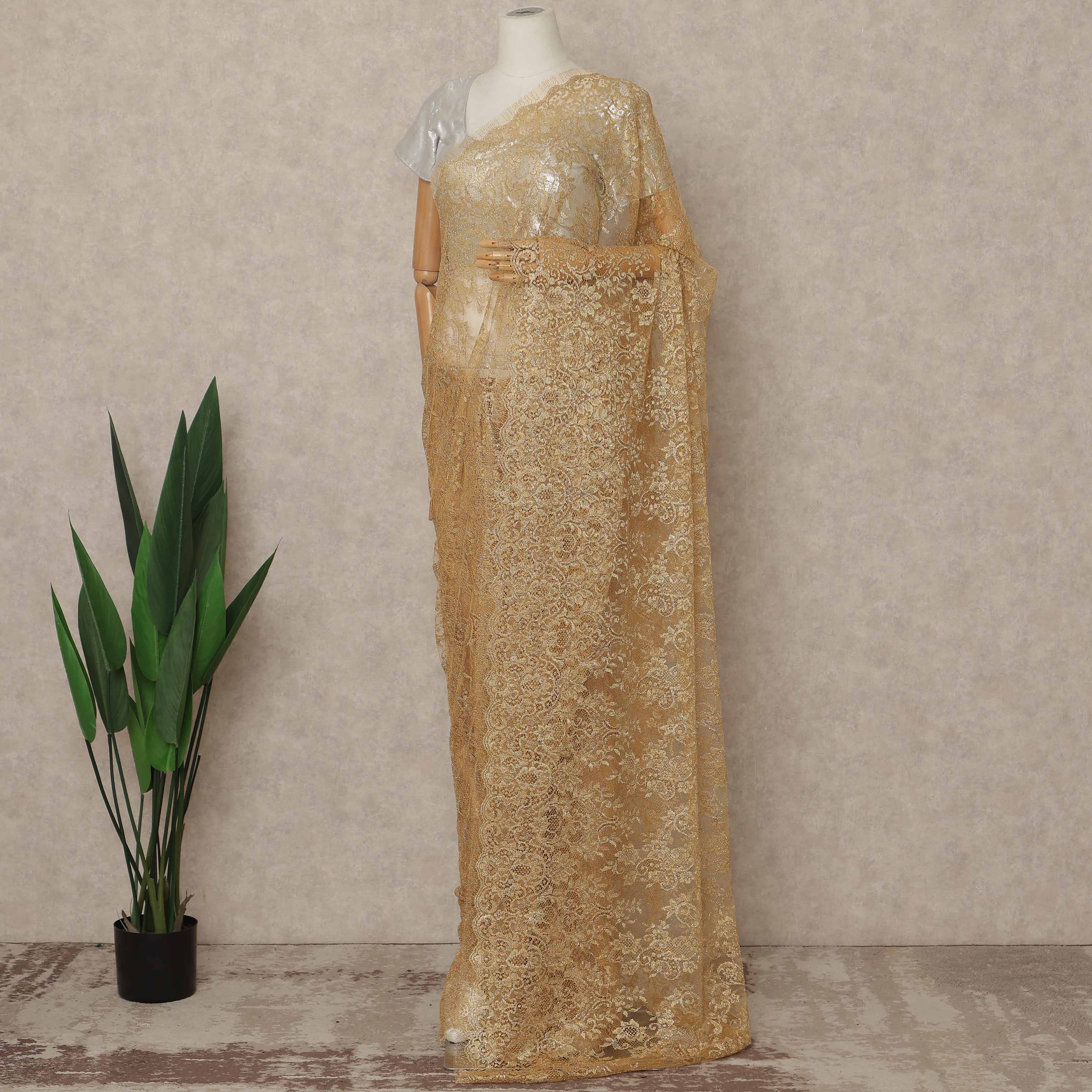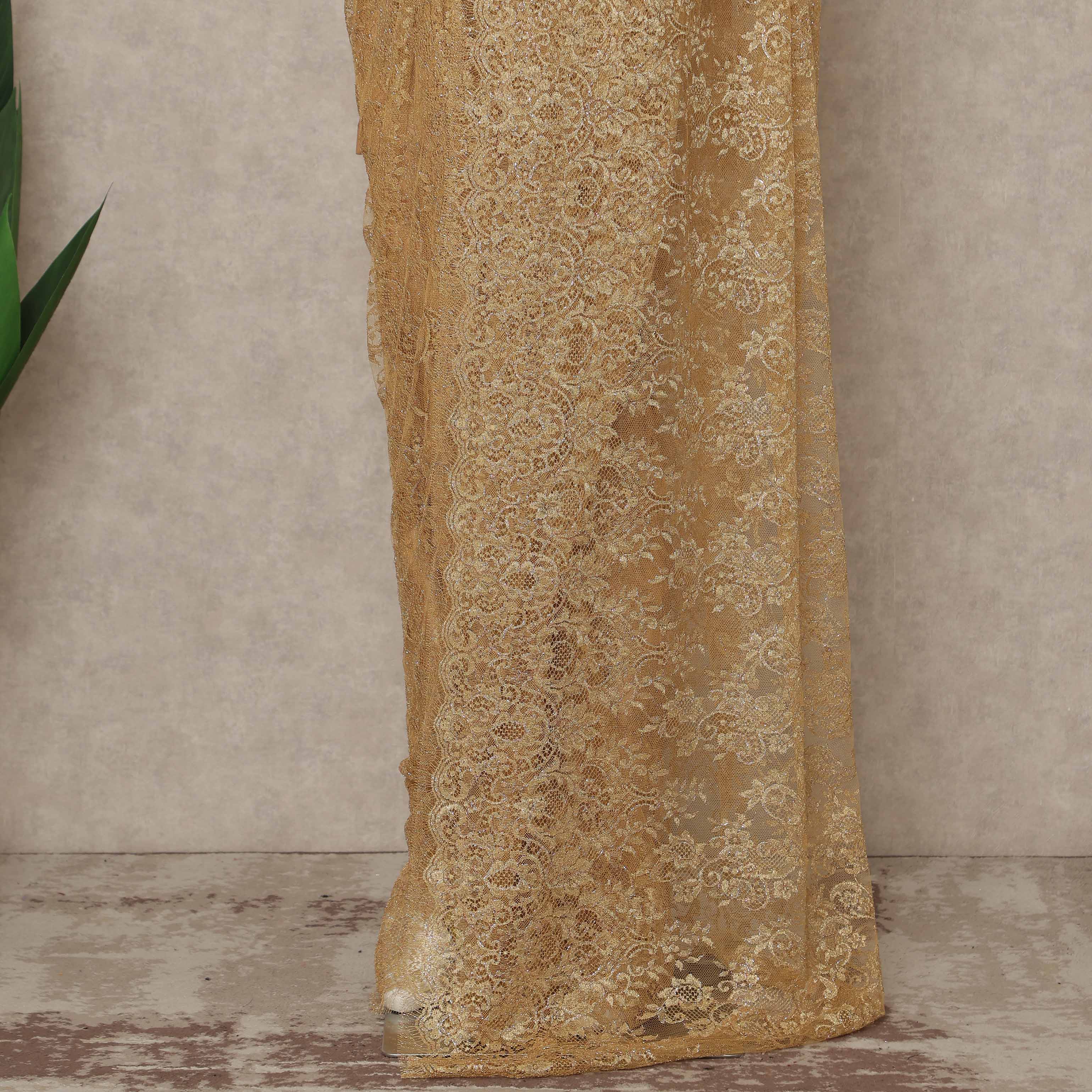 Golden Beige Premium French Metallic Chantilly Saree Lace 5.5 Mtrs Length 110 Cms Width Designer Net Fabric Made In France, Blouse Not Included-D28123