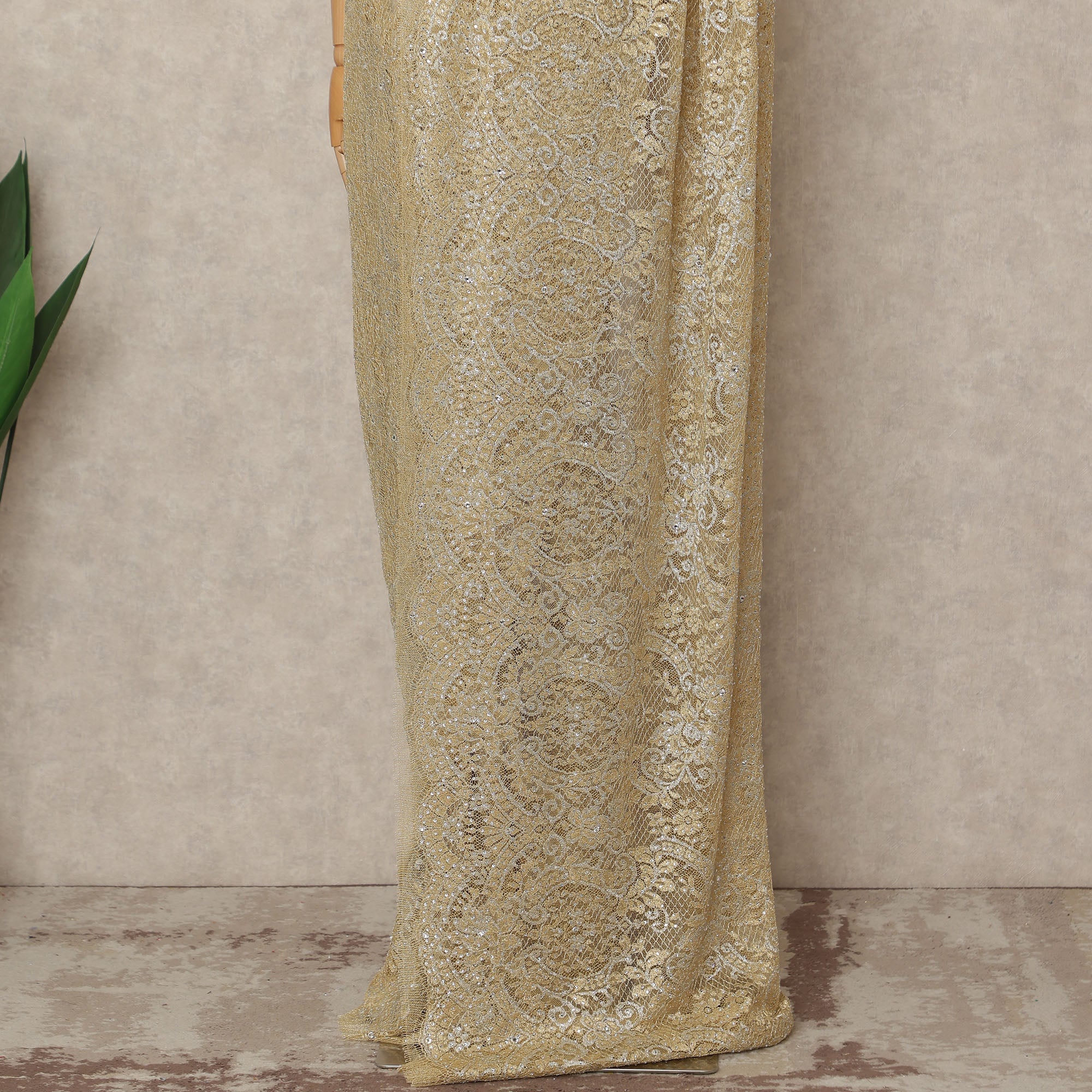 Golden Beige Premium French Metallic Chantilly Saree Lace With Stonework 5.5 Mtrs 110 Cms Width France-D27780