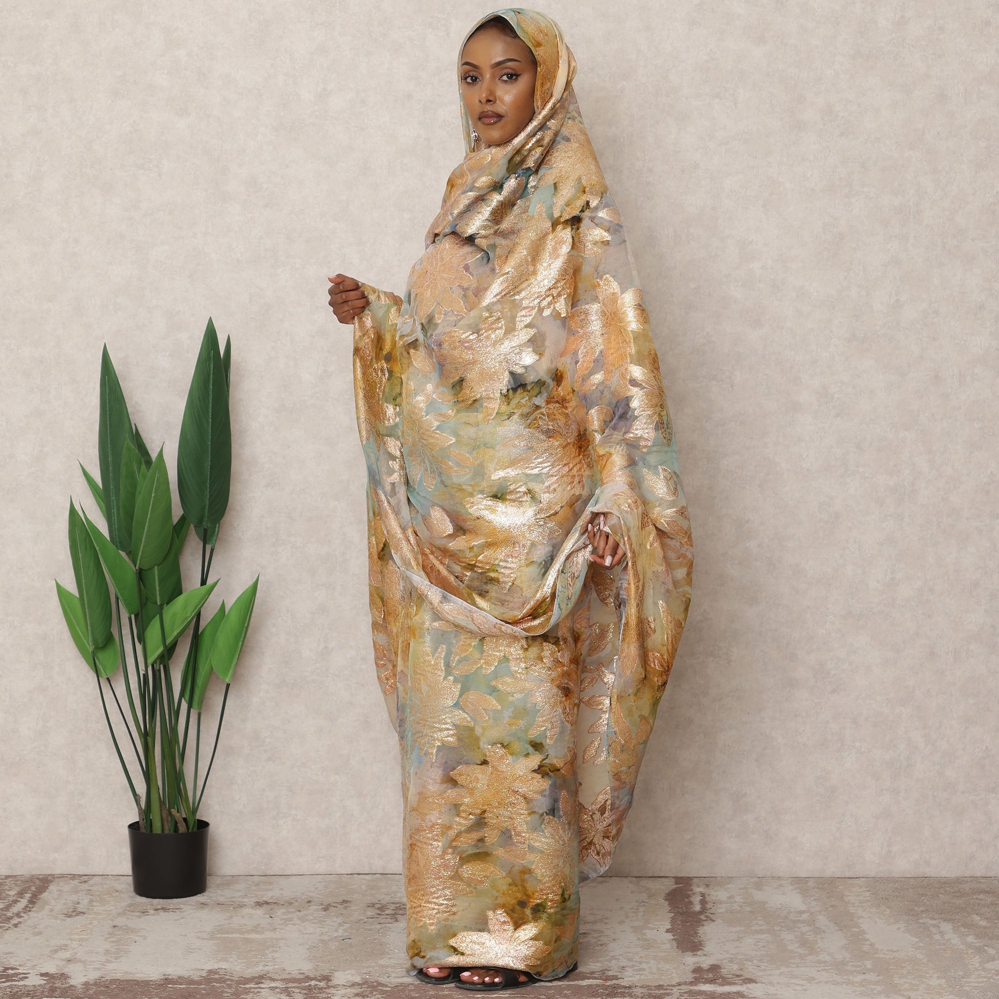 Unveil the richness of tradition with this golden beige Sudanese thobe made from exquisite pure silk chiffon and adorned with shimmering metallic lurex floral motifs. Crafted in South Korea, this premium fabric drapes effortlessly with a regal shine that flatters every silhouette. Measuring 4.5 meters in length and 140 cm in width, it provides generous coverage and graceful fall, making it ideal for weddings, festive occasions, or formal events. The blend of soft pastel tones and luminous gold patterns offers a perfect harmony of elegance and ethnic charm. Shop online today and bring timeless beauty to your ethnic collection with this premium silk thobe.