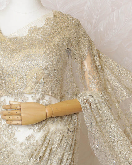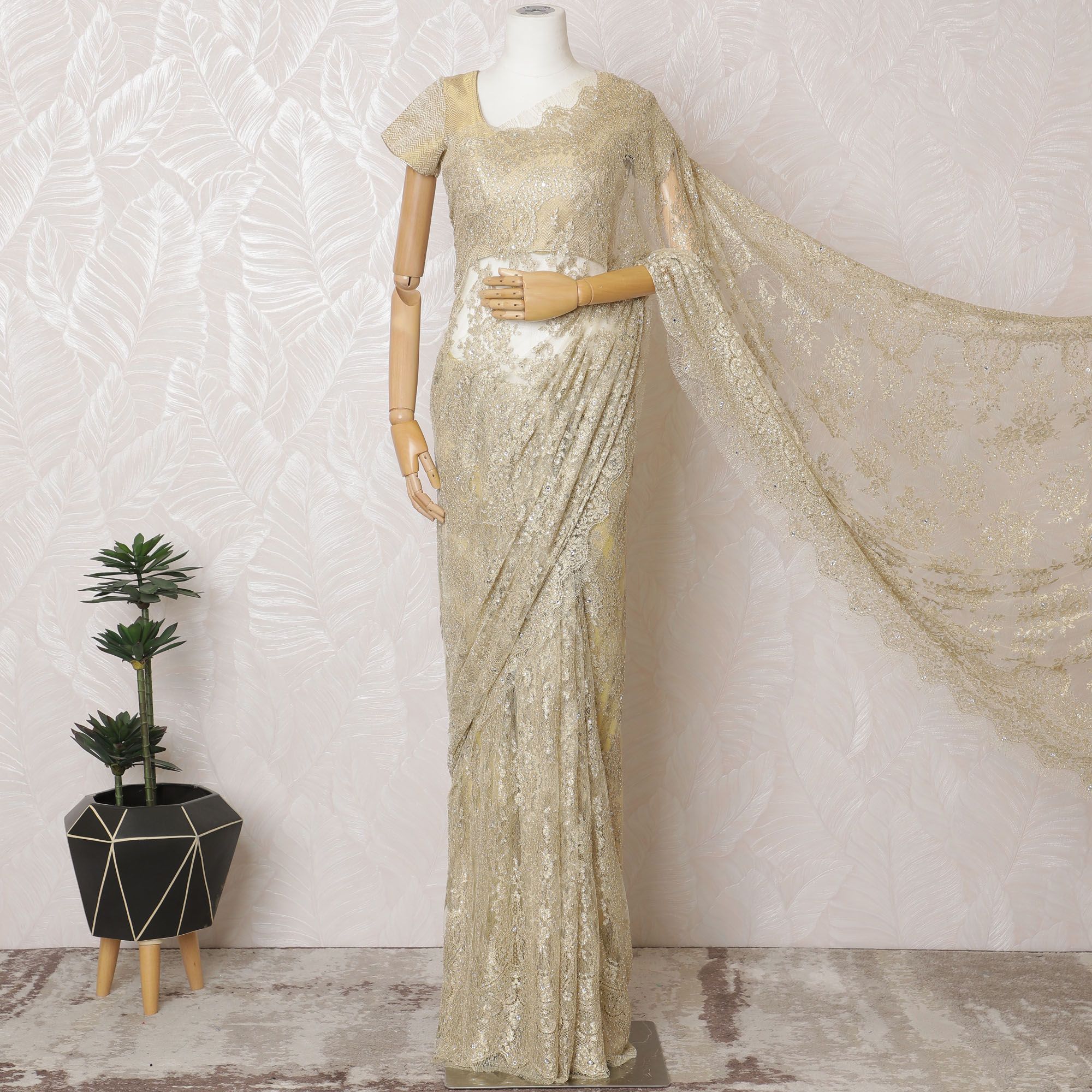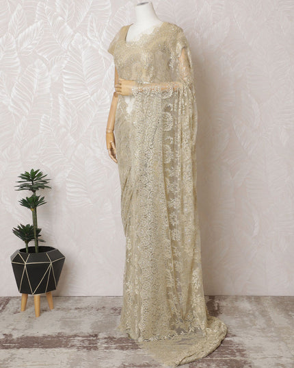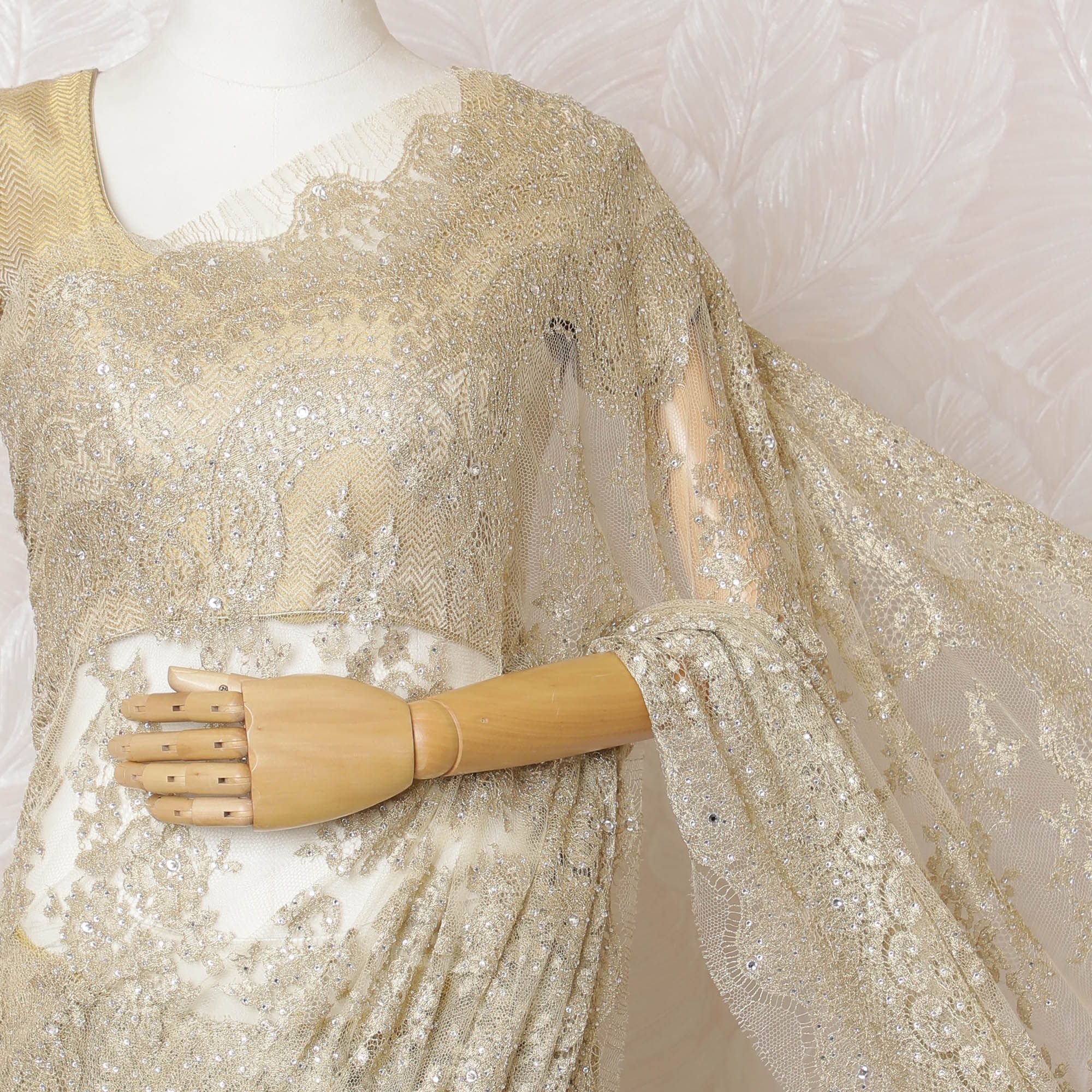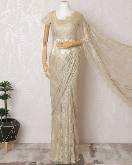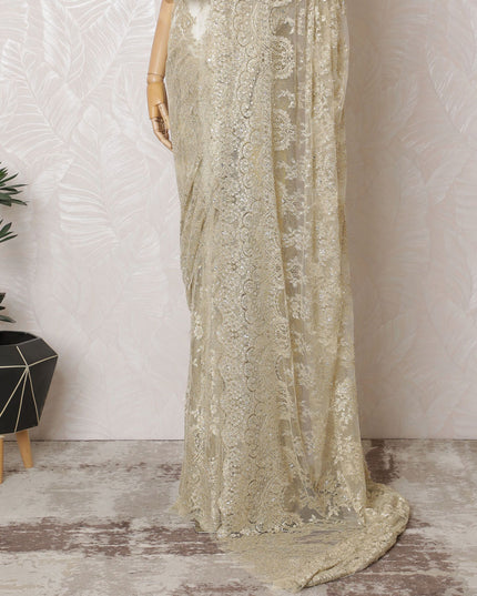 Unveil your inner glow with our Golden French Metallic Chantilly Lace Saree, a luxurious fabric spanning a length of 5.5 meters and a width of 110 cm. Each weave of this opulent saree is imbued with the splendor of France's rich textile heritage, featuring a gilded hue that captures the grandeur of festive celebrations and regal gatherings. The fabric is exquisitely detailed with handcrafted stone work, creating a dazzling display of light and elegance. The Chantilly lace is renowned for its feather-like touch and intricate patterns, ensuring that your saree isn't just a garment, but a piece of art. Please be advised, the saree comes without a blouse piece, inviting the creativity of personalization.