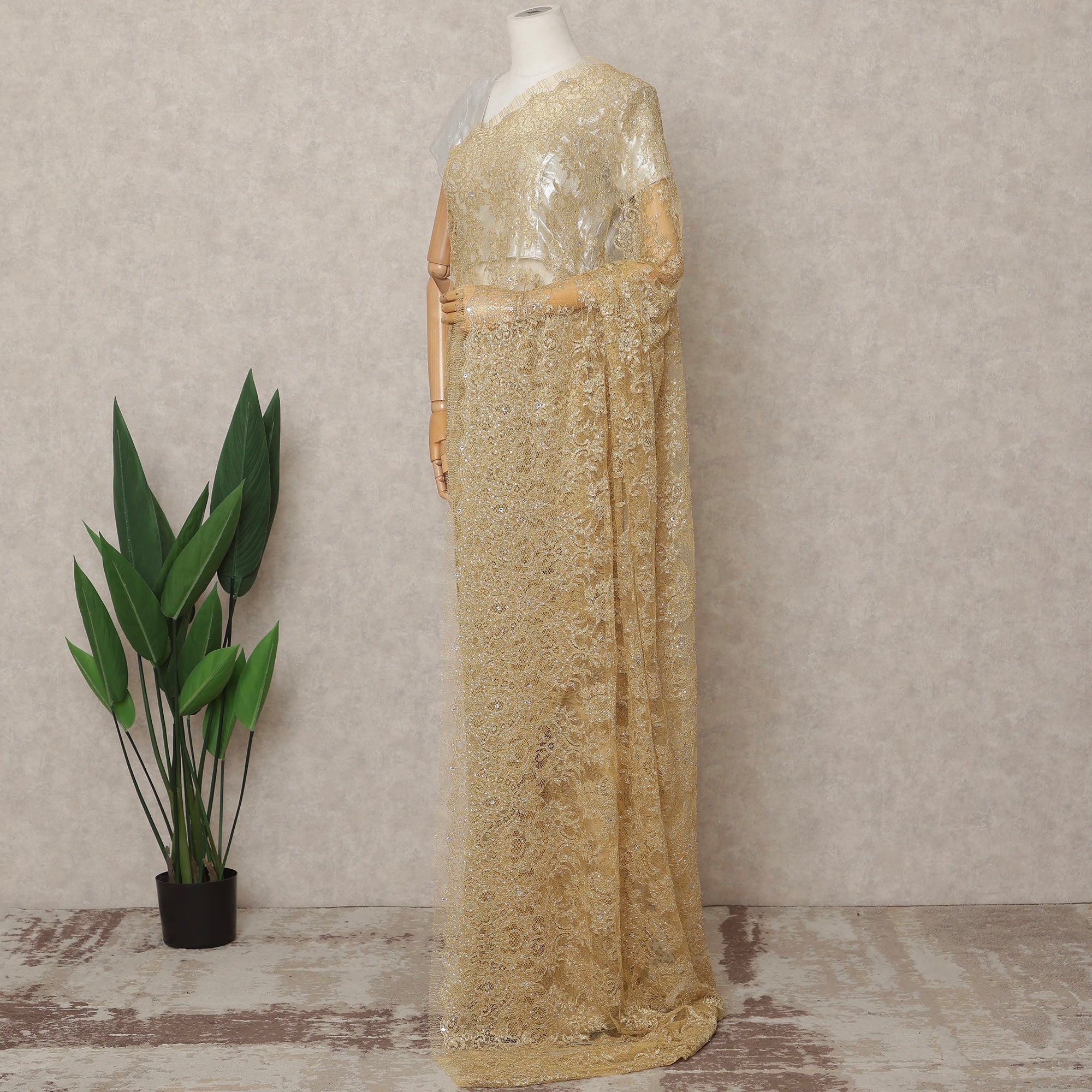 Golden Premium French Metallic Chantilly Lace Saree with Stone Work, Width 110 Cms, 5.5 Mtrs, France-D25590