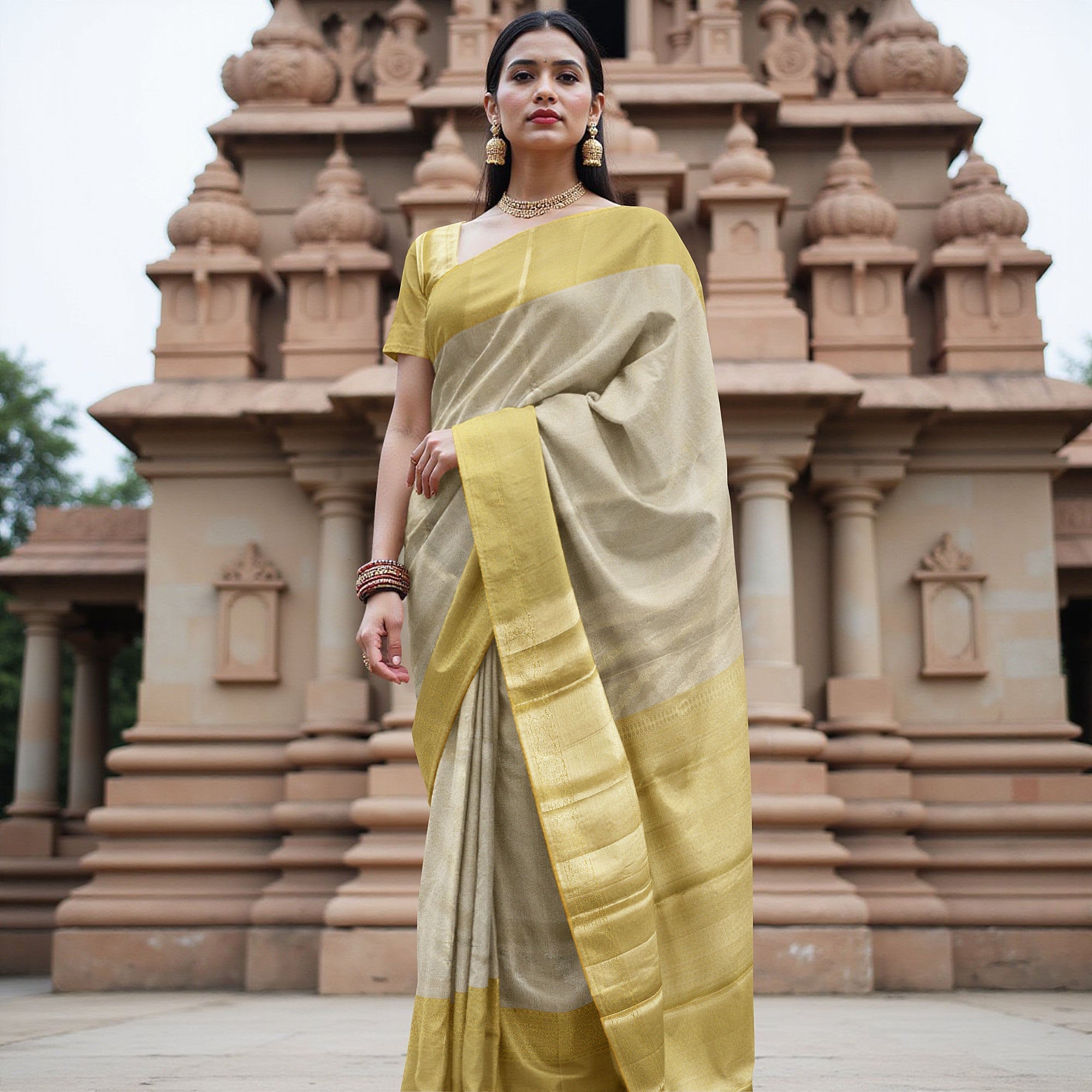 This Golden Yellow and Silver Pure Silk Kanjeevaram Saree is a statement in graceful simplicity, handwoven by skilled South Indian artisans over a meticulous 48-hour process. The body of the saree radiates a silken silver hue with understated striped textures, evoking the quiet elegance found in temple pillars and ancient South Indian scrollwork. The bold mustard yellow border anchors the design in tradition, finished with a lustrous golden zari that complements the subtle shimmer of the body. Crafted using premium Regal Fabrics silk, this saree is a refined piece meant for discerning occasions—from heritage celebrations to modern festivities. With its seamless blend of classic handloom craft and minimalist aesthetic, this saree is best experienced in person. Shop online to own a symbol of timeless woven beauty. Dry clean only to retain its brilliance and softness.