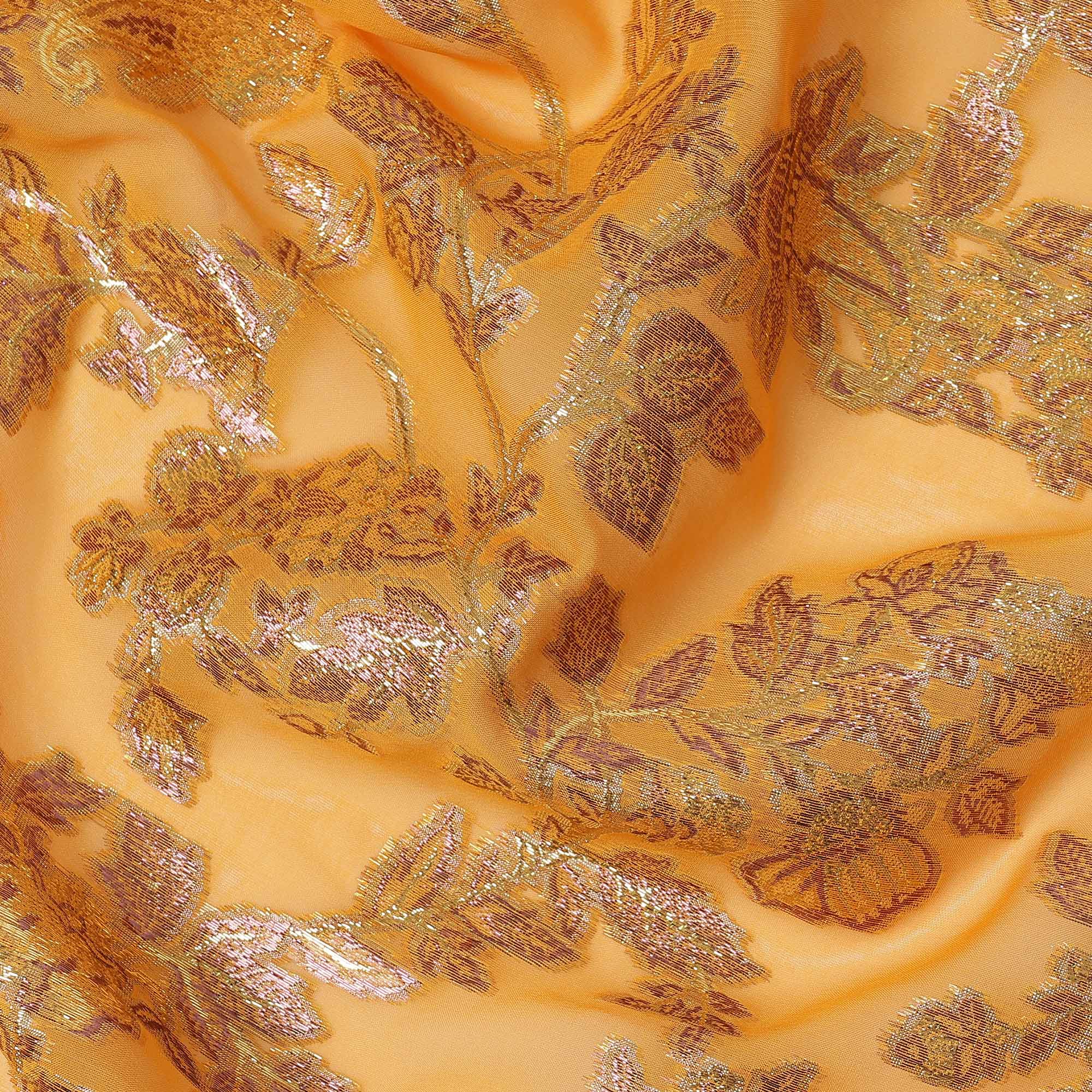 Elegant golden yellow silk chiffon fabric with metallic floral lurex detailing