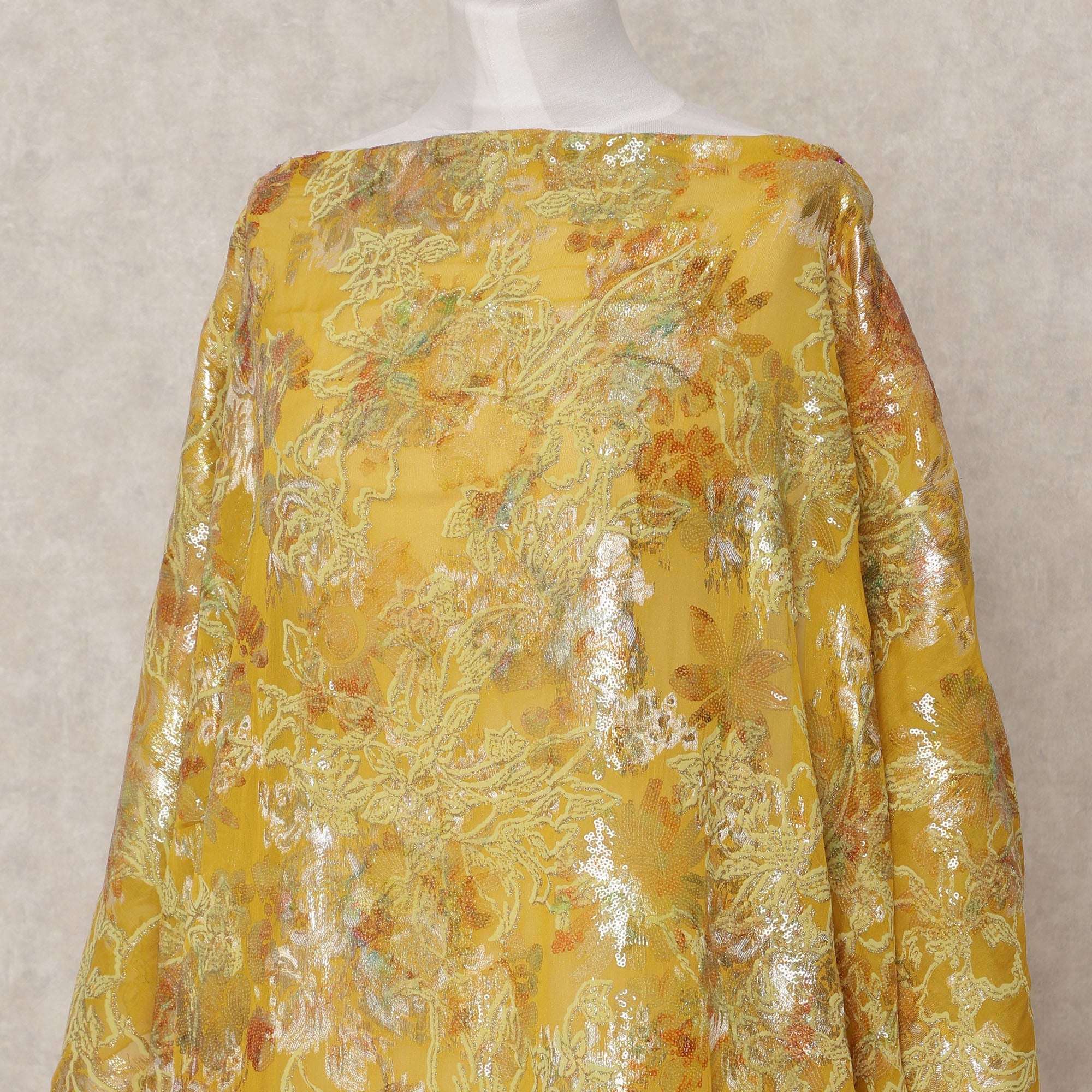 This golden yellow pure silk chiffon Somali dirac fabric is adorned with intricate metallic lurex floral patterns that shimmer beautifully... Read more Read more