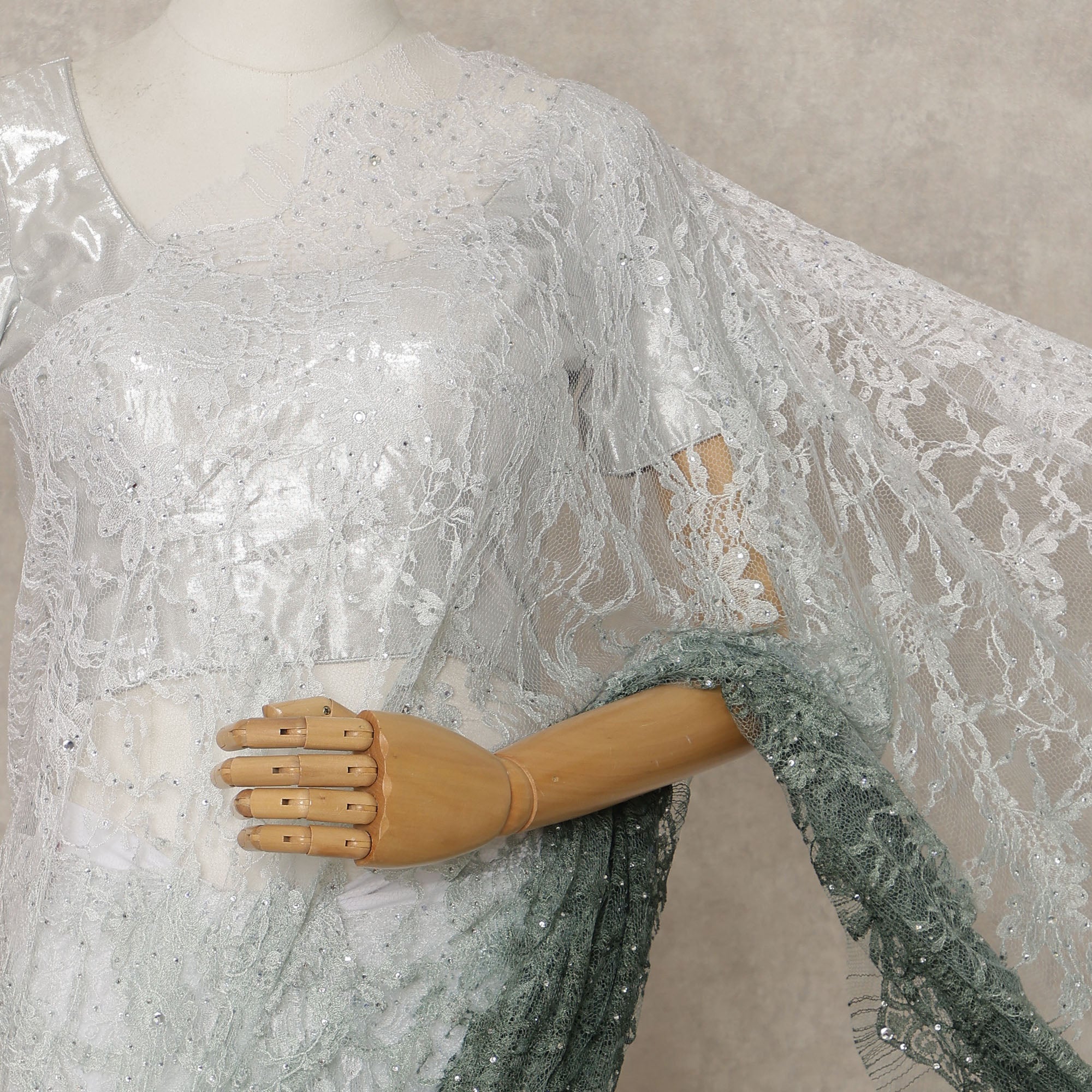This exquisite Green Ombre Premium French Chantilly saree lace features a graceful gradient from soft white to deep green, enriched with delicate Chantilly motifs and sparkling stone work that add refined elegance to the drape; crafted in France, this 5.5-meter piece offers luxurious fluidity and sophistication for high-end saree creations; blouse not included.