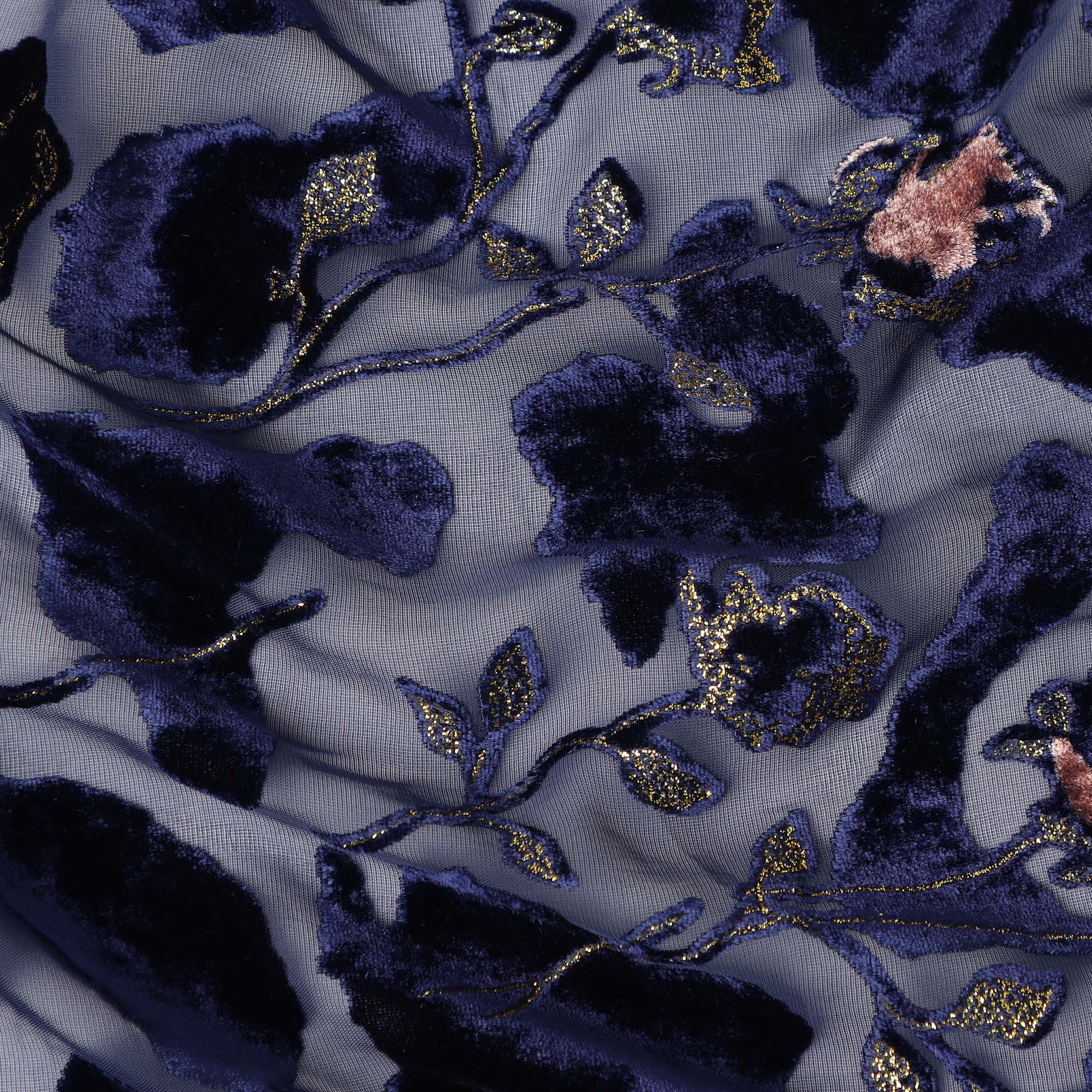 Elegant grey base with navy blue floral velvet print creates a refined designer appeal.