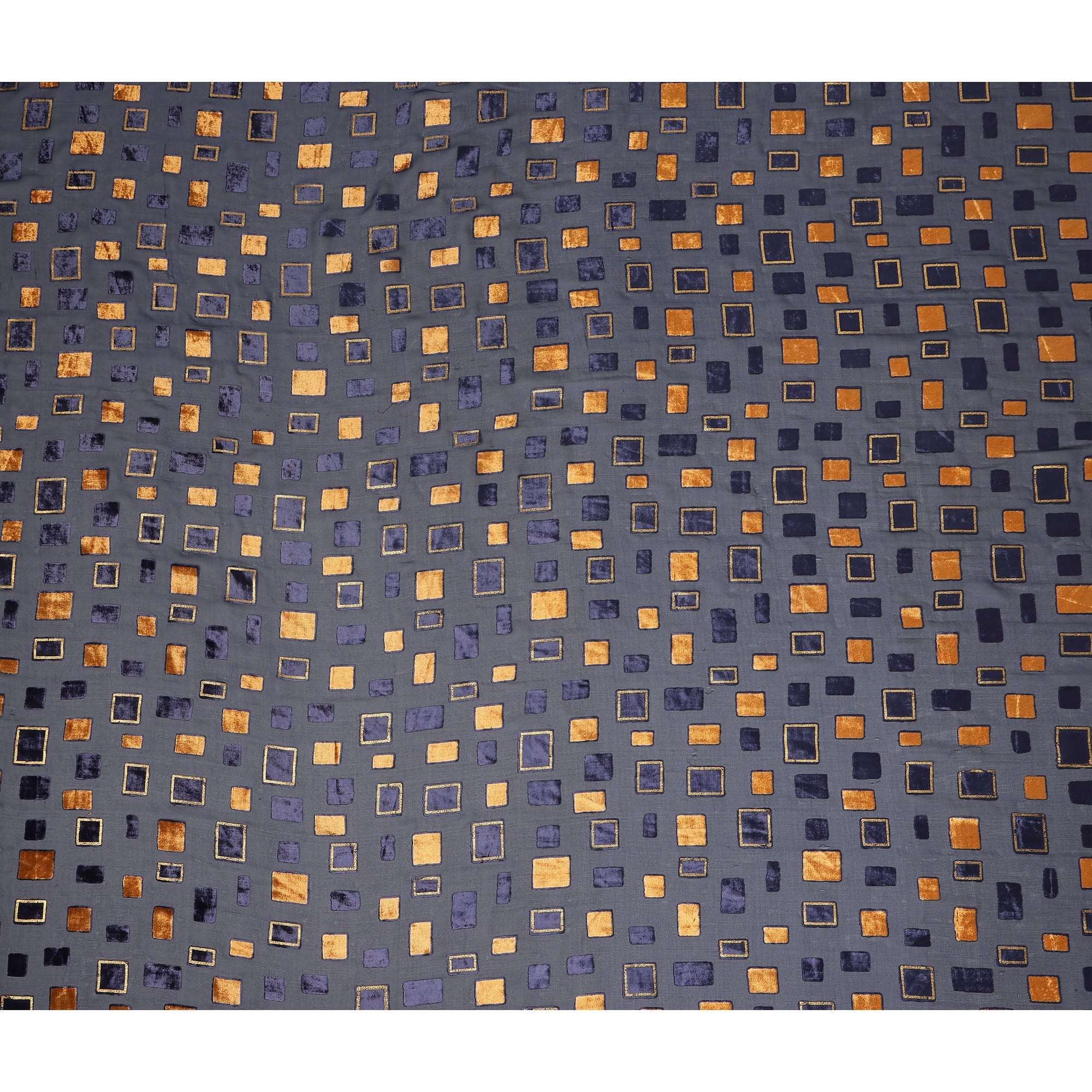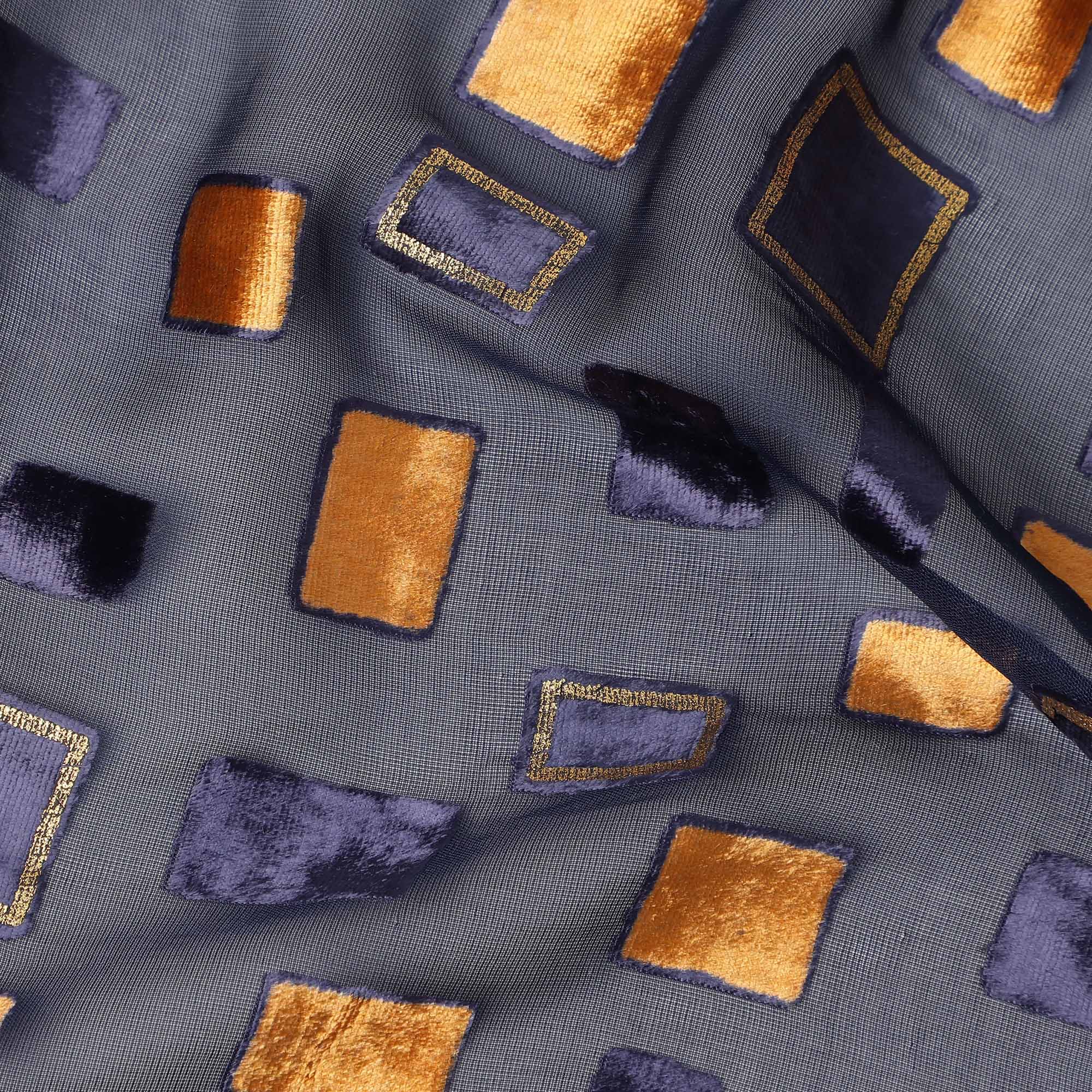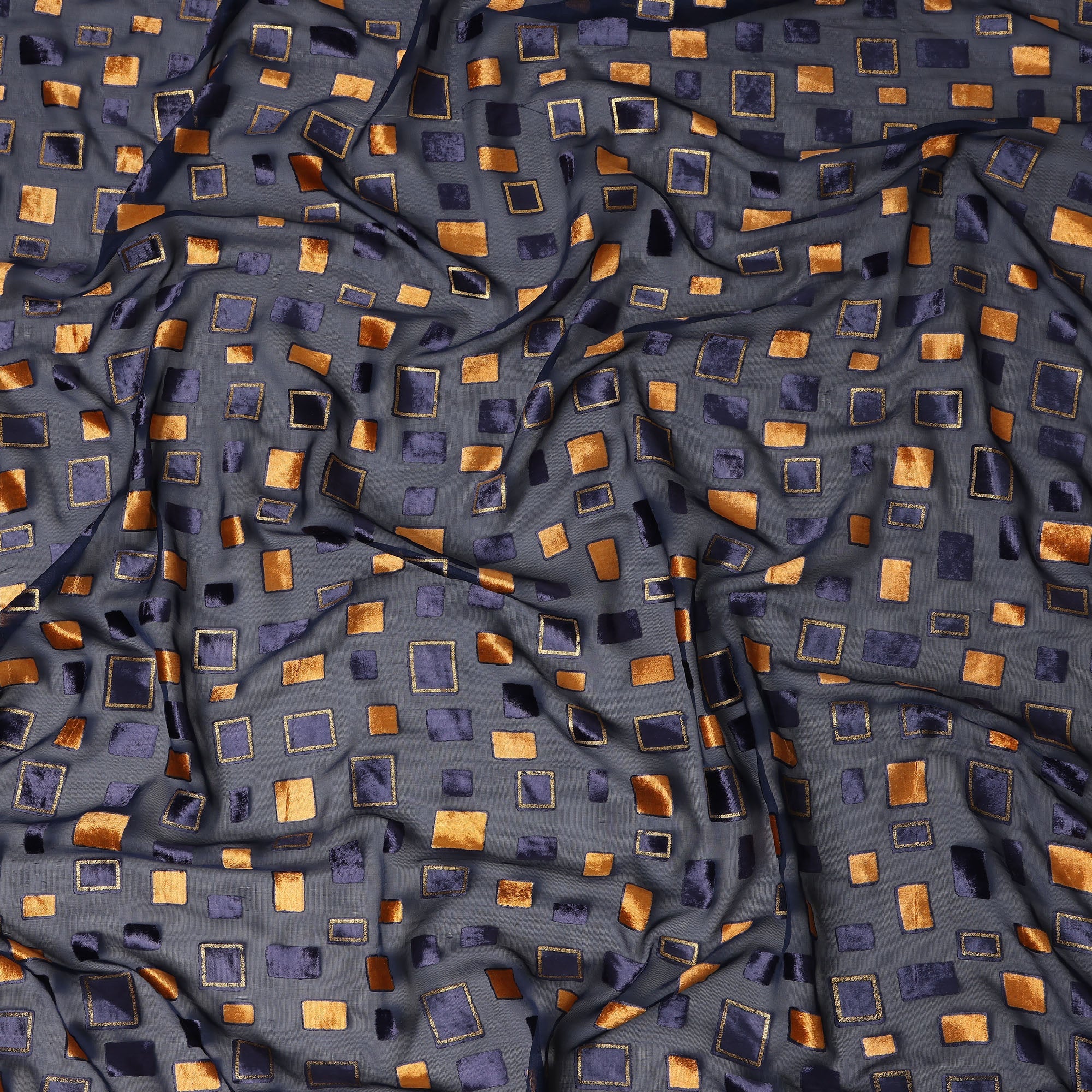 This grey and navy blue geometric square printed synthetic burnout chiffon velvet fabric offers a refined blend of modern design and luxurious texture. The sophisticated grey base is enhanced with rich navy blue and subtle golden square motifs, creating a striking contrast that stands out beautifully. Crafted using a burnout technique, it combines the lightness of chiffon with the plush appeal of velvet for added depth and dimension. With a generous 140 cms width, this fabric is perfect for sarees, gowns, dresses, dupattas, and designer blouses. Its soft feel, graceful drape, and elegant finish make it an excellent choice for festive wear, evening outfits, and statement fashion creations.