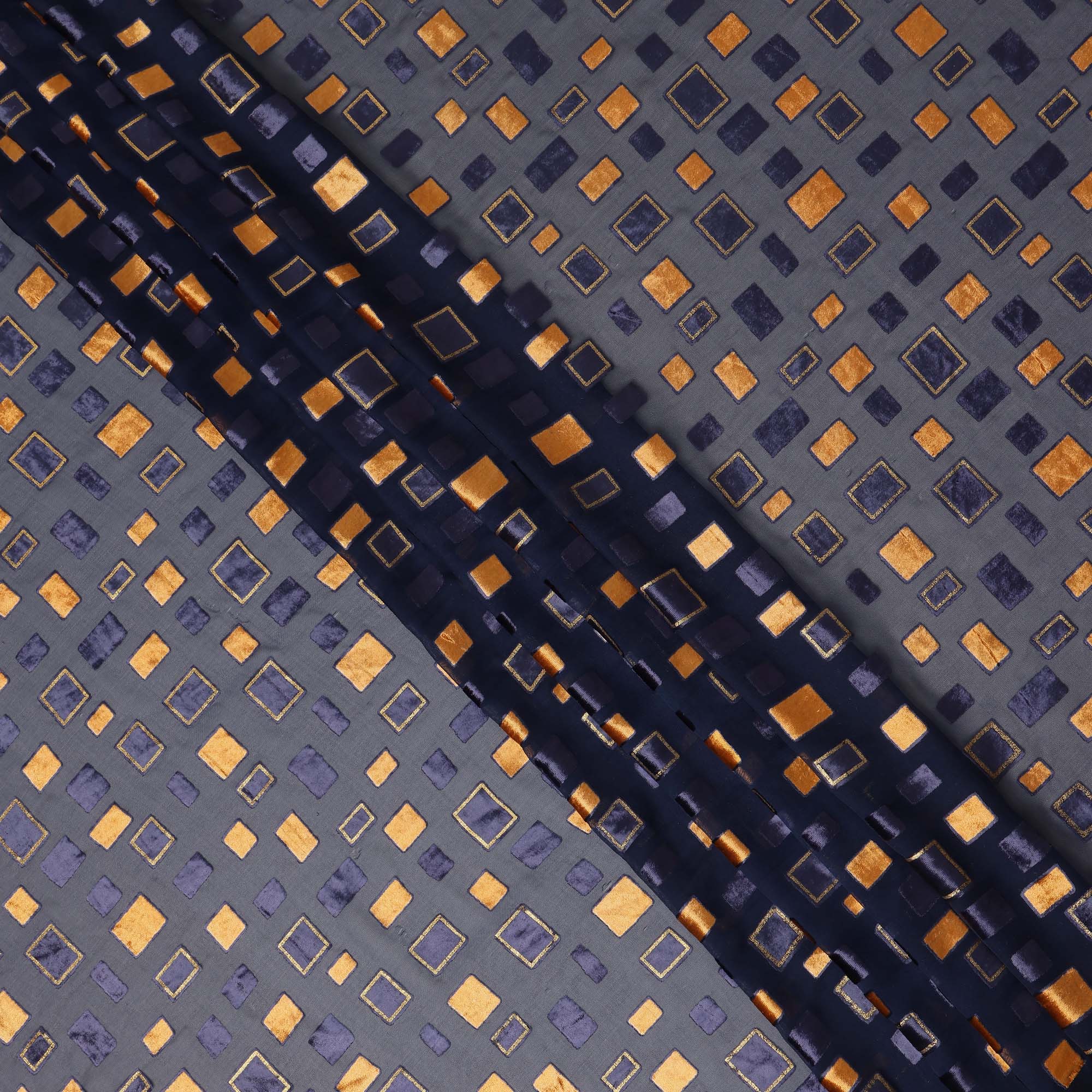 Grey and Navy Blue Geometric Square Printed Synthetic Burnout Chiffon Velvet Fabric 140 Cms Width India-D28174