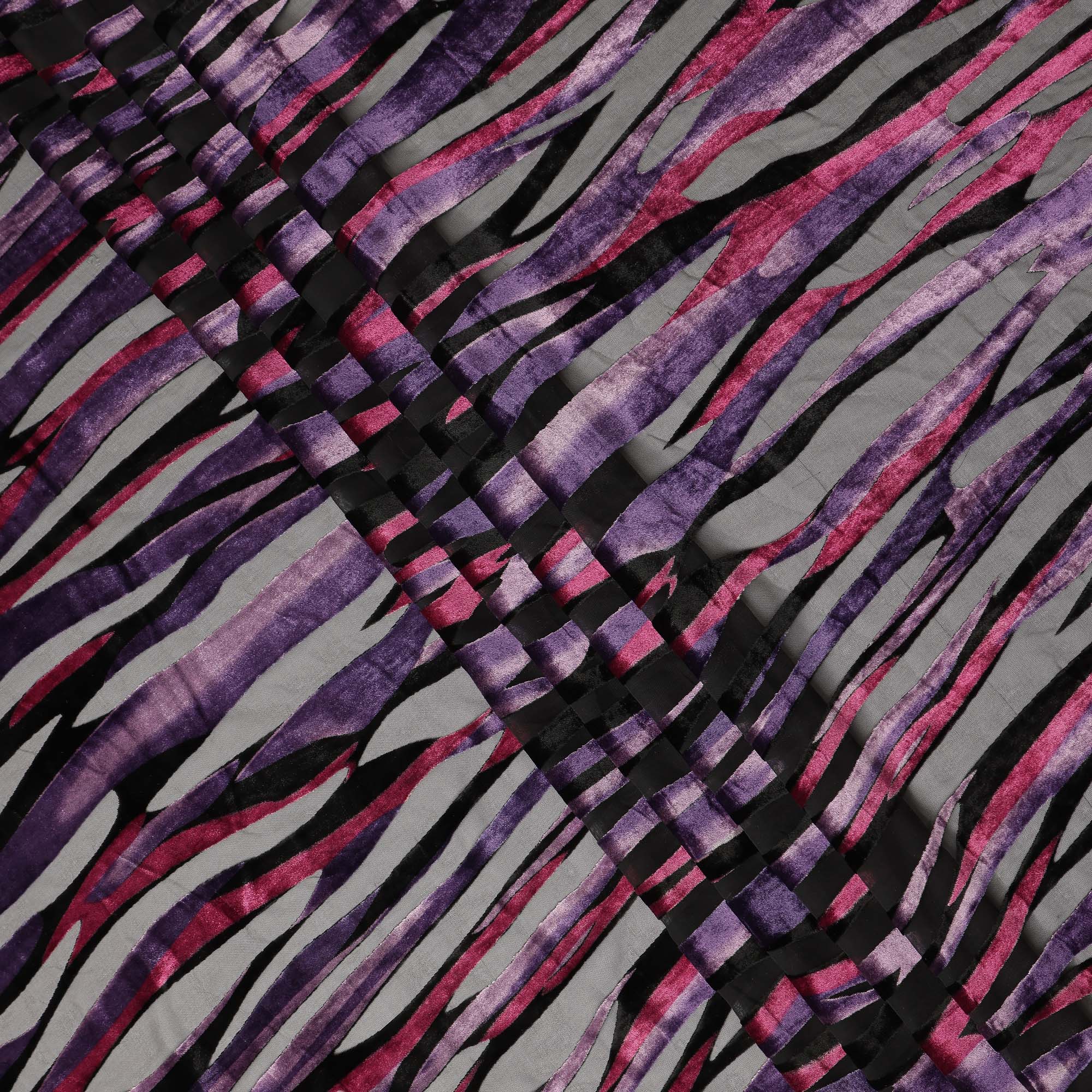 This grey and purple abstract striped printed synthetic burnout chiffon velvet fabric brings together contemporary design and luxurious texture in... Read more Read more