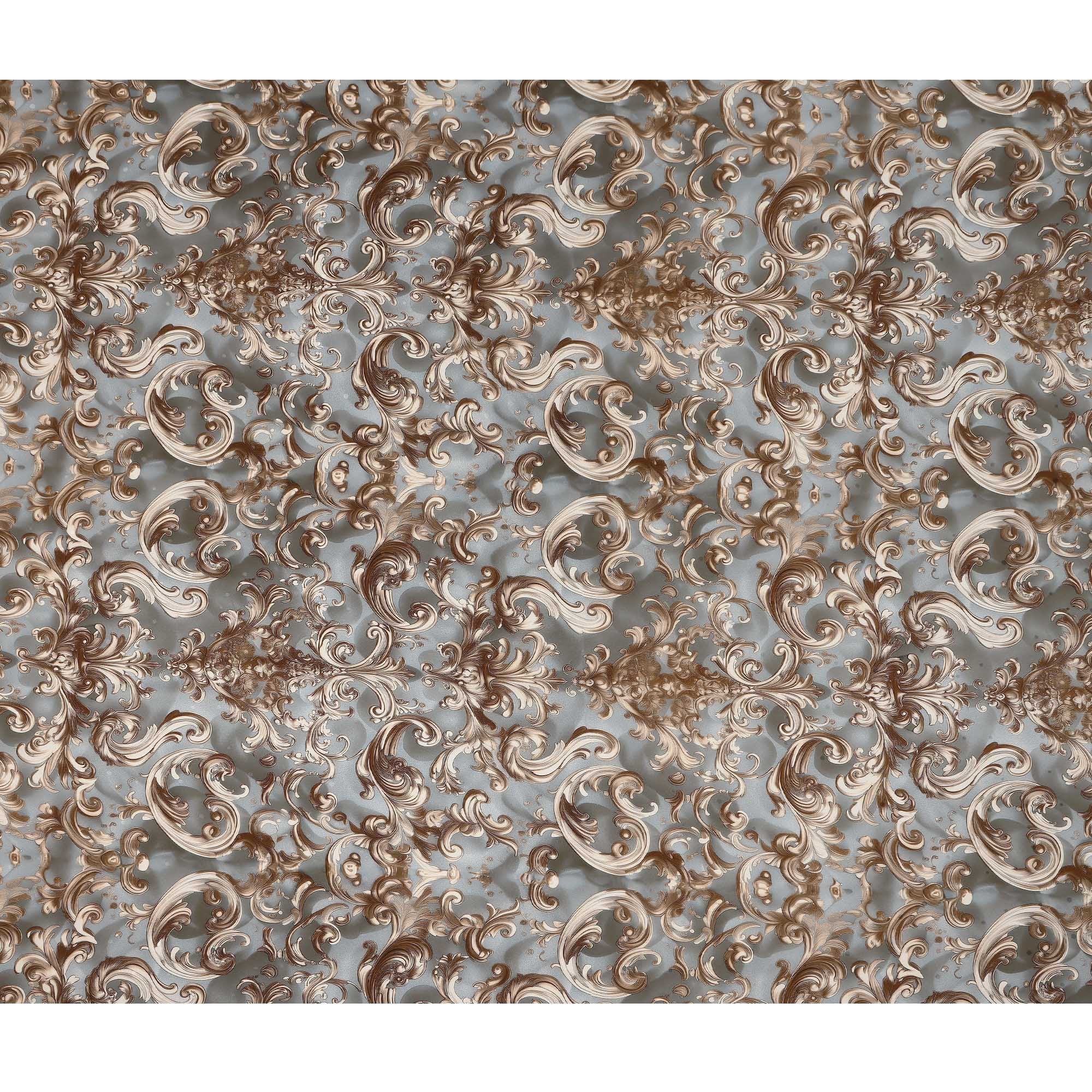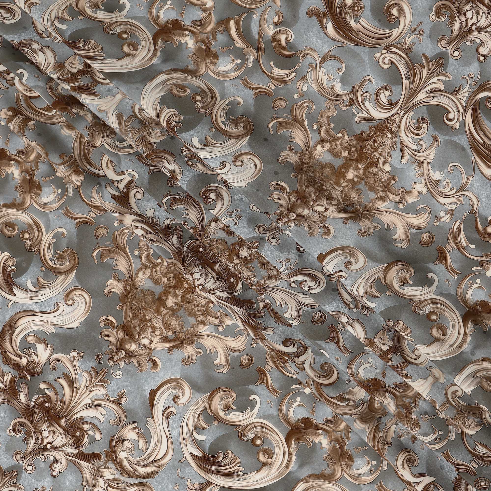 Grey base with brown baroque swirl print offers a classic and luxurious designer look.