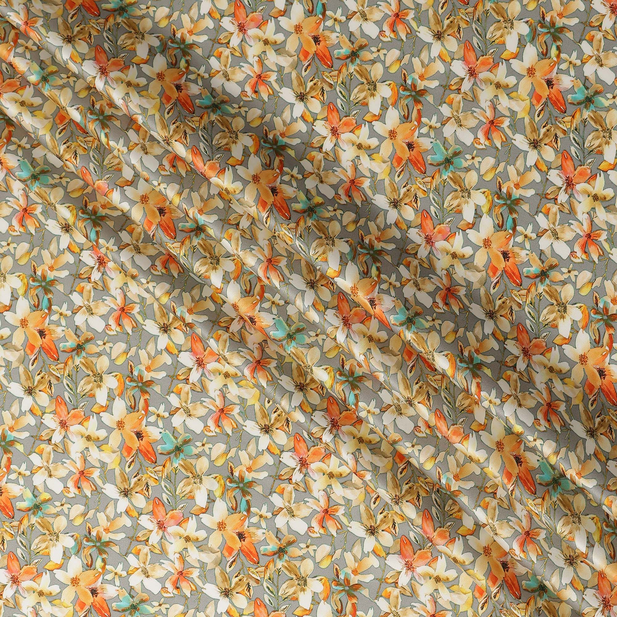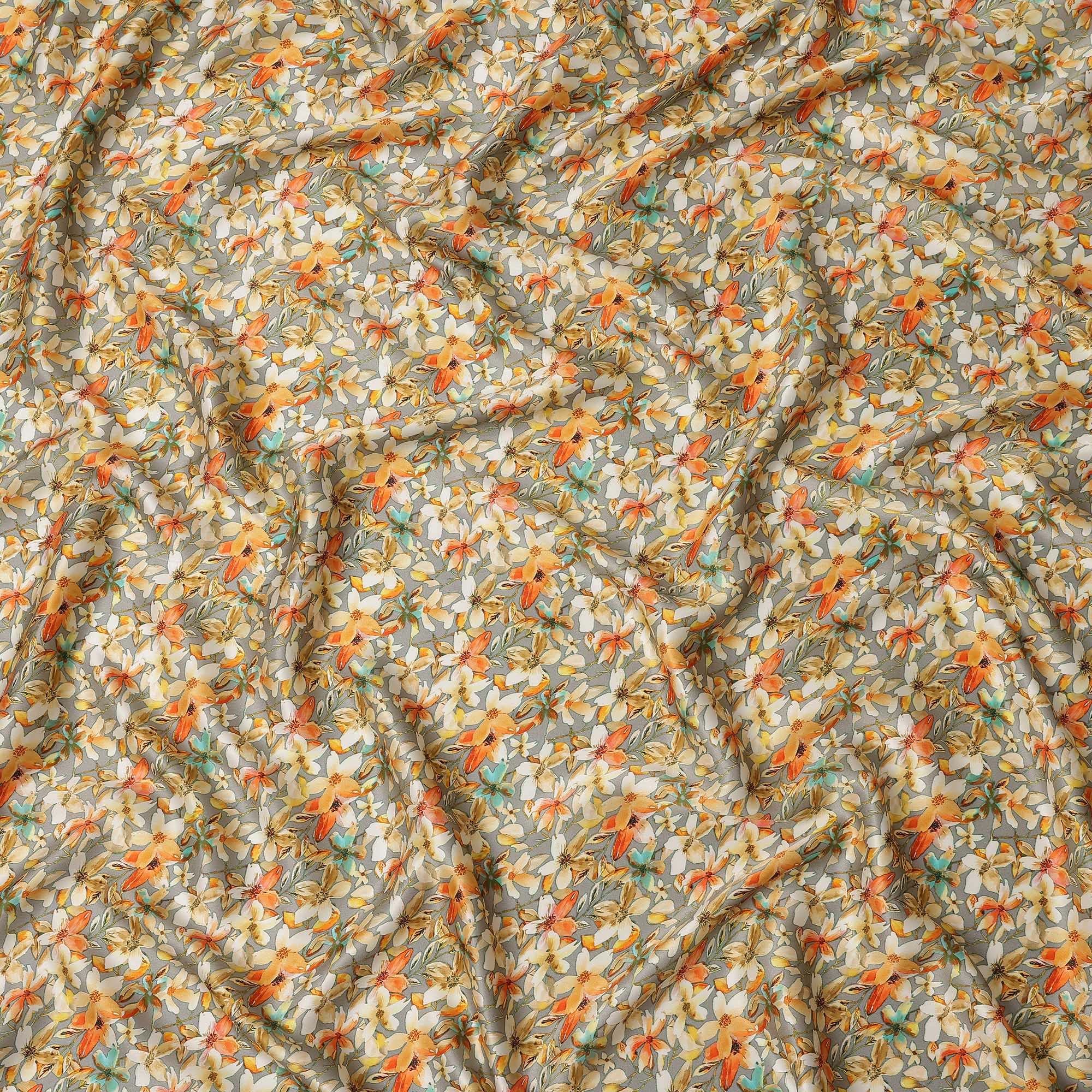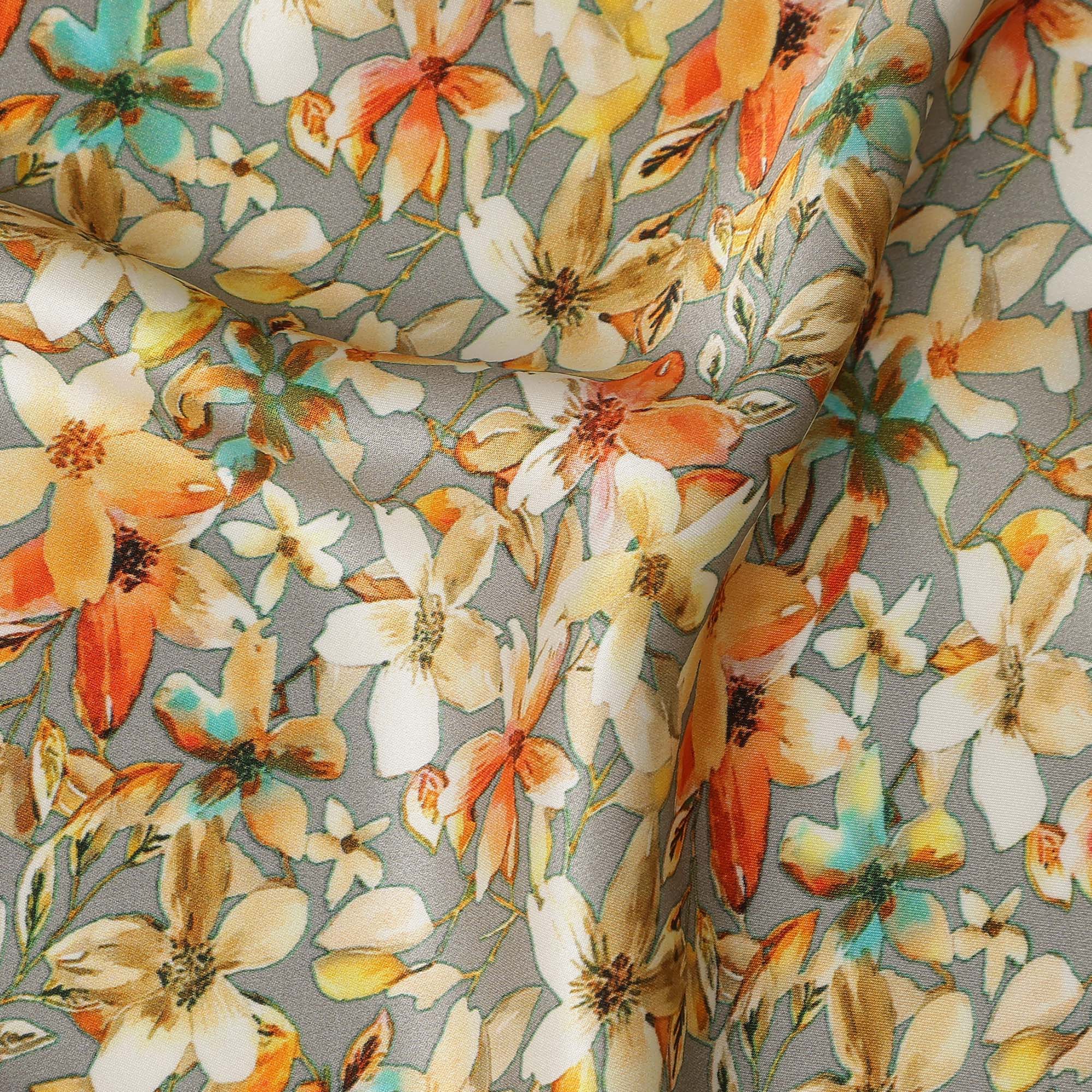 This elegant Grey Floral Allover Printed Premium Pure Silk Satin Fabric is a refined blend of subtle sophistication and luxurious craftsmanship, beautifully made in India for premium fashion creations. The soft grey base offers a calm, contemporary canvas that is gracefully enhanced with delicate floral motifs in warm shades of orange, ivory, beige, soft yellow, and hints of teal, creating a balanced and soothing visual appeal. Crafted from high-quality pure silk satin, the fabric features a naturally lustrous finish, an ultra-smooth texture, and a fluid drape that falls effortlessly, enhancing movement and silhouette with timeless elegance. Lightweight yet rich in feel, it is perfectly suited for sarees, blouses, dresses, skirts, gowns, and luxury fusion wear. With a width of 110 cms, it allows precision cutting and creative flexibility for couture-level tailoring. Ideal for designers and boutiques looking to buy online or shop online exclusive silk fabrics, this fabric stands out for its versatile grey tone, graceful floral artistry, and superior silk satin quality.