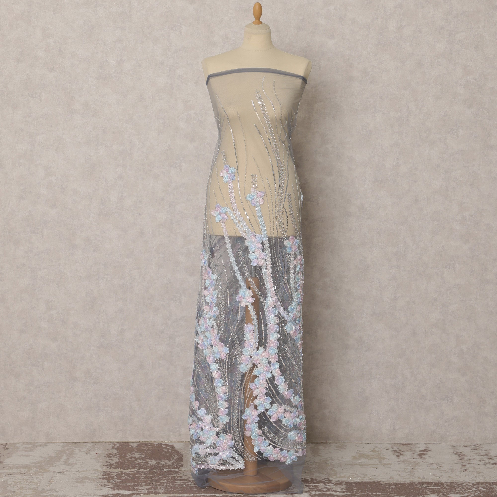 Elevate your designs with this exquisite grey nylon tulle fabric, featuring intricate floral embroidery and dazzling sequins. The delicate pastel-toned... Read more Read more