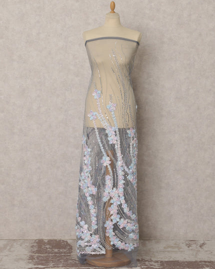 Grey Floral Embroidered Nylon Tulle Fabric with Sequins, 3.5 Mtrs, 135 Cms, India-D22356