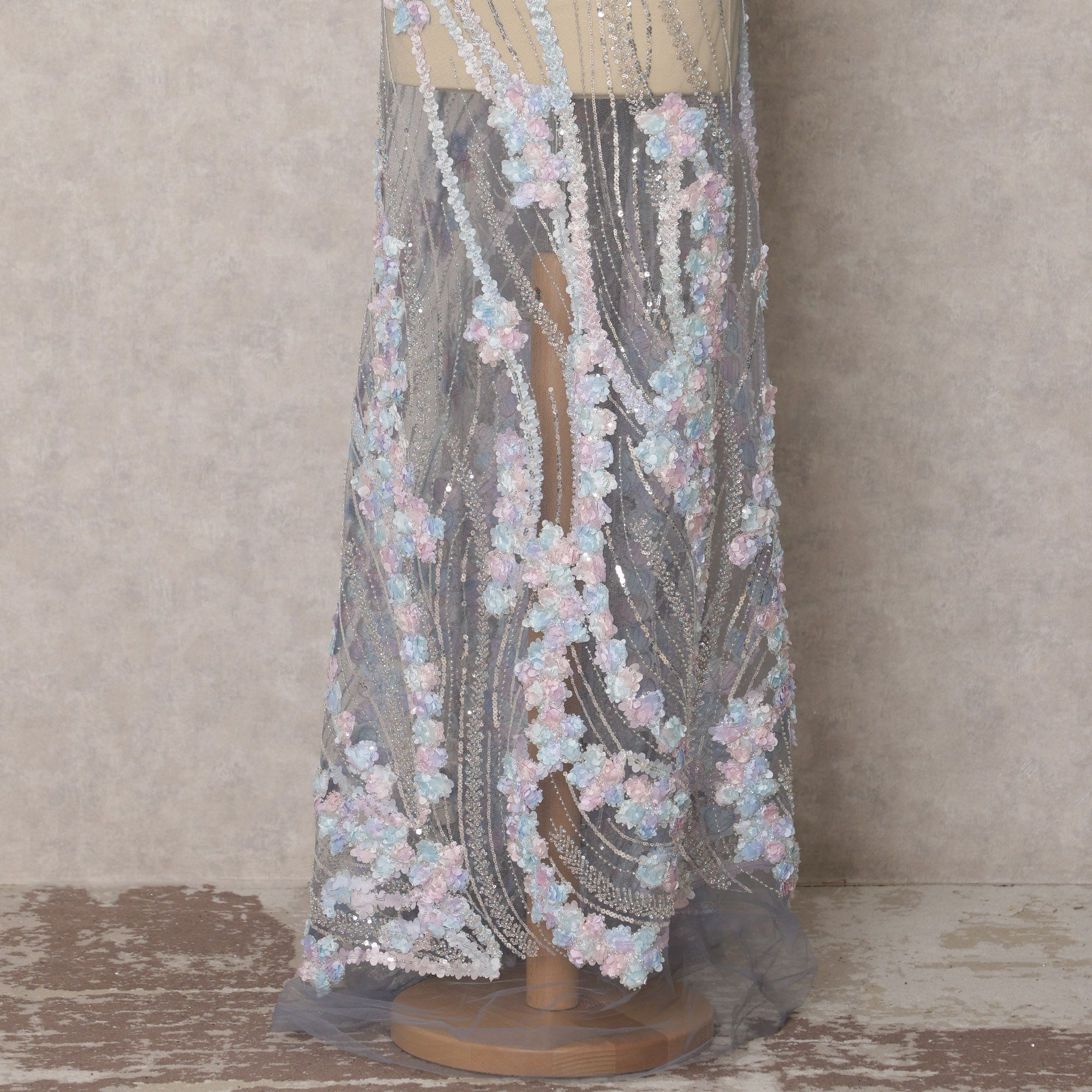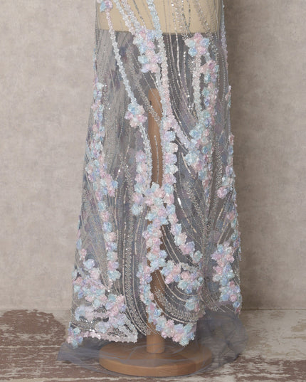 Elevate your designs with this exquisite grey nylon tulle fabric, featuring intricate floral embroidery and dazzling sequins. The delicate pastel-toned 3D floral appliqué enhances the luxurious appeal, making it a perfect choice for bridal gowns, evening dresses, and couture fashion. The soft and sheer tulle drapes gracefully, adding an ethereal touch to any ensemble. With its premium craftsmanship, shimmering embellishments, and lightweight texture, this 135 cm wide fabric is ideal for statement overlays, lehengas, and designer outfits. A blend of elegance and sophistication, this fabric transforms any creation into a masterpiece of timeless beauty.