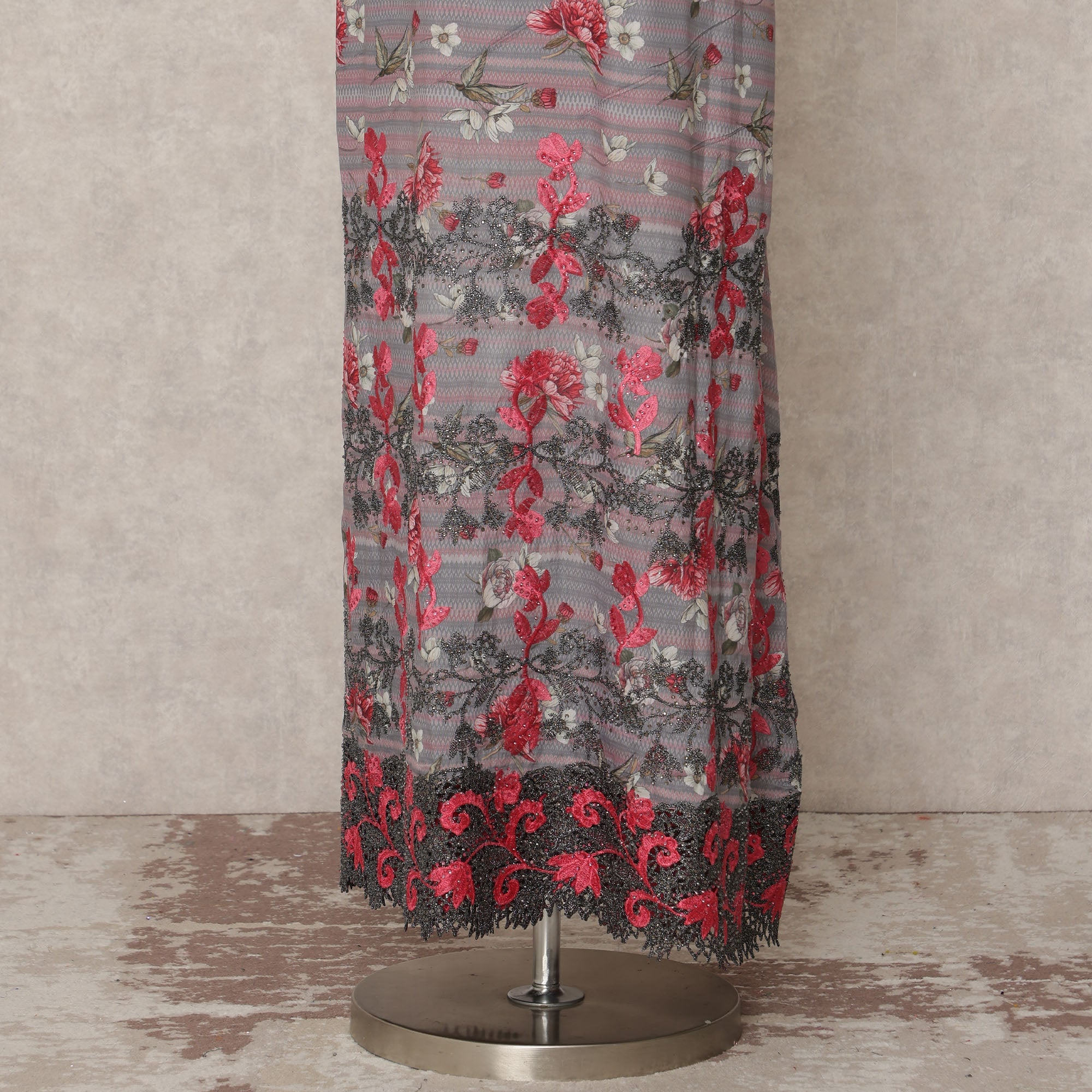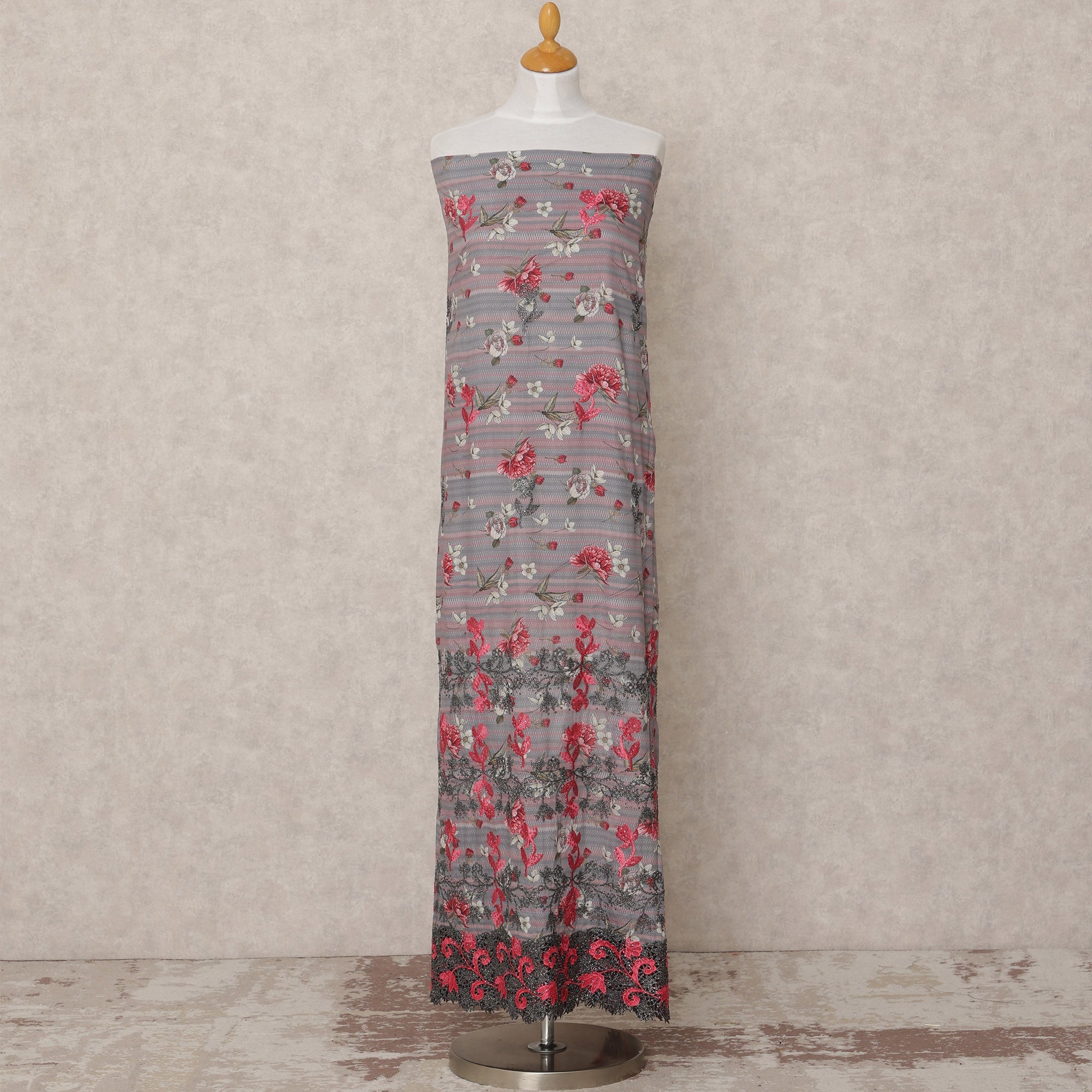 Experience elegance in every thread with this beautiful grey floral printed blended cotton fabric, enriched with vivid pink blooms and intricate black lace-inspired border detailing. This 3.0-meter length fabric offers a refined mix of contemporary charm and traditional floral artistry, perfect for creating sarees, kurtis, or festive ensembles. The soft cotton blend ensures breathable comfort, while the grey base subtly highlights the lush rose-pink and white floral motifs spread across the body. Intricate designs toward the lower end enhance its ethnic appeal, making it a versatile pick for both casual and occasion wear. Crafted in India with a width of 130 cms, this fabric not only exudes quality but also offers easy stitchability for diverse garment needs. Buy online to experience the richness of Indian textile tradition blended with modern aesthetics. Shop online now and transform your wardrobe with this timeless piece.