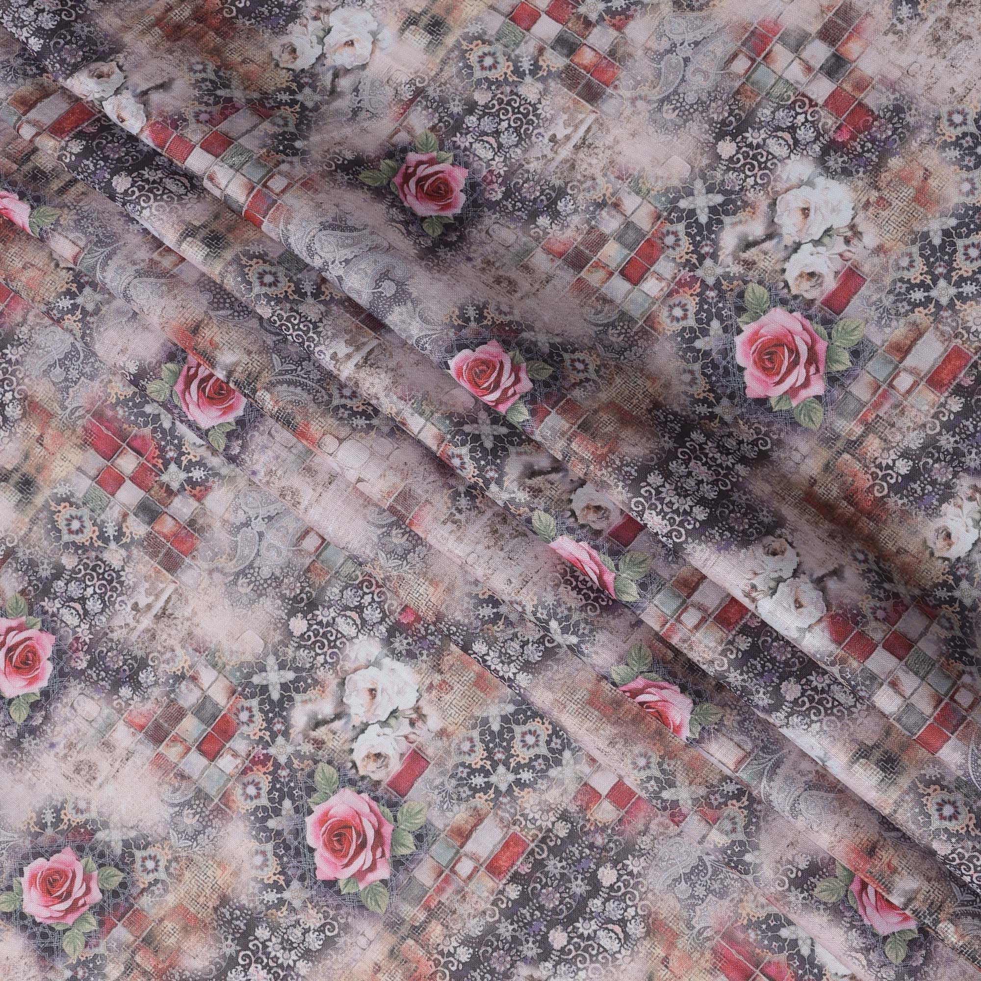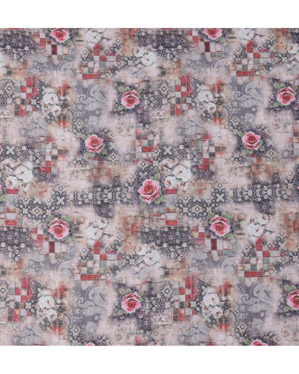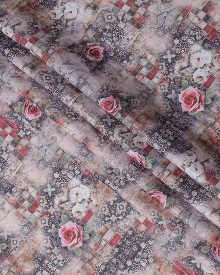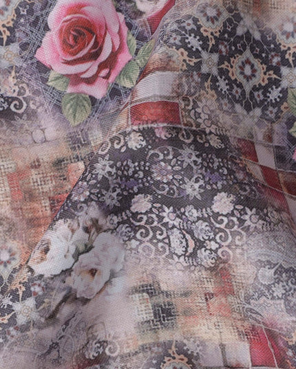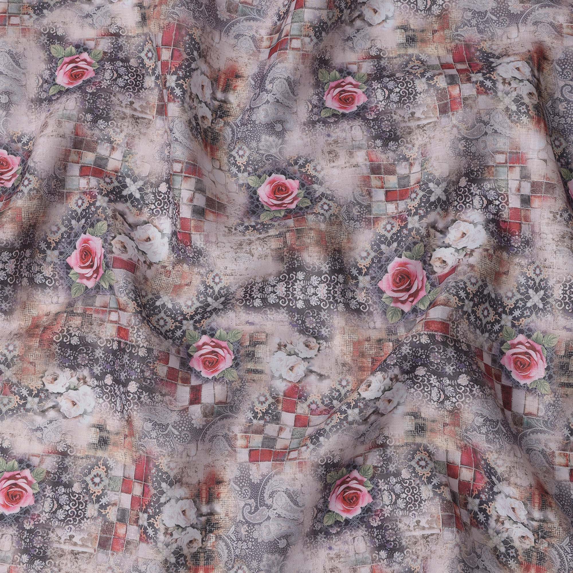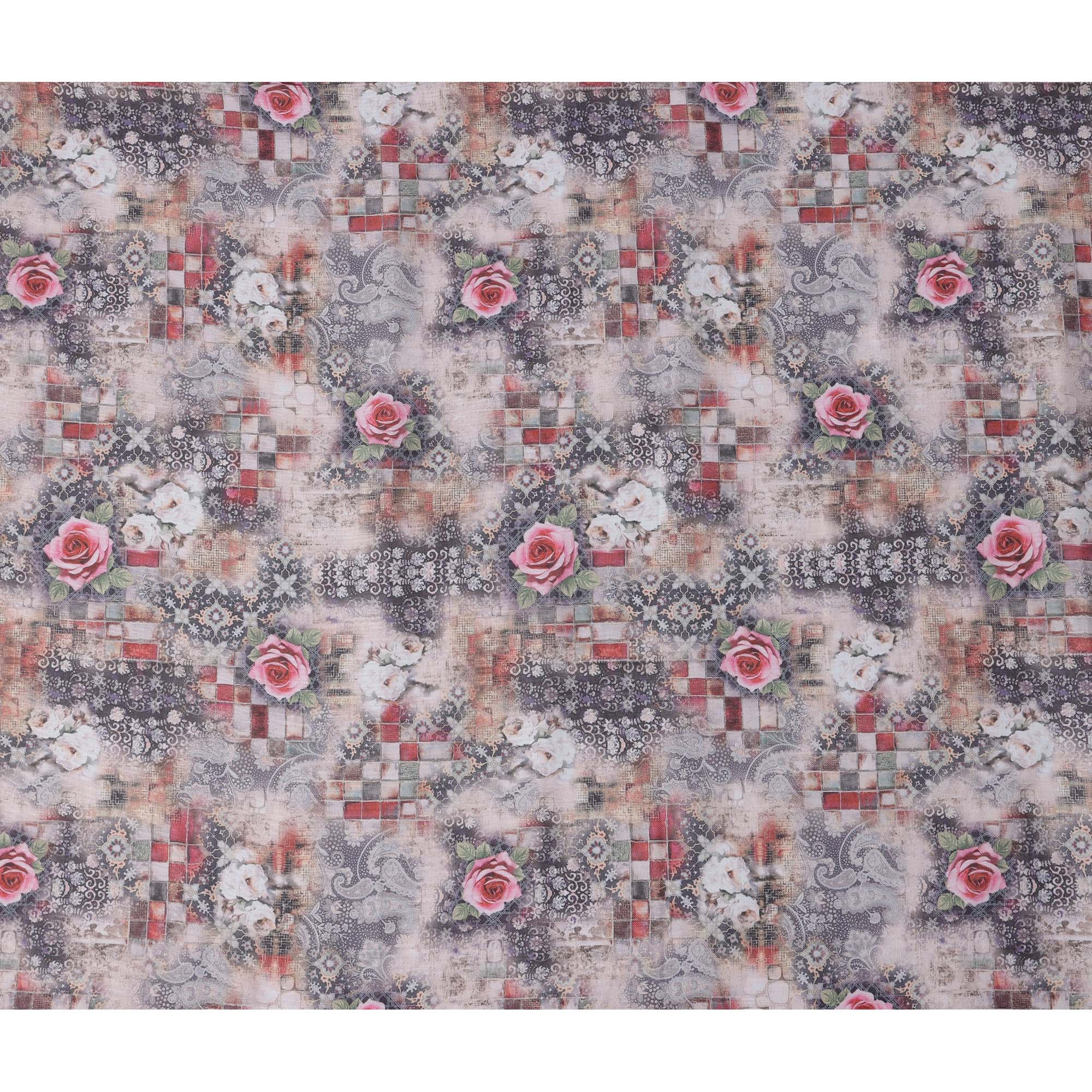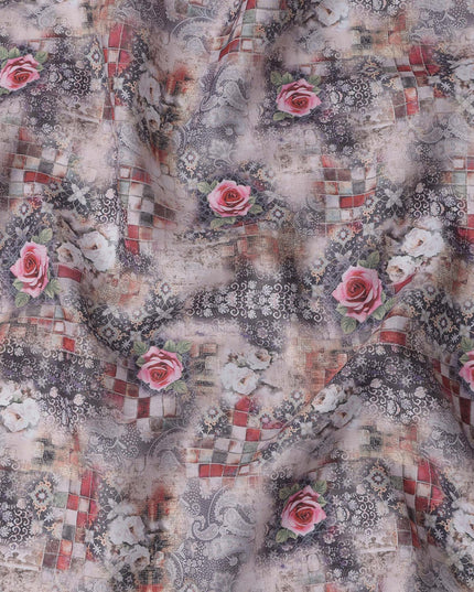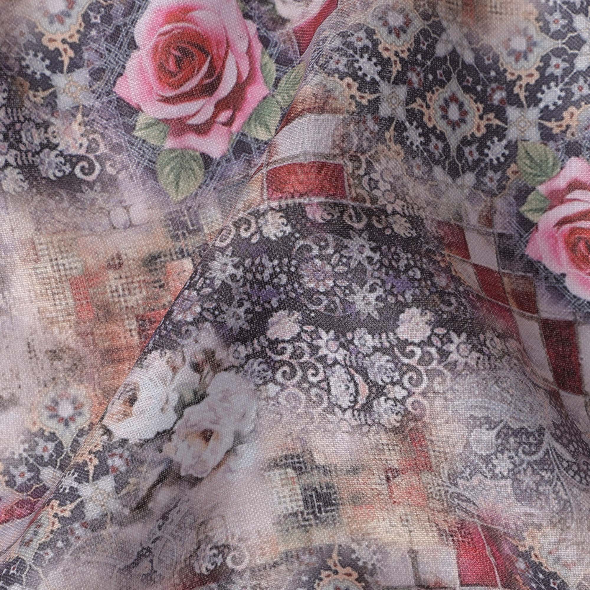 Enhance your designs with this grey multicolor floral printed blended linen fabric, crafted in India with a soft texture and breathable feel. The intricate blend of grey tones, red checkered patterns, and elegant pink roses creates a striking yet sophisticated aesthetic. This high-quality blended linen fabric offers durability, comfort, and versatility, making it perfect for stylish garments, artistic home décor, and unique DIY projects. With a width of 140 cm, it provides ample material for diverse sewing applications, ensuring a refined and elegant finish.