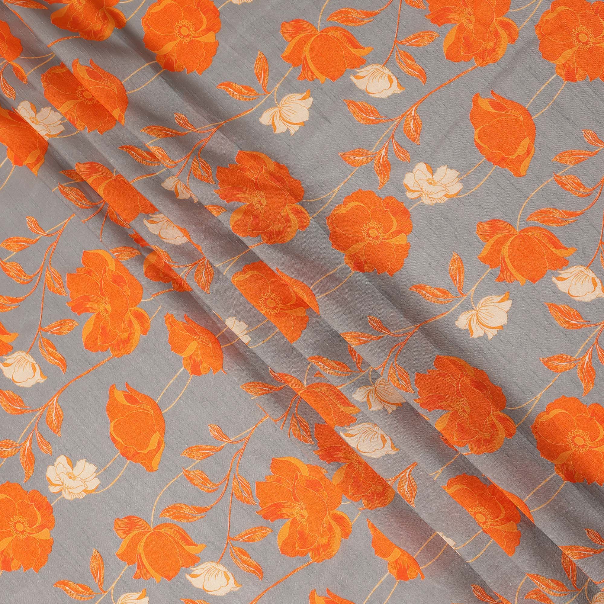 Grey Orange Floral Printed Viscose Fabric Raw Silk Finish Elegant Soft Dress Material 110 Cms India-D27331