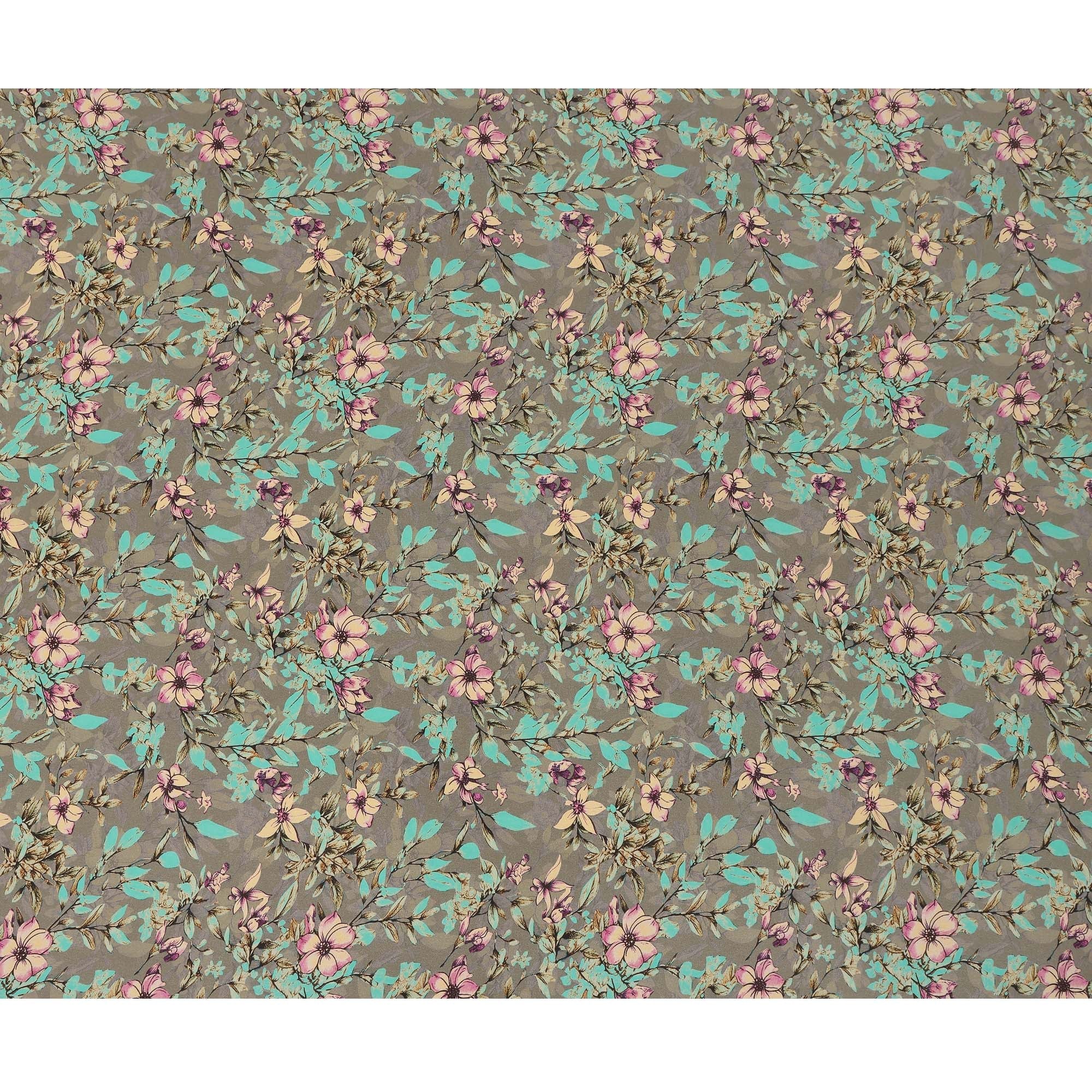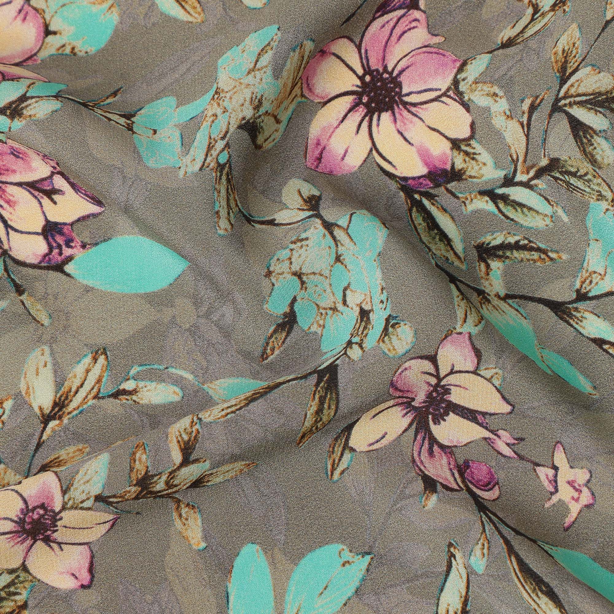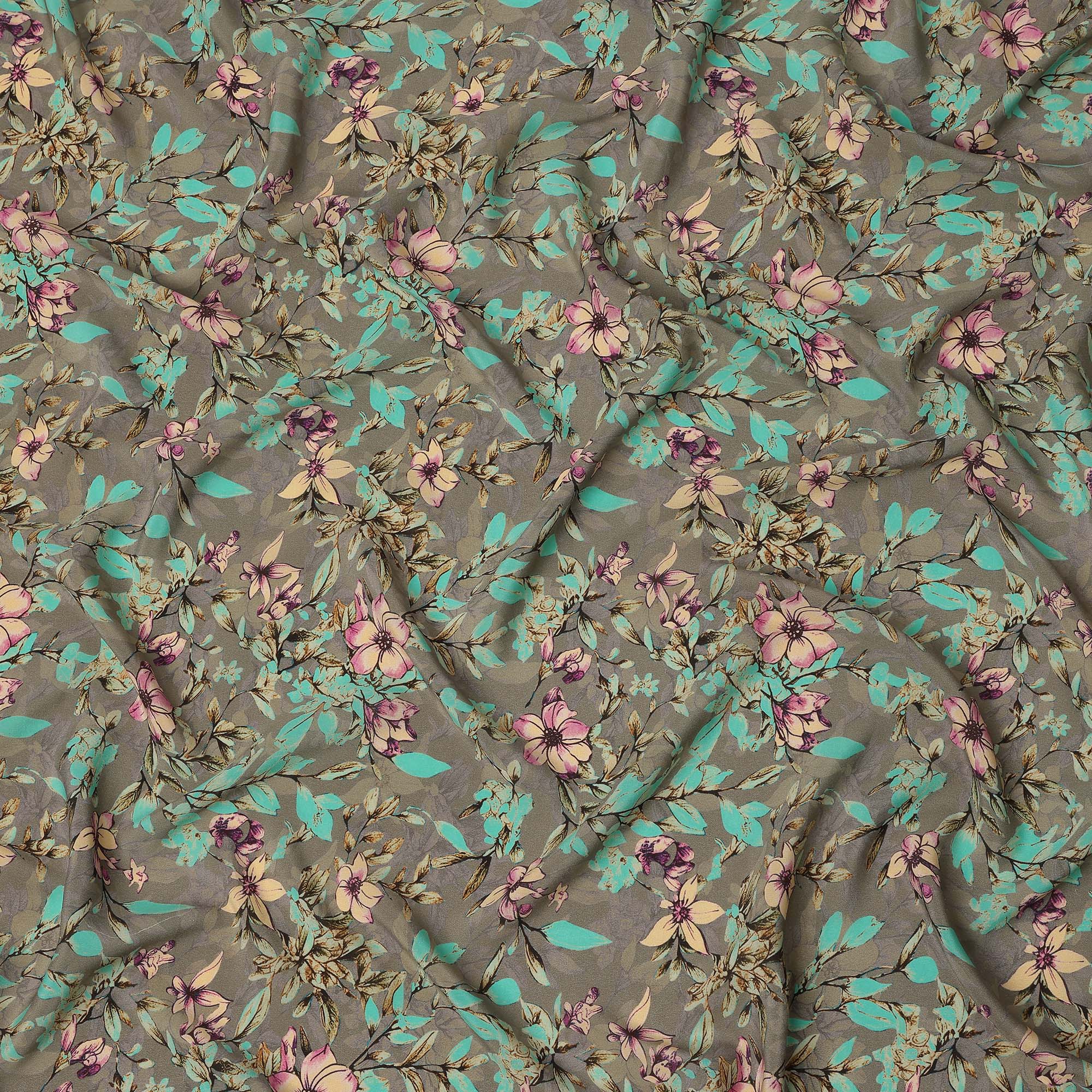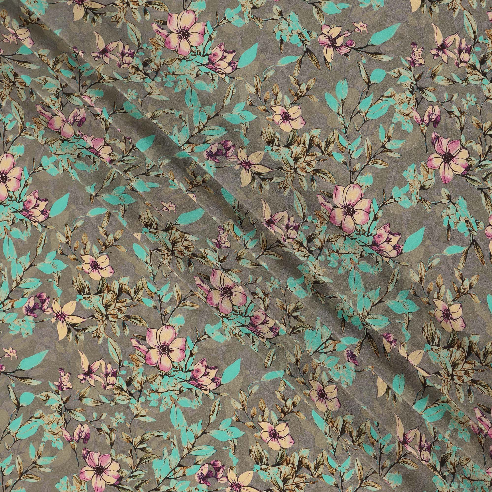 Grey Teal Floral Botanical Print Premium Silk Crepe Fabric, 110 Cms, India-D26876