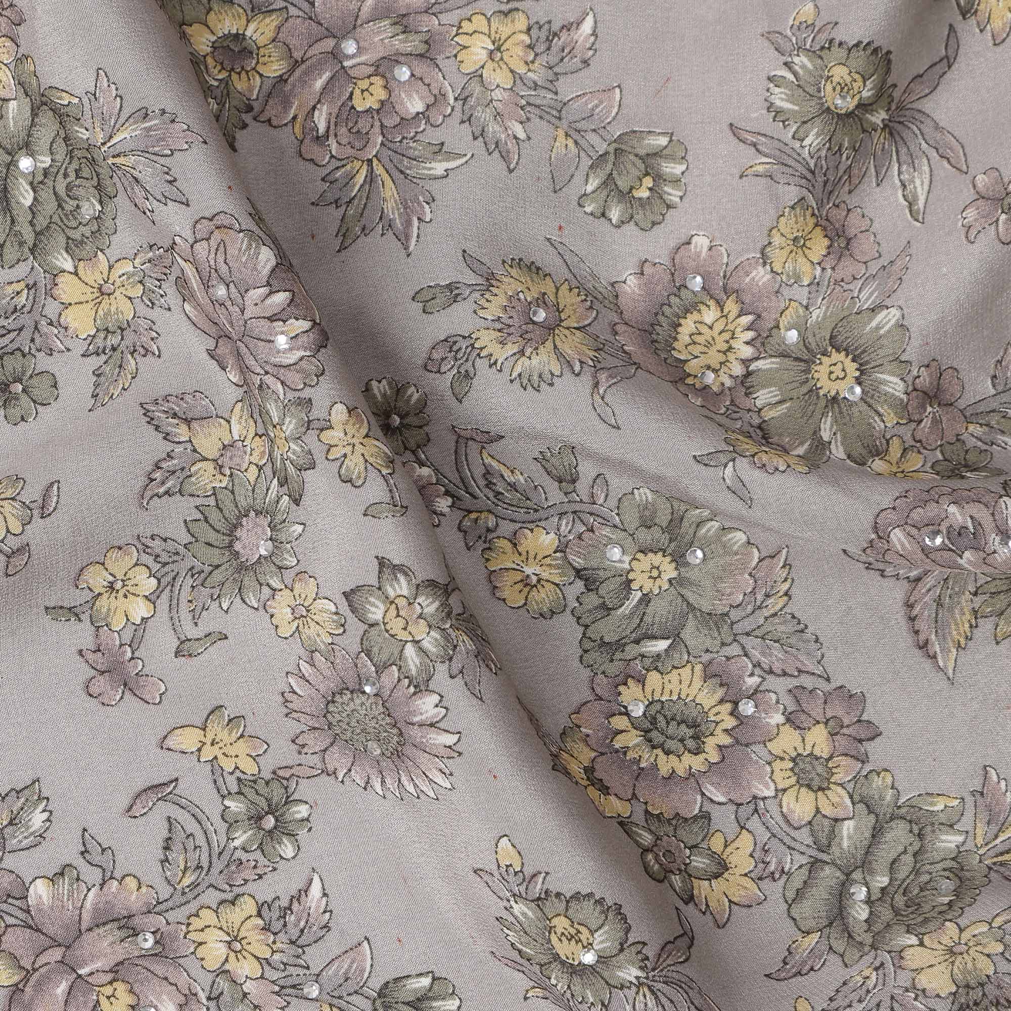 Grey Yellow Floral Pattern Pure Silk Crepe Fabric with Stone Work, Width 110 Cms, Made in India-D26072