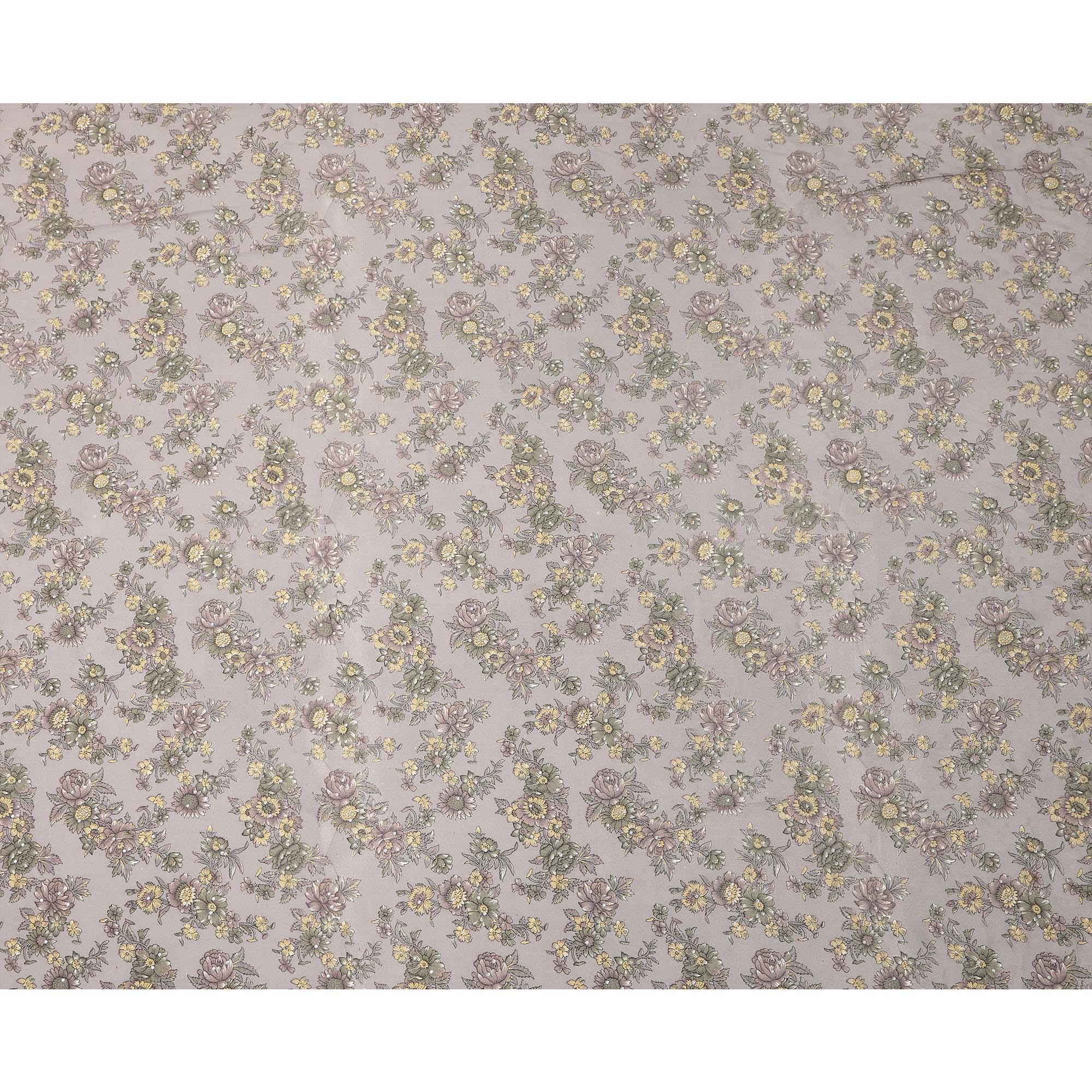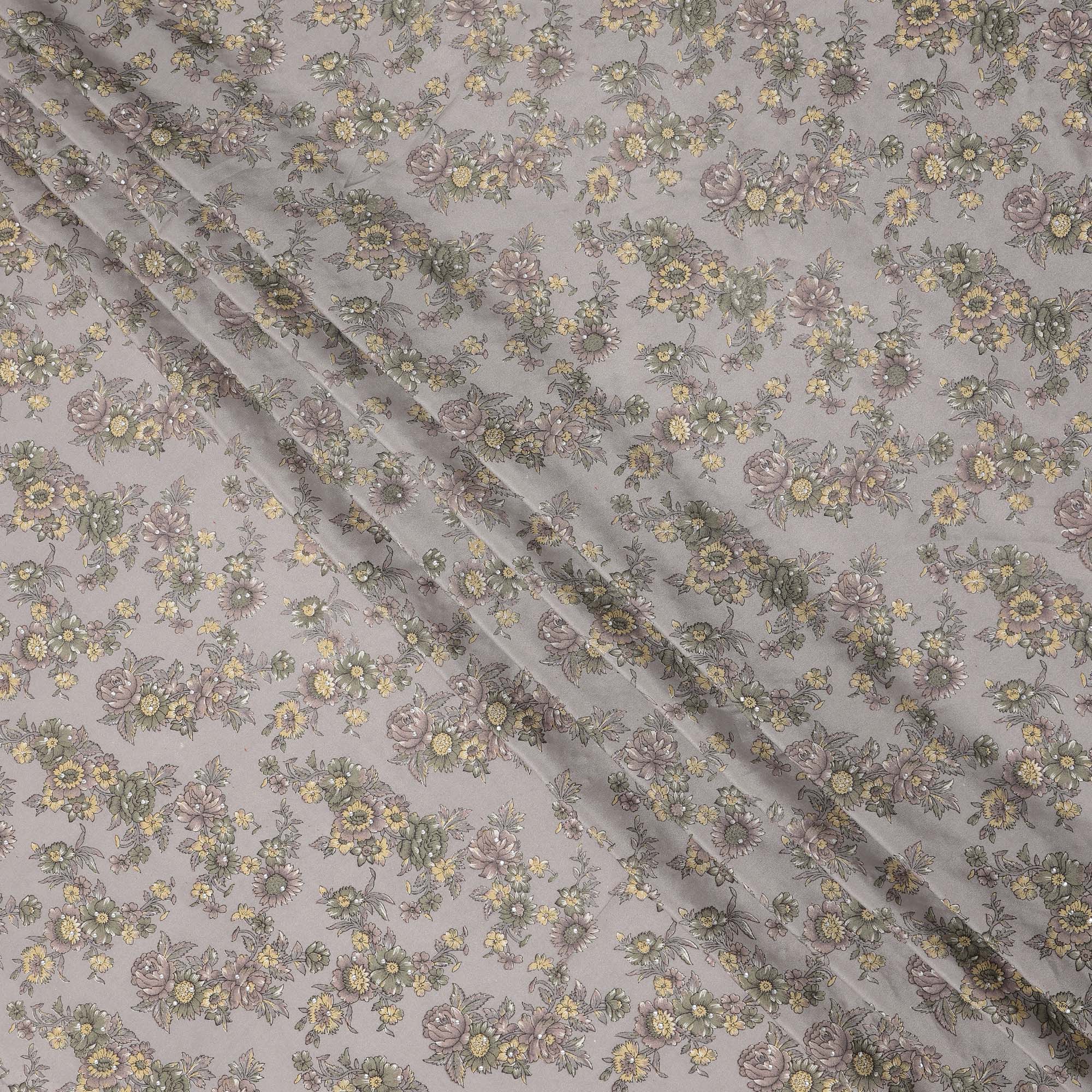 Features elegant floral motifs in yellow, mauve, and green on a serene grey base
