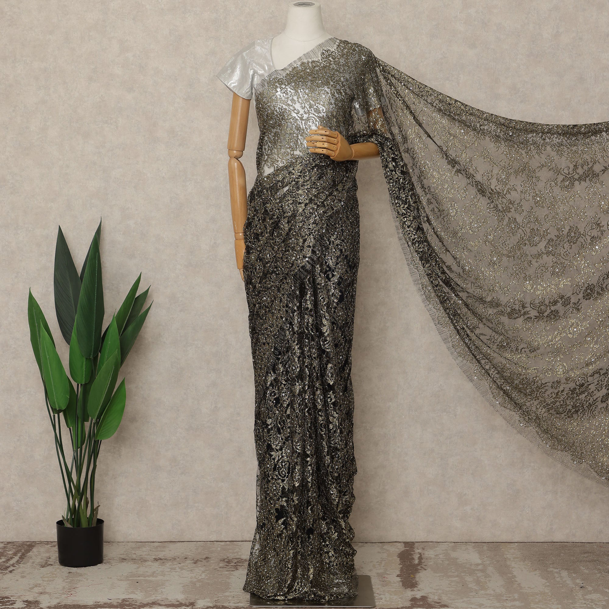 This Gunmetal Black Premium French Metallic Chantilly Lace Saree is a striking expression of luxury and sophistication, featuring a deep gunmetal black base enriched with shimmering metallic tones and delicate stone work that beautifully accentuates the intricate floral Chantilly lace patterns, meticulously crafted in France to deliver couture-level elegance and refined craftsmanship, offered as a premium saree lace fabric piece of approximately 5.5 meters in length with a generous 110 cms width, making it ideal for creating glamorous sarees for weddings, cocktail evenings, receptions, and statement festive wear, where the sheer texture, ornate detailing, and graceful drape enhance the silhouette effortlessly, while the metallic lace and stone embellishments add opulent sparkle without overwhelming the design, and as the blouse is not included it allows complete freedom for personalized styling, with gentle hand wash or professional dry cleaning recommended to preserve the stones, metallic finish, and delicate lace structure.