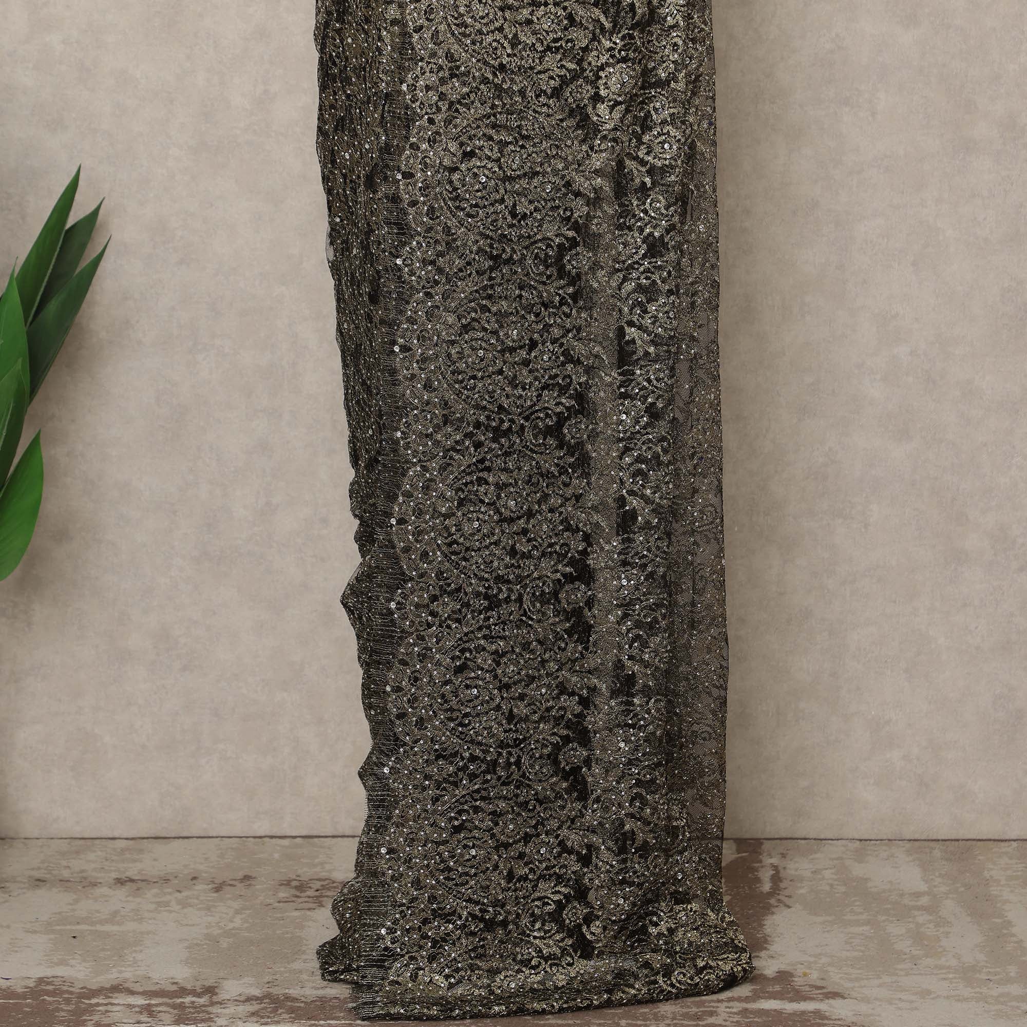 Premium gunmetal black metallic Chantilly lace saree fabric with elegant stone work detailing.