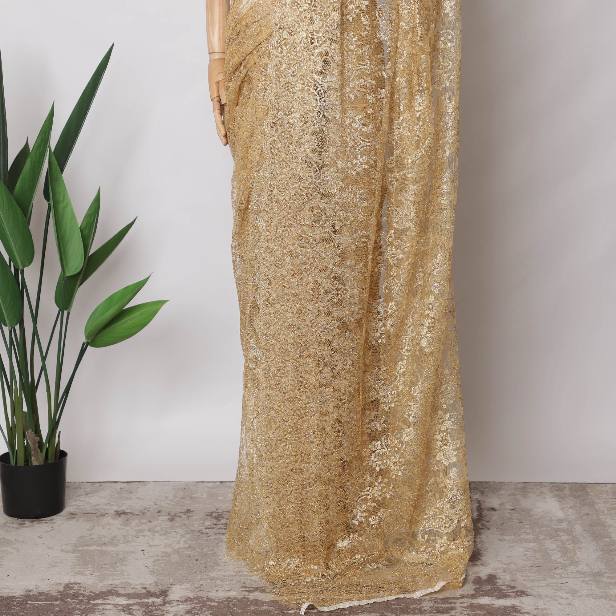 Honey Gold Premium French Metallic Chantilly Saree Lace Fabric, 5.5 MetersX110 Cms-D21503