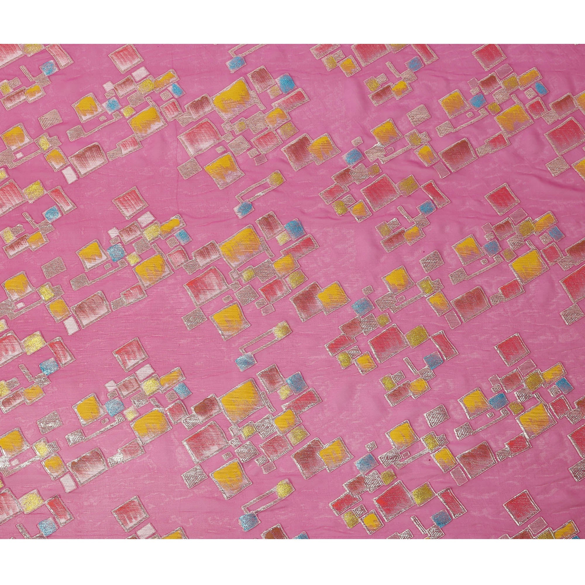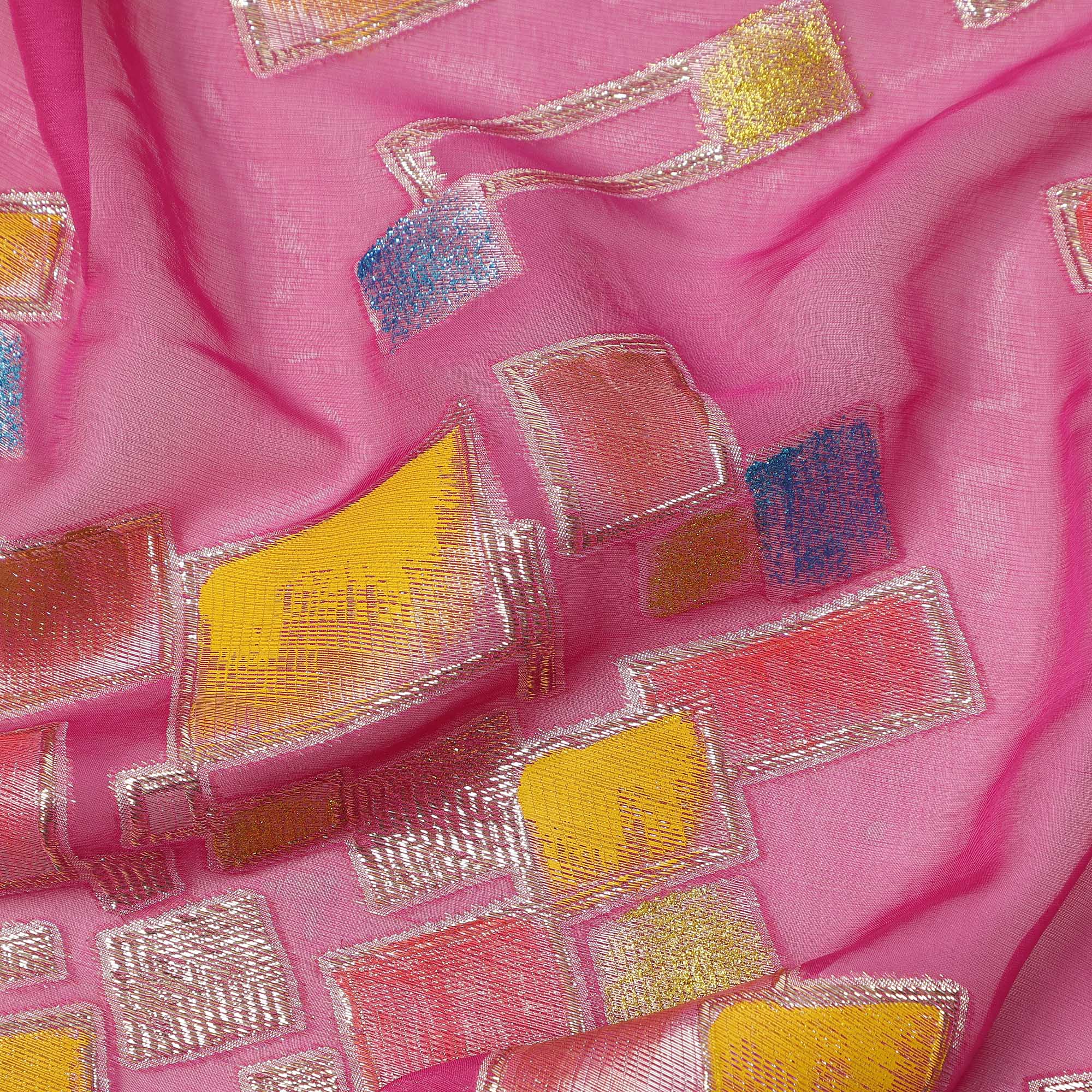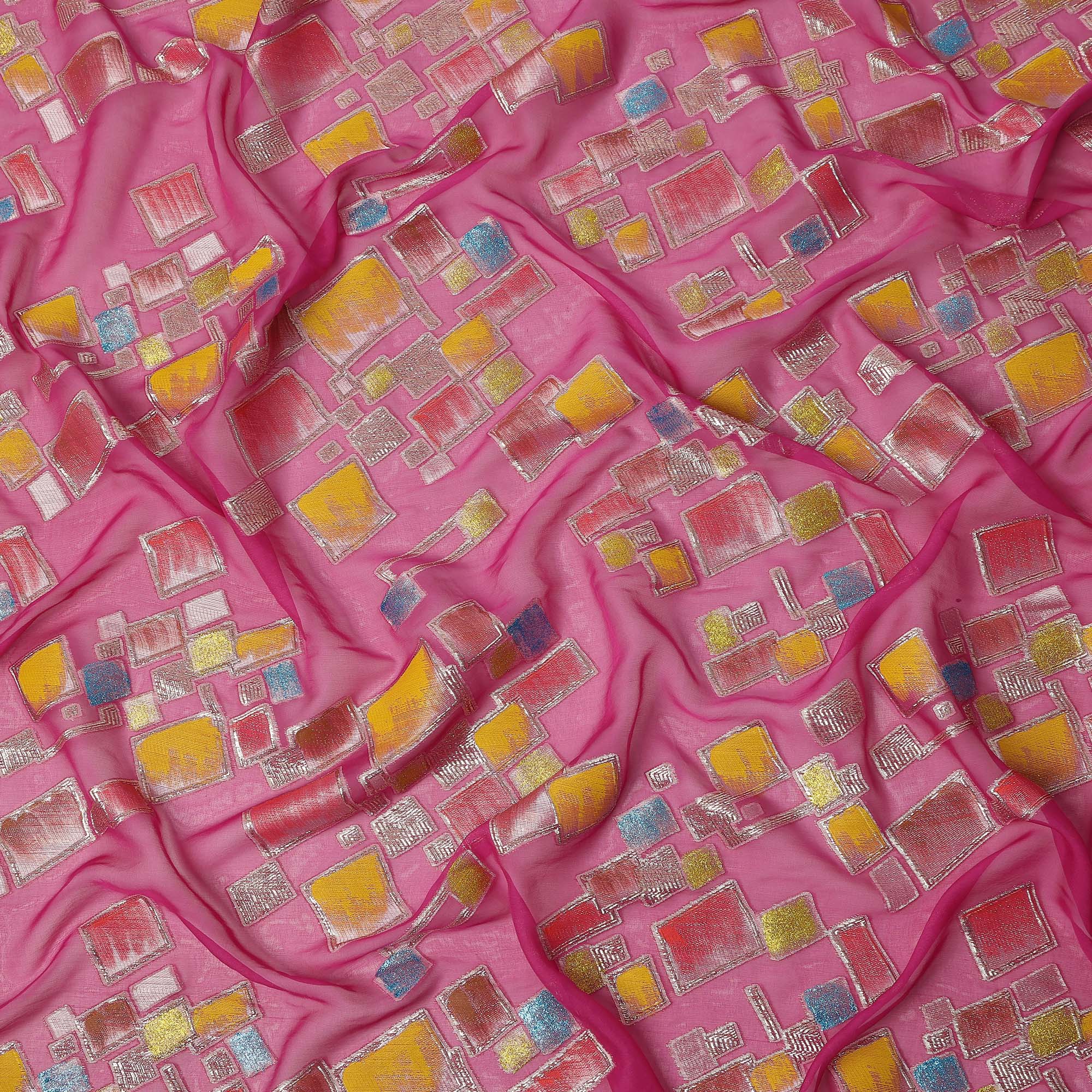 Premium hot pink pure silk chiffon fabric with multicolor metallic geometric hand print.