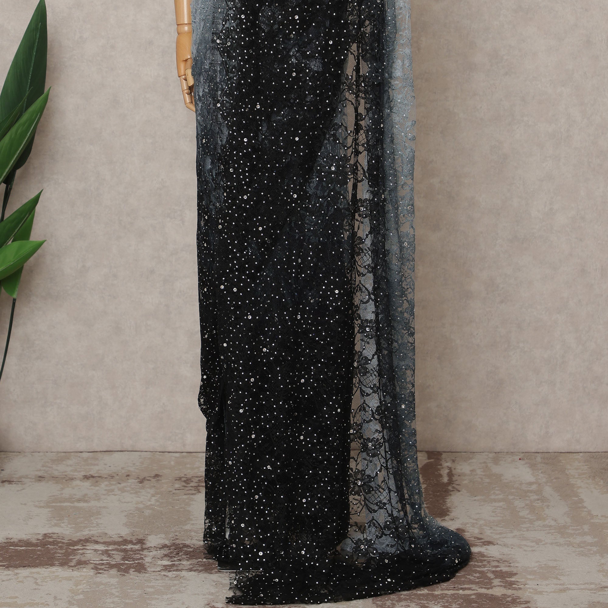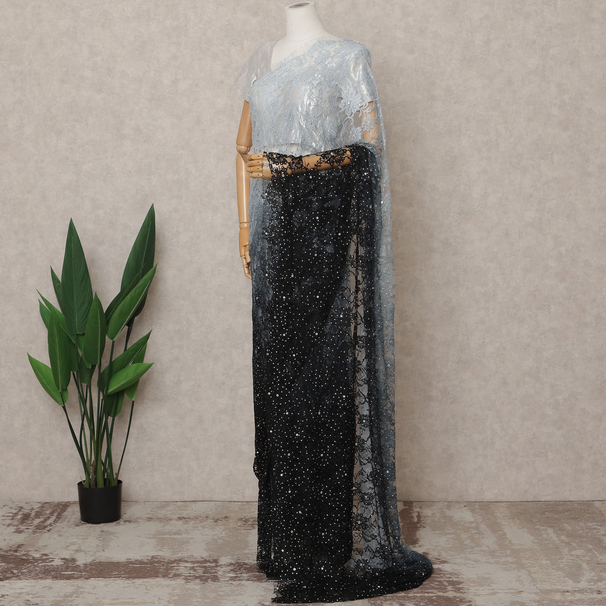 Ice Blue Black Premium French Chantilly Ombre Lace Saree Fabric with Stone Work – 5.5 Meters Length, Width 110 Cms, Made in France-D25617