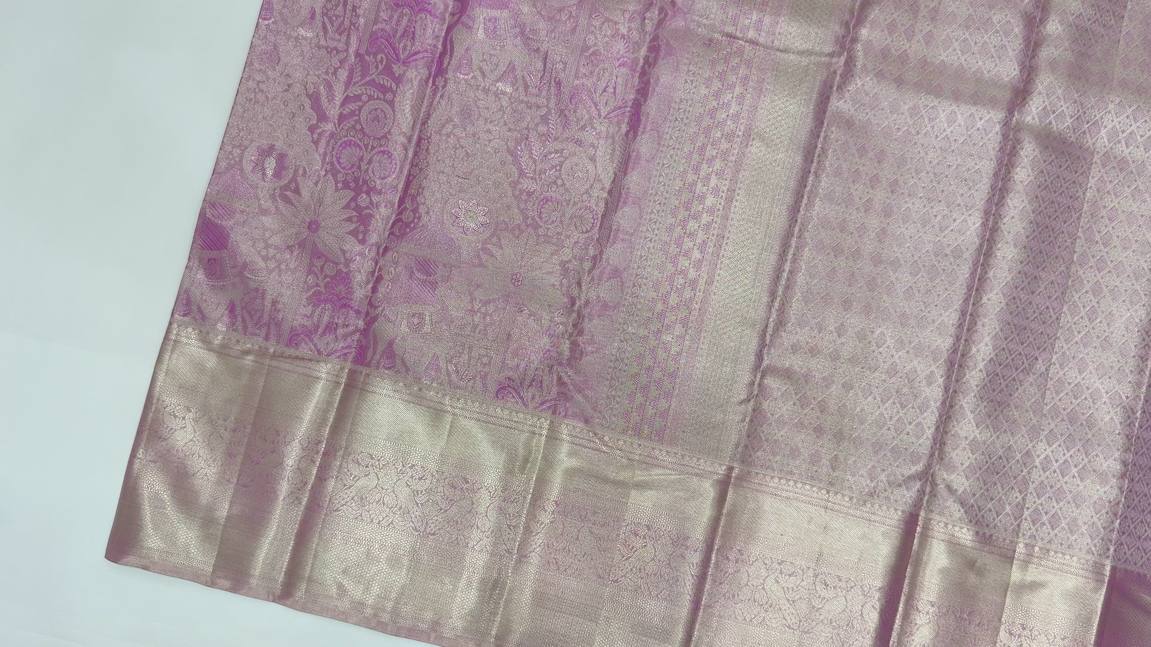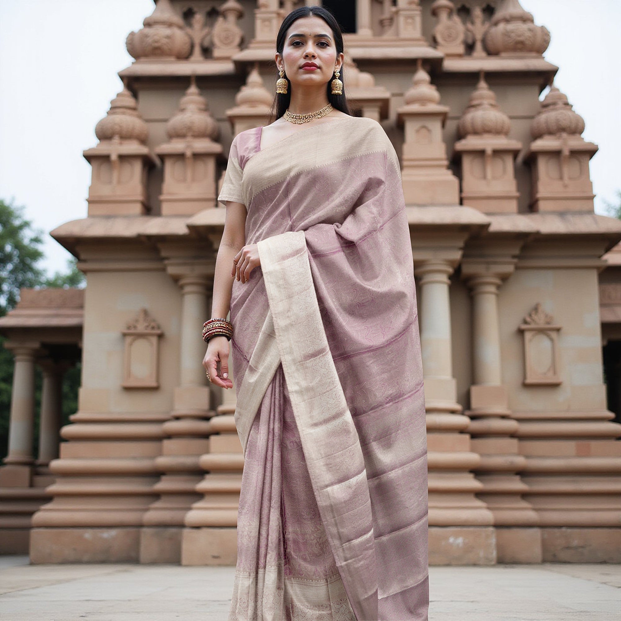 Icy lilac body with mauve undertones and soft zari striped pattern