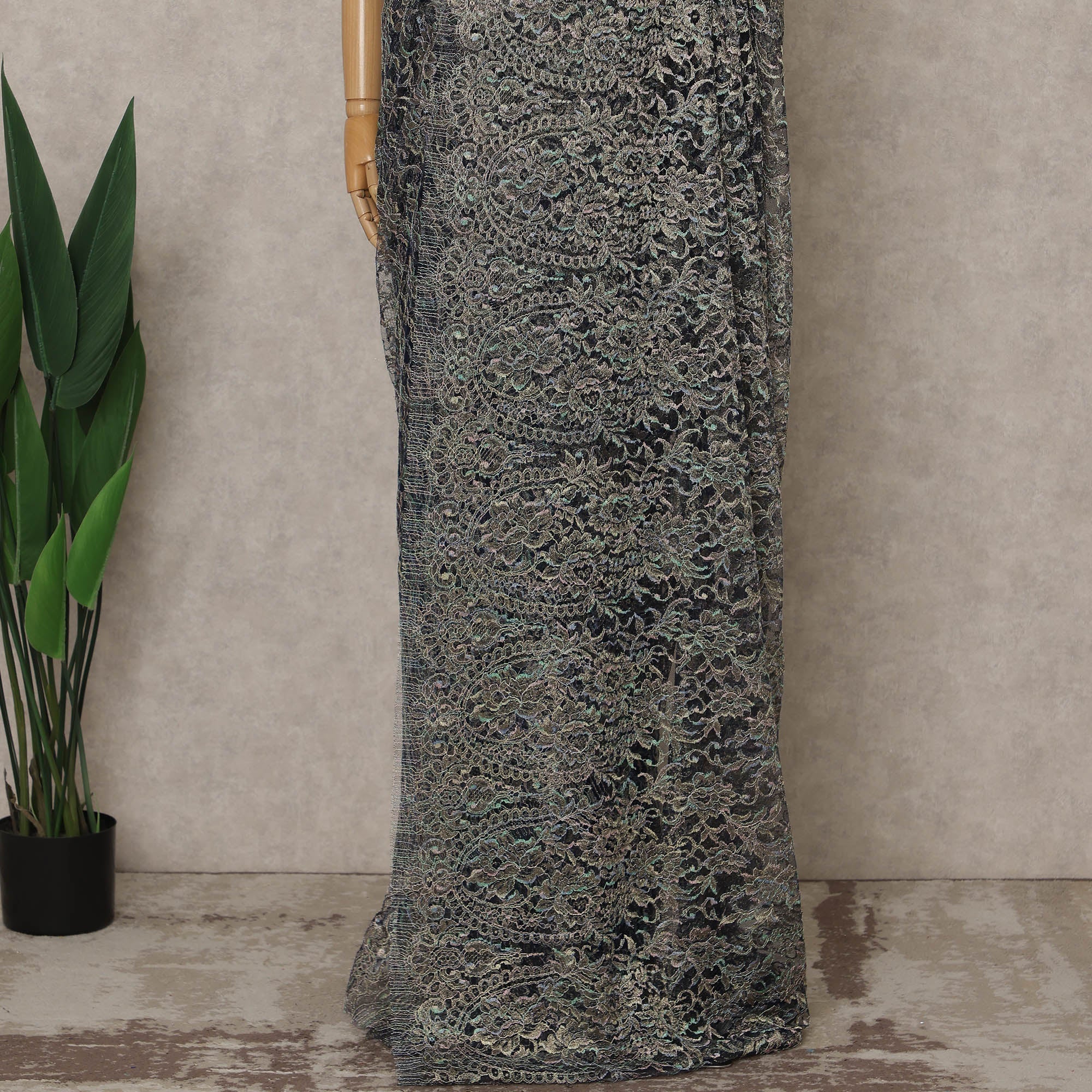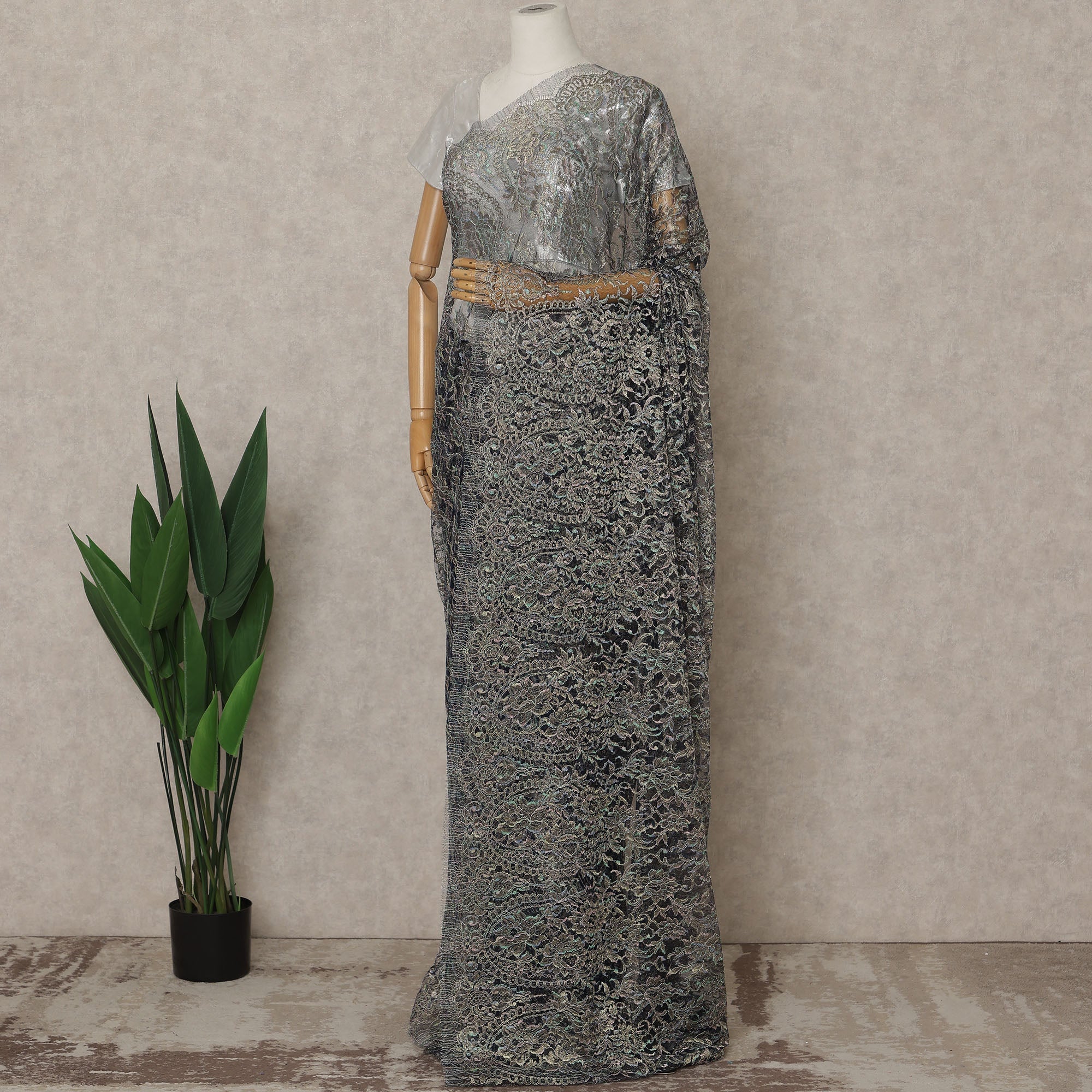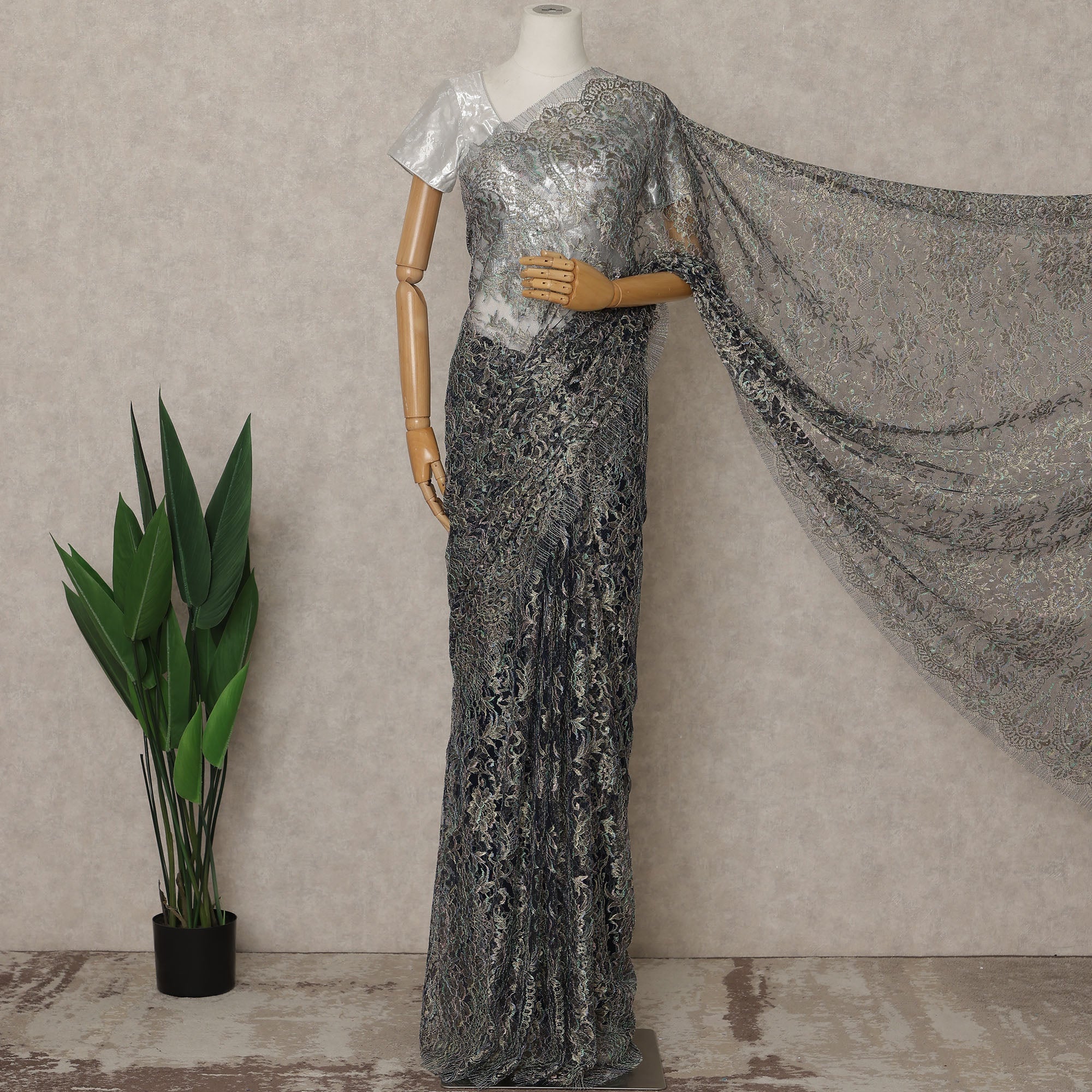 Iridescent Blue Silver Premium French Metallic Chantilly Lace Saree – 5.5 Meters Fabric Length, Width 110 cm, Imported from France & Blouse Not Included-D26569
