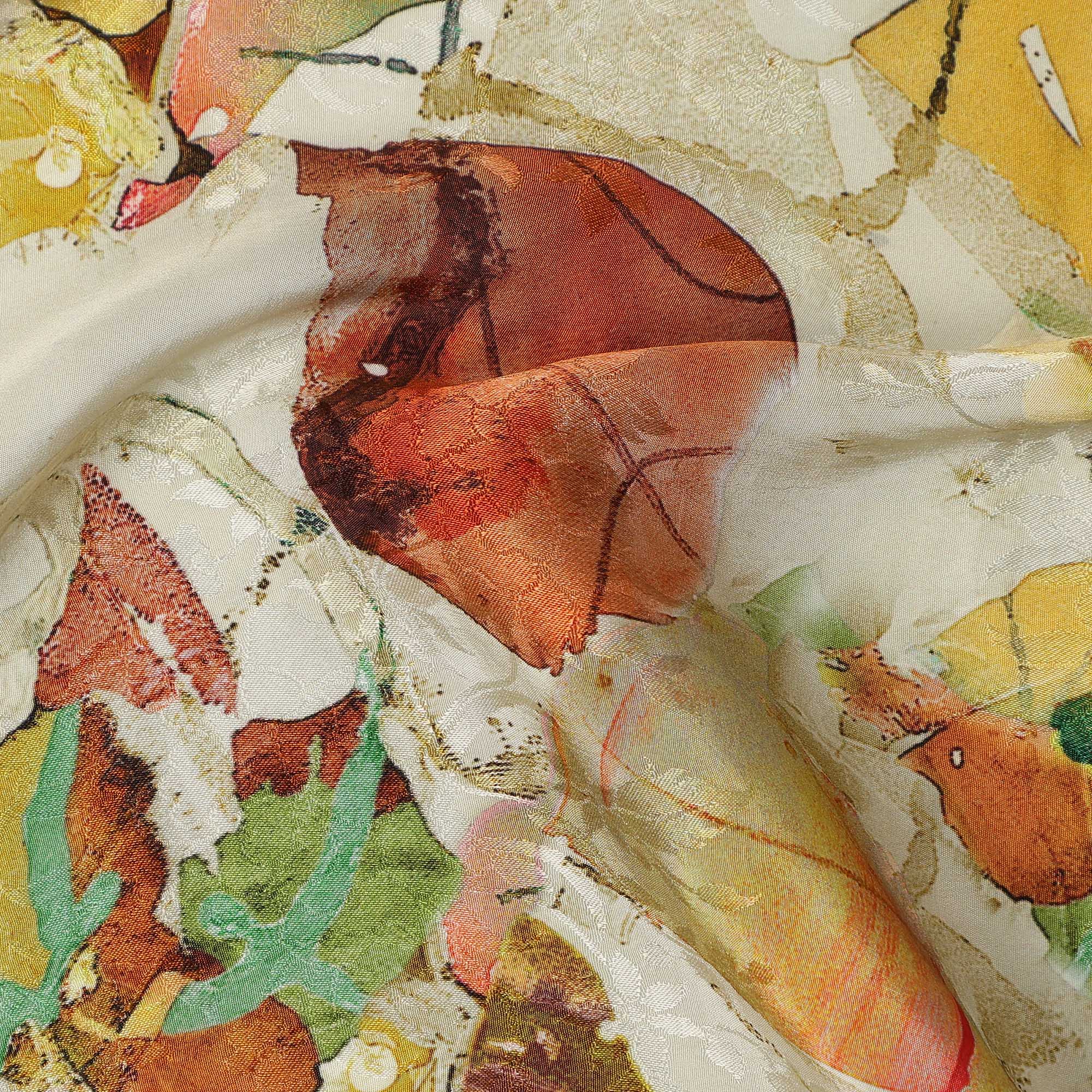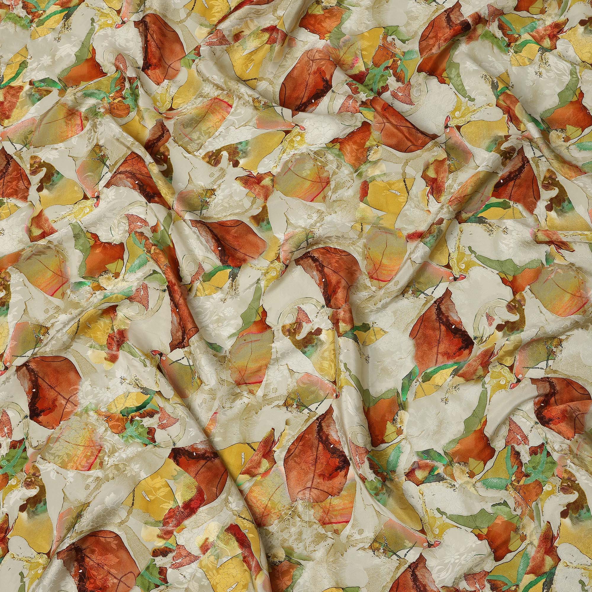 Ivory Abstract Leaf Printed Viscose Modal Satin Fabric, 110 Cms, India-D26888