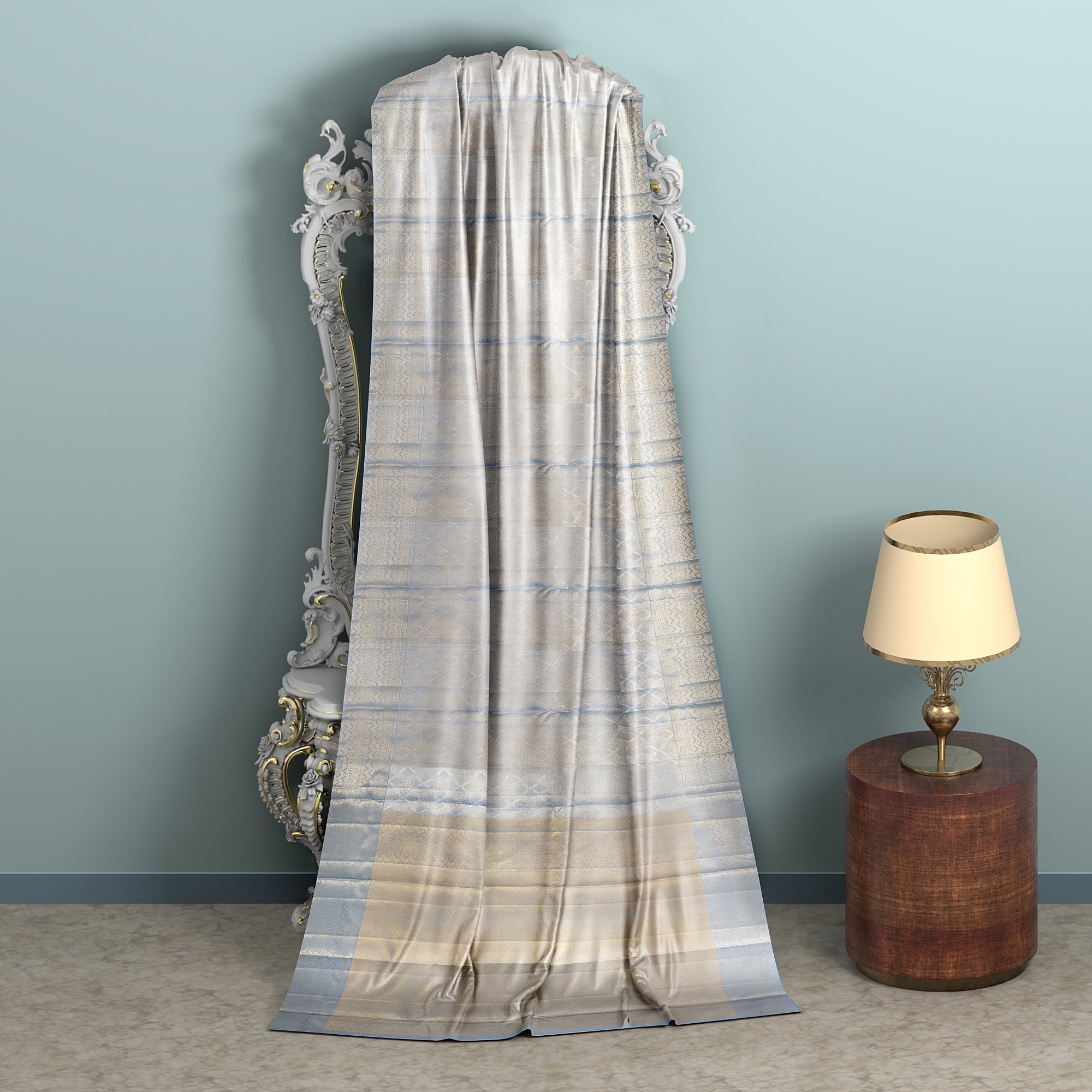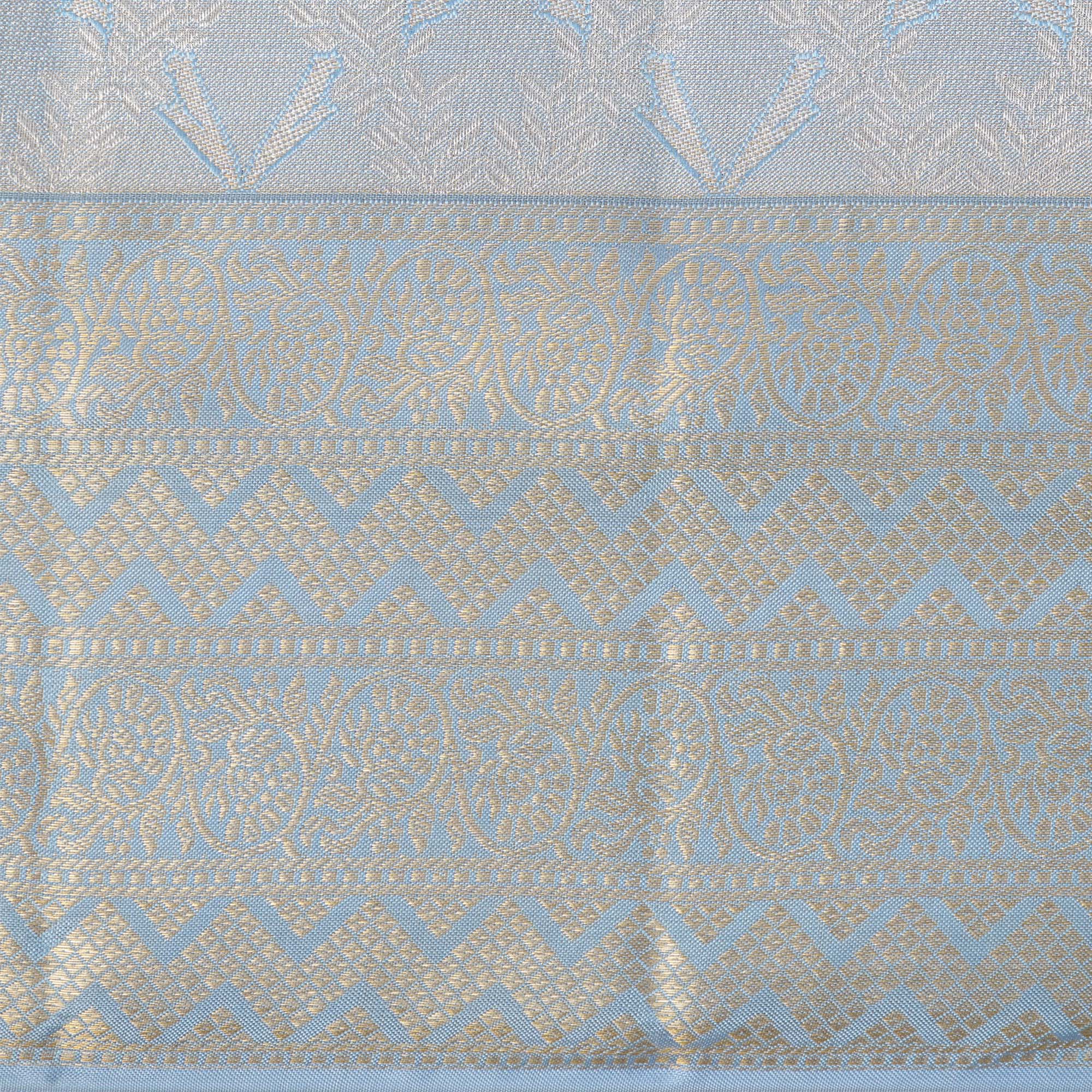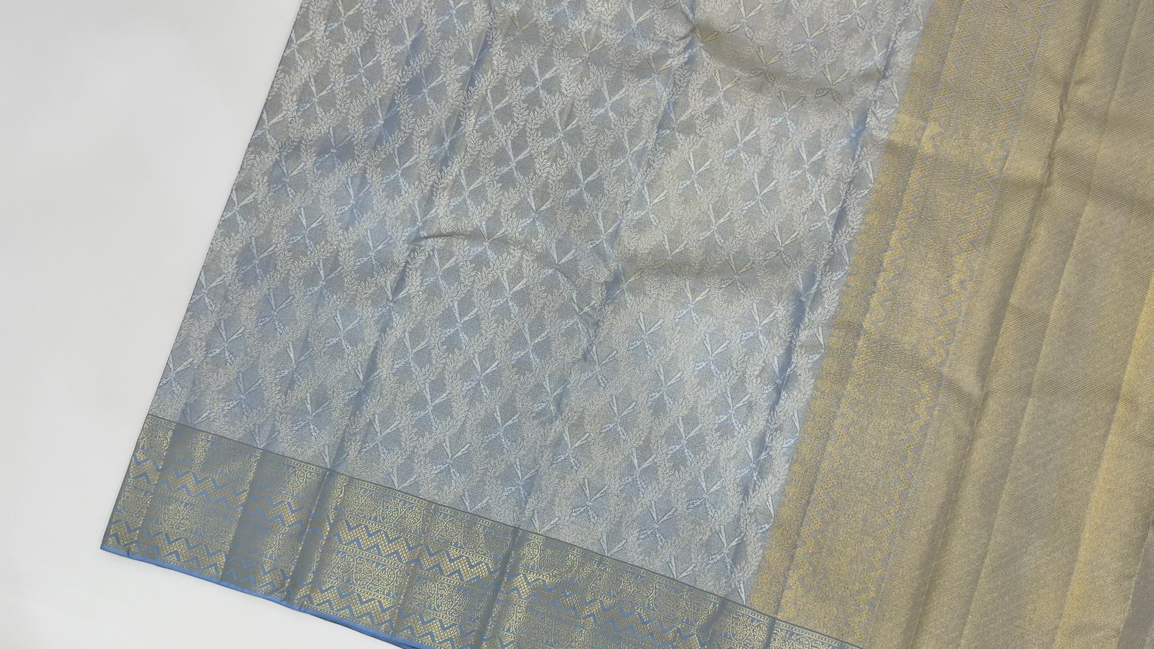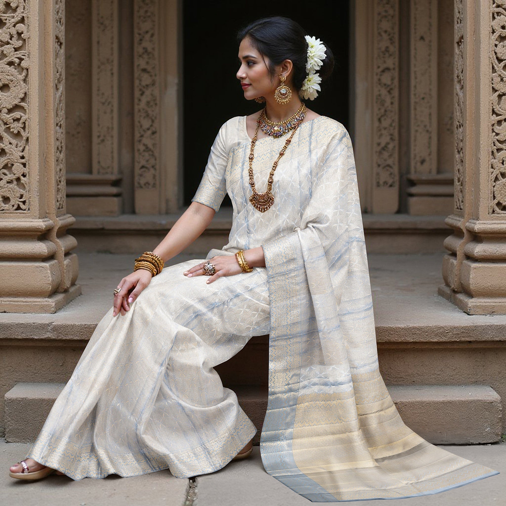 This Ivory and Blue Pure Silk Kanjeevaram Saree is a delicate expression of woven tradition, where every motif speaks the silent language of heritage. Handcrafted from the finest Regal Fabrics silk, the saree features subtle floral buttis spread across an ivory base, interlaced with faint blue highlights that resemble the gentle brushstrokes of a mural painting. The broad golden zari border adds a regal contrast, anchoring the softness of the body with richness and depth. Woven over 48 hours by expert South Indian artisans, each saree reflects the soul of timeless craftsmanship, passed down through generations. The interplay of ivory, blue, and gold makes it perfect for weddings, temple ceremonies, and elegant festivities. Each fold tells a story of grace, patience, and celebration. Shop online to own this handcrafted masterpiece. Dry clean only to preserve the fabric's finesse and traditional detailing.