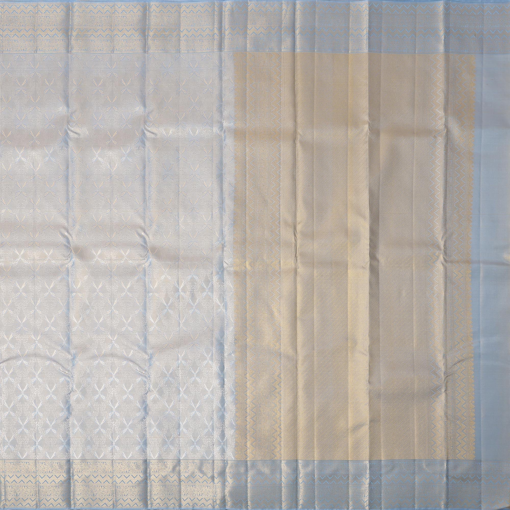 Ivory and Blue Pure Silk Kanjeevaram Saree with Handwoven Floral Butti and Golden Zari Border, 5.5 Meters with Blouse Piece, Originating from India-D22706