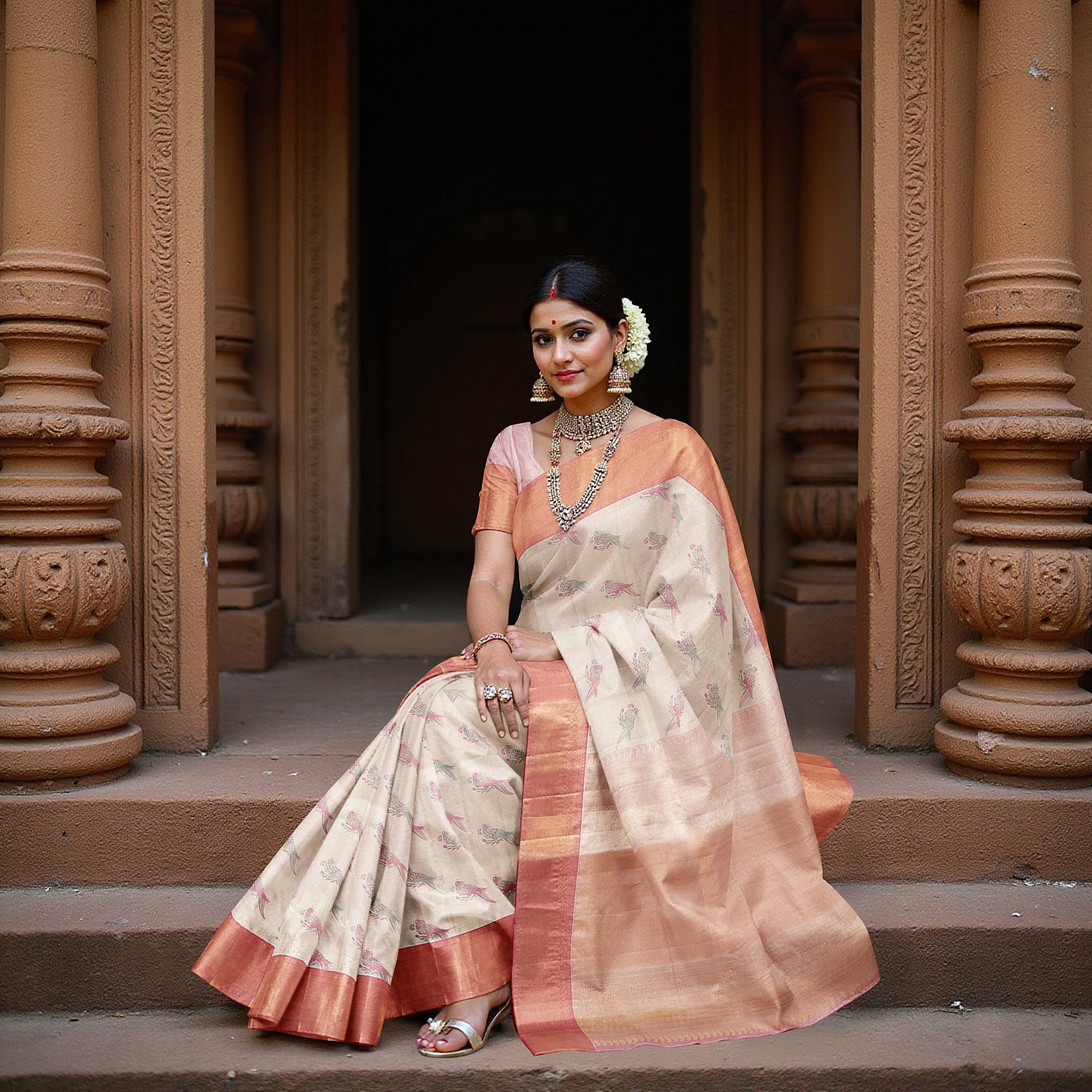 Immerse yourself in the poetic charm of this Ivory and Peach Pure Silk Kanjeevaram Saree, where tradition dances through every weave. Crafted from luxurious Regal Fabrics silk and brought to life by the skilled hands of South Indian weavers, this saree features soft floral motifs gently blooming across a serene ivory backdrop. The elegant peach borders shimmer with a golden undertone, giving the entire drape a subtle yet regal glow. Each saree takes over 72 hours of intense, detailed craftsmanship, making it not just an outfit but a story of heritage and patience woven into silk. The floral artwork mirrors age-old murals, transforming every pleat into a canvas of grace. Designed for those who appreciate art in every thread, this saree is perfect for ceremonies, festive occasions, and graceful evenings. Shop online to own this handcrafted legacy. Dry clean only to preserve its fine texture and intricate detailing.