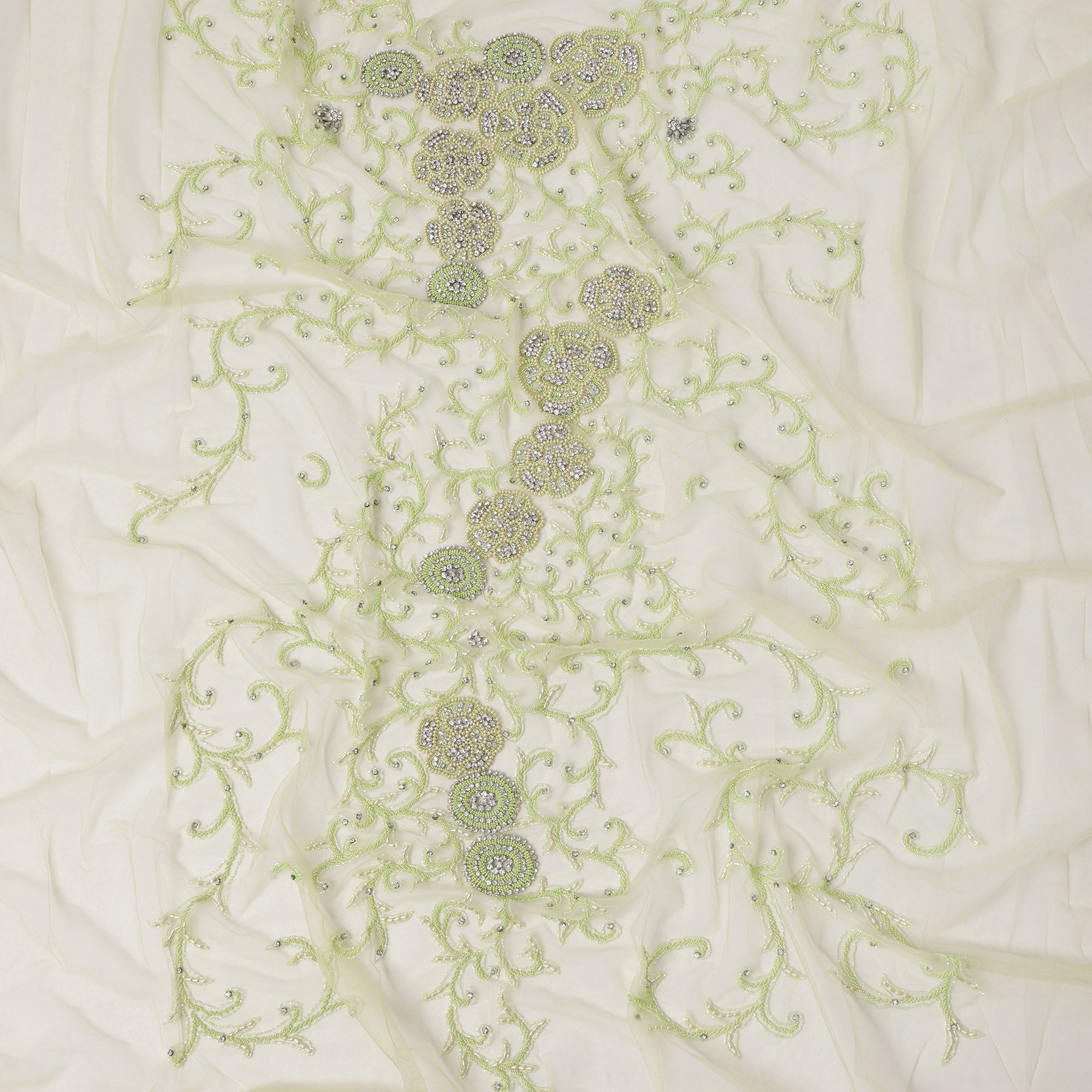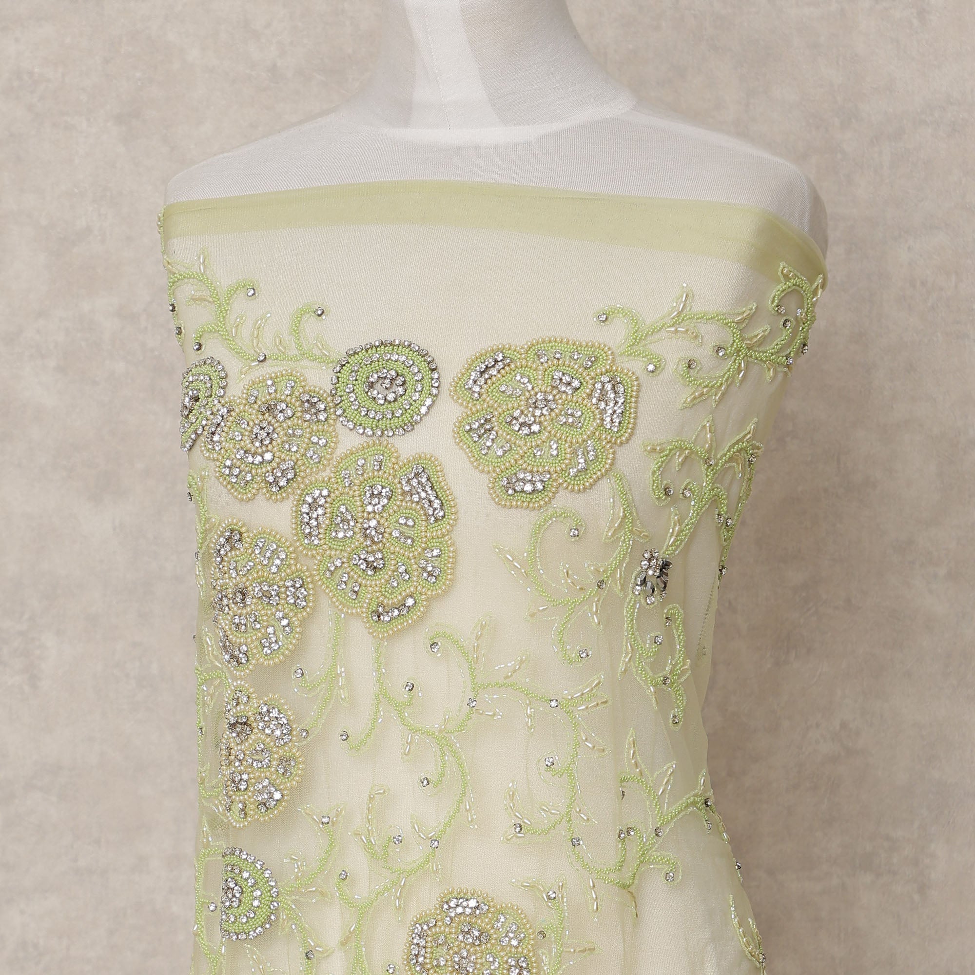 This ivory nylon tulle fabric is delicately adorned with pistachio green floral embroidery, highlighted by shimmering sequins and intricate threadwork... Read more Read more