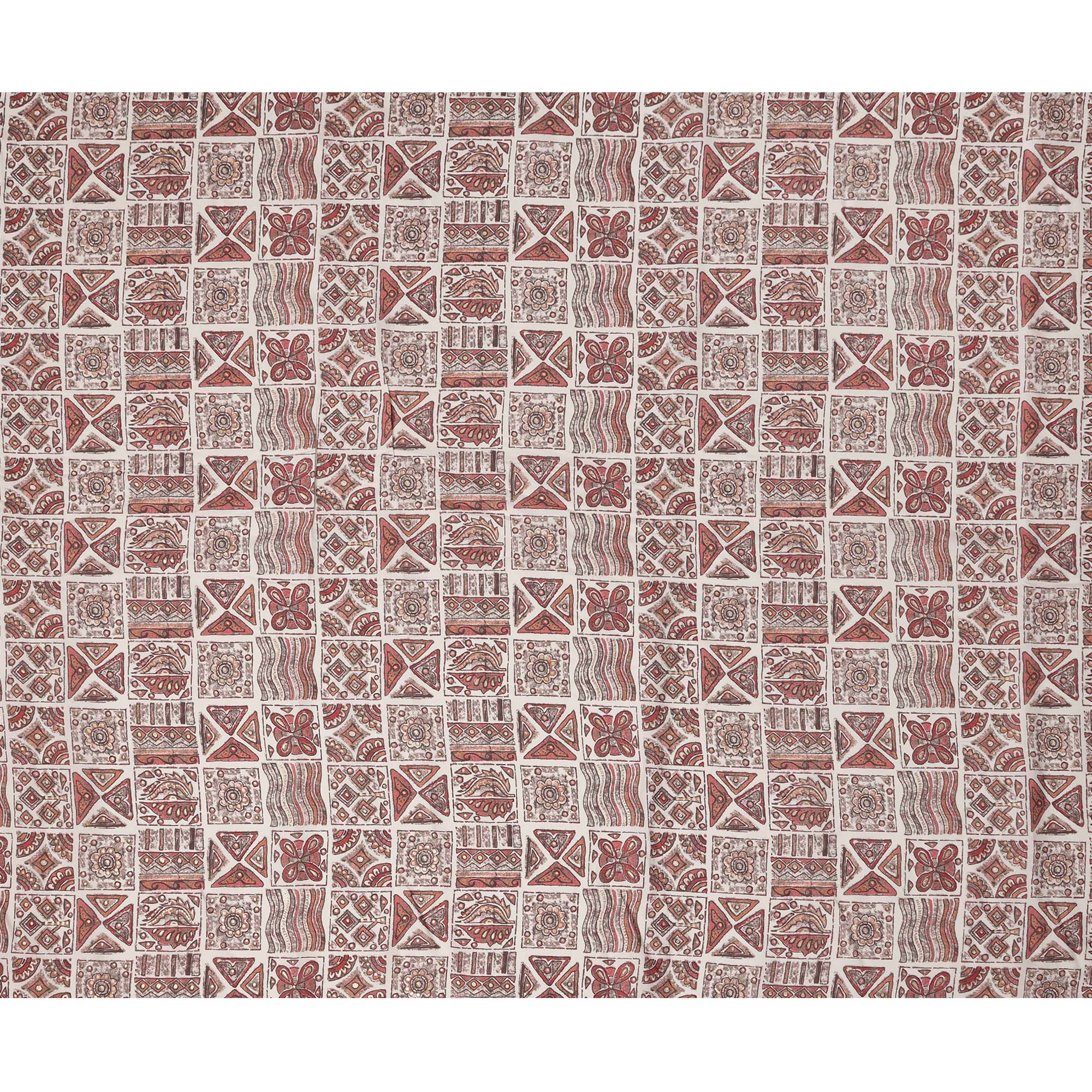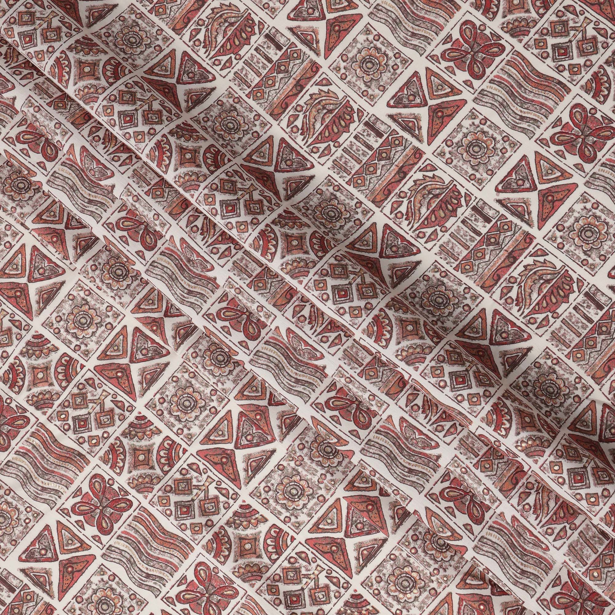 Ivory and Rust Ethnic Block Printed Blended Viscose Fabric with Tribal Motifs in Geometric Grid Layout, 110 Cms Width, Made in India-D22824