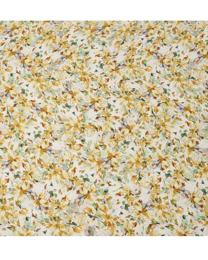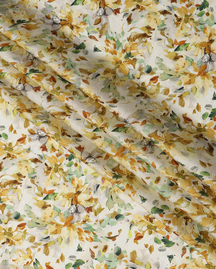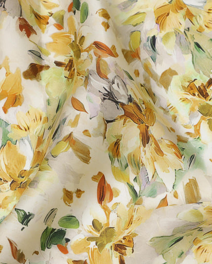 Bring a touch of elegance to your designs with this ivory and yellow floral synthetic satin fabric, featuring a stunning watercolor-inspired floral pattern in shades of yellow, green, and orange on a soft ivory background. The 110 cm wide fabric has a smooth, glossy texture that drapes beautifully, making it ideal for stylish dresses, scarves, blouses, and decorative home accents. Its lightweight and breathable quality ensures comfort while maintaining durability and a refined sheen. Whether used for fashionable outfits or creative décor projects, this premium satin fabric offers versatility, sophistication, and a flawless finish.