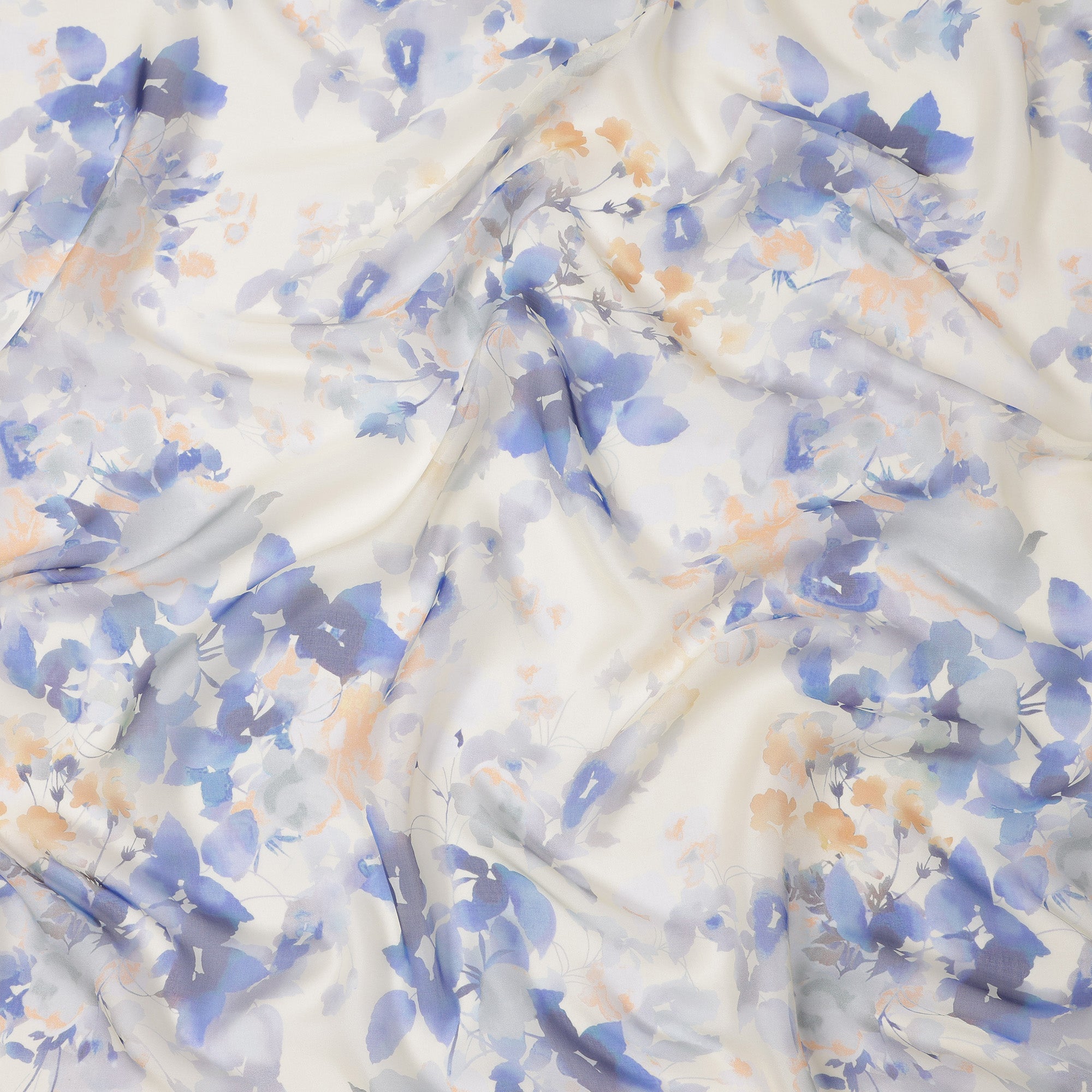 Ivory Base Lavender Blue Floral Mist Printed Pure Silk Chiffon Fabric, 110 Cms Width, Made in South Korea-D24016