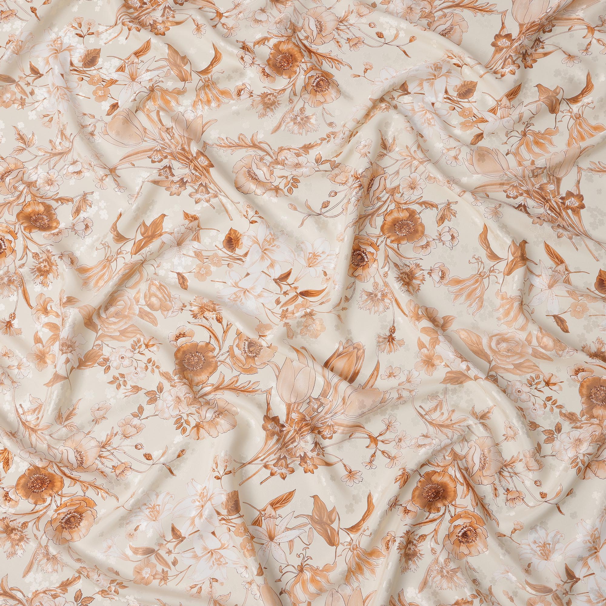 Ivory Base with Sepia & Beige Vintage Floral Print Premium Italian Pure Silk Satin Fabric, 140 Cms Width, Made in Italy-D22997