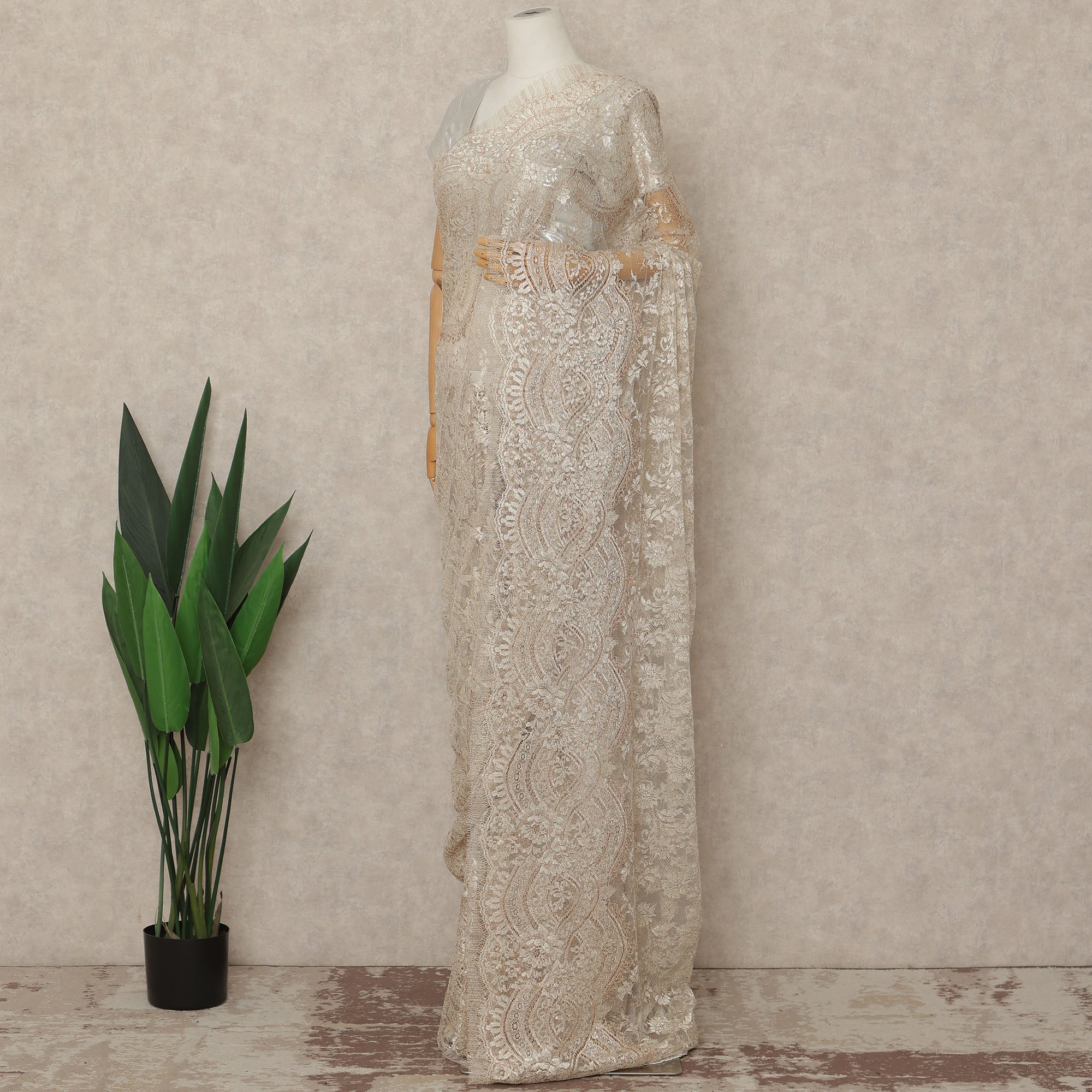 Ivory Beige Premium French Metallic Chantilly Saree Lace Fabric 110 Cms Width 5.5 Meters Piece Elegant Floral Net Lace From France For Designer Sarees And Couture Draping-D27677