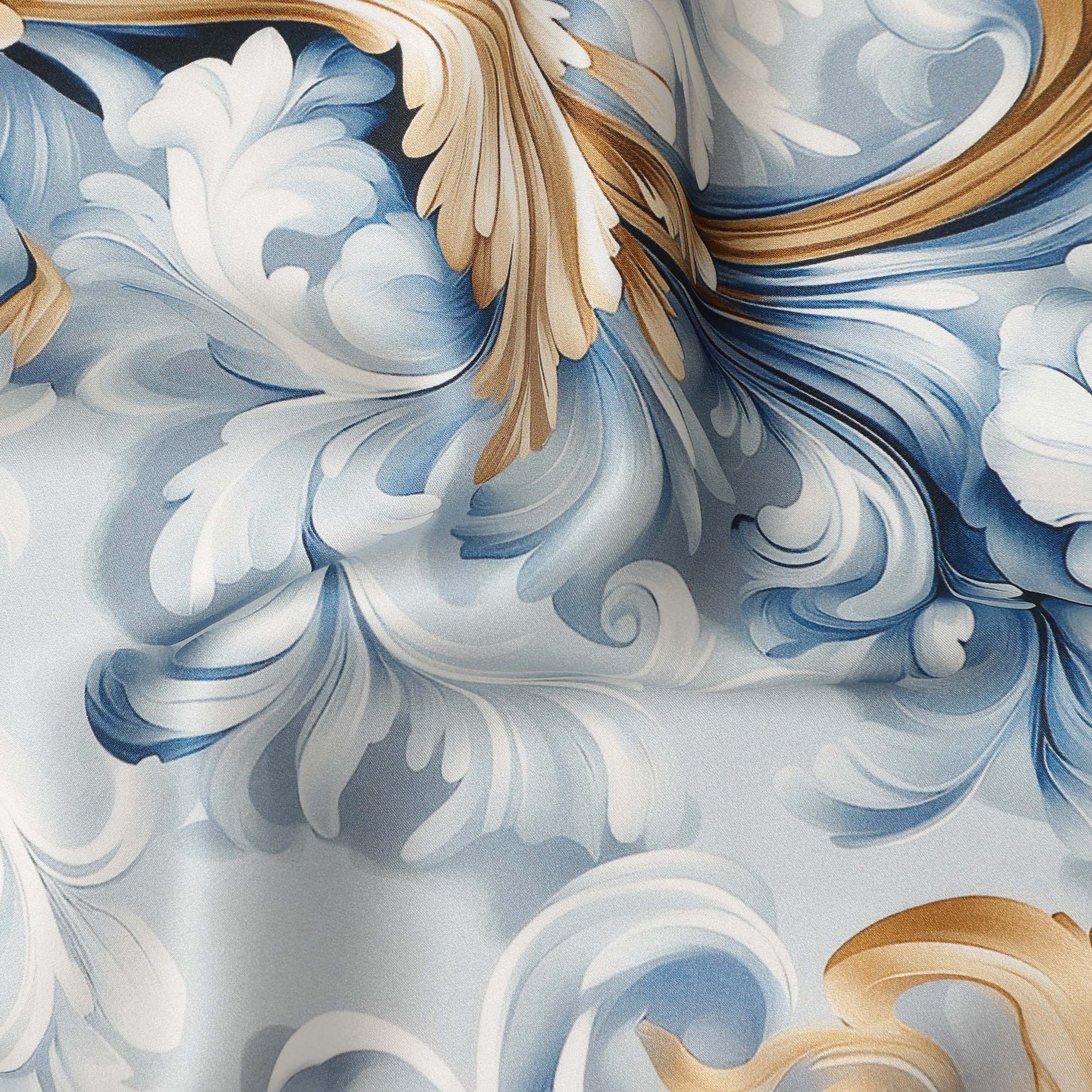 Ivory Blue Baroque Floral Scroll Print Premium Pure Silk Satin Fabric Elegant Designer Finish 140 Cms Width, 3.5 Mtrs Piece and Made in Italy-D27210