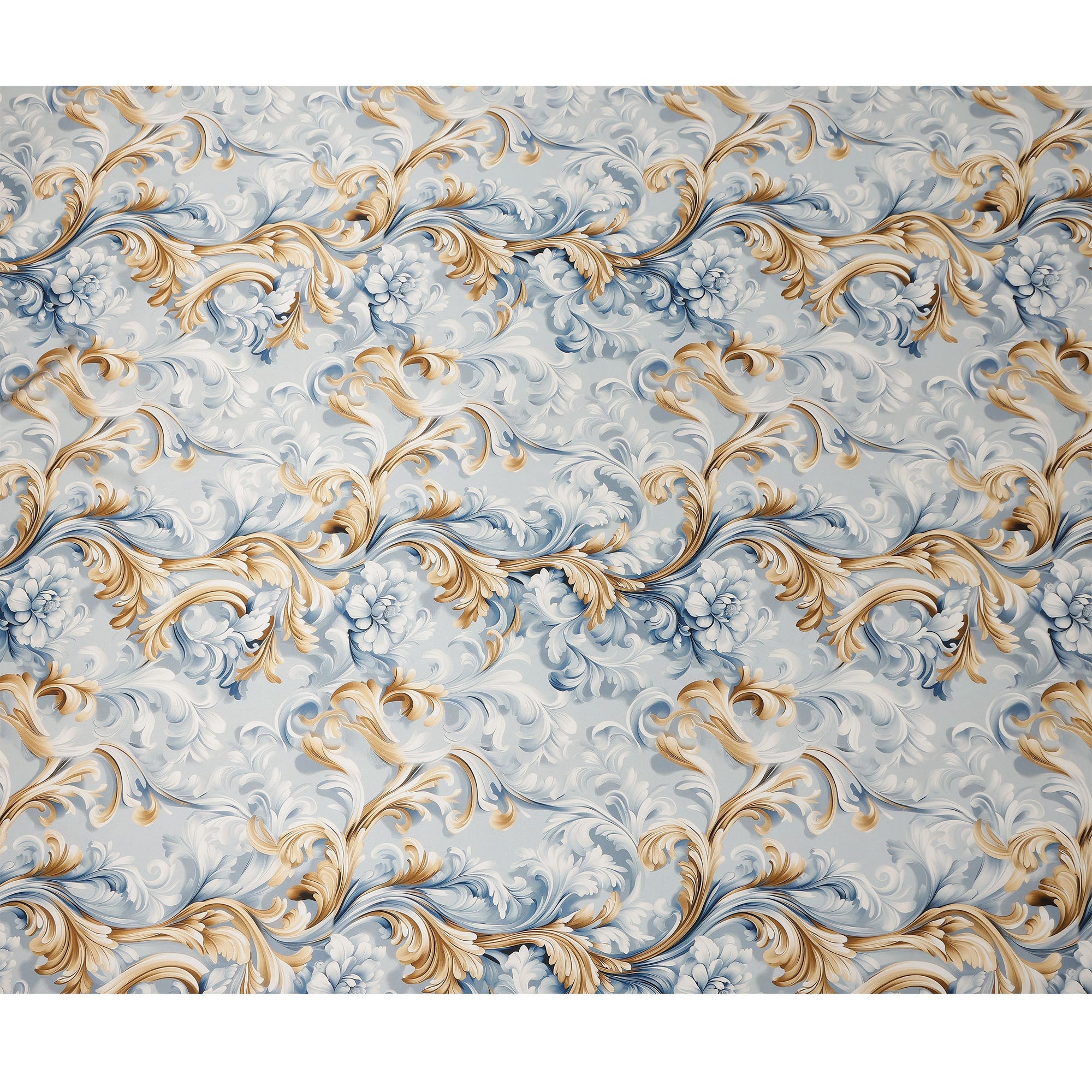 Ivory base with blue and gold baroque floral scroll print adds an elegant designer look.