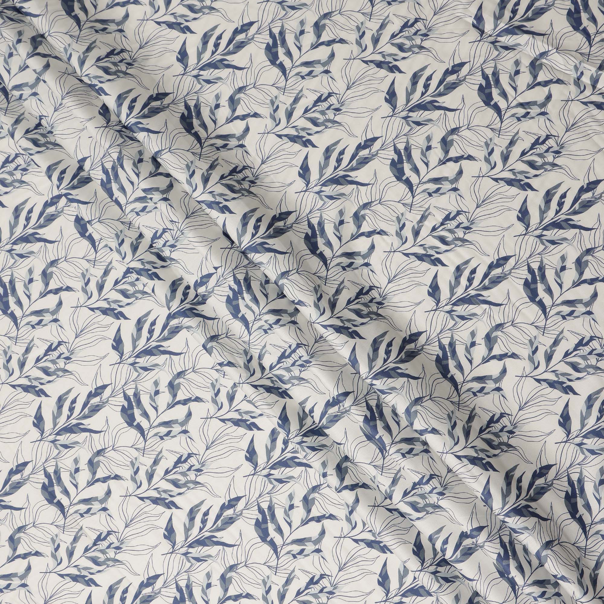 Ivory Blue Leaf Print Cotton Satin Fabric 110 Cms Made In India-D27395