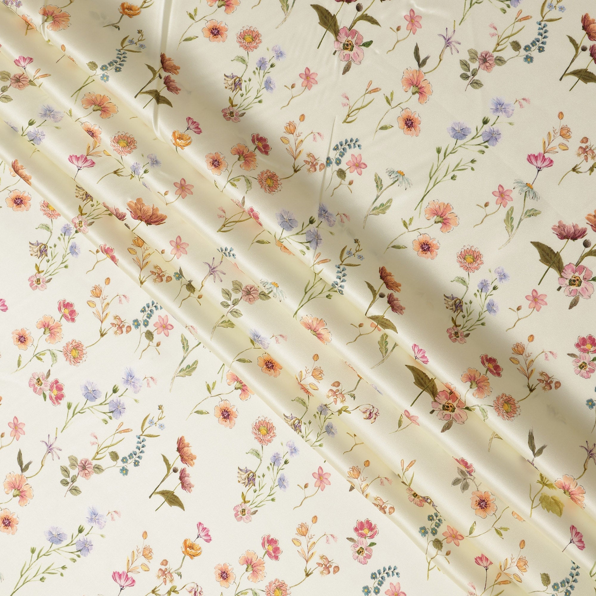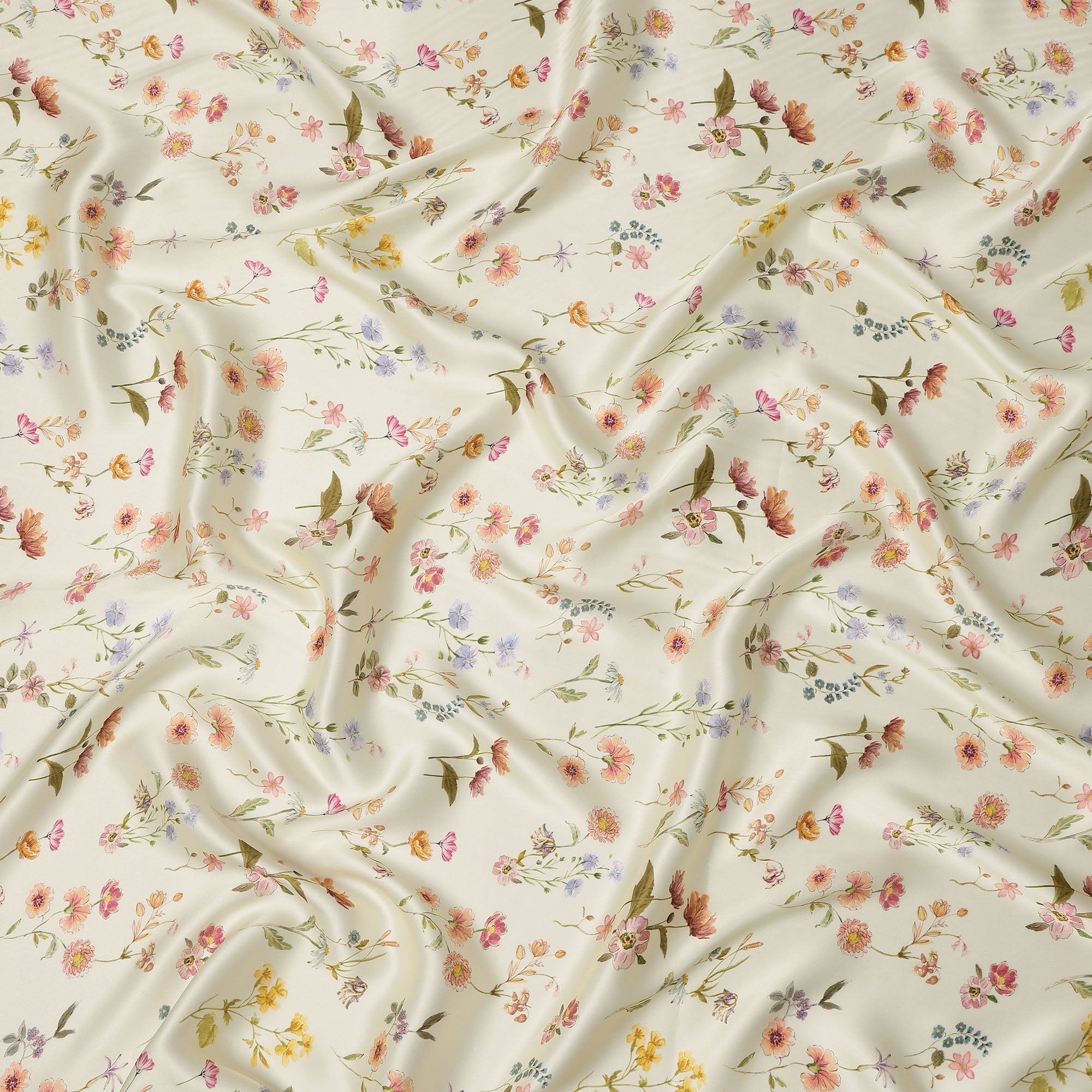 Ivory Cream Delicate Floral Allover Printed Premium Pure Silk Satin Fabric, 110 Cms, India-D27085